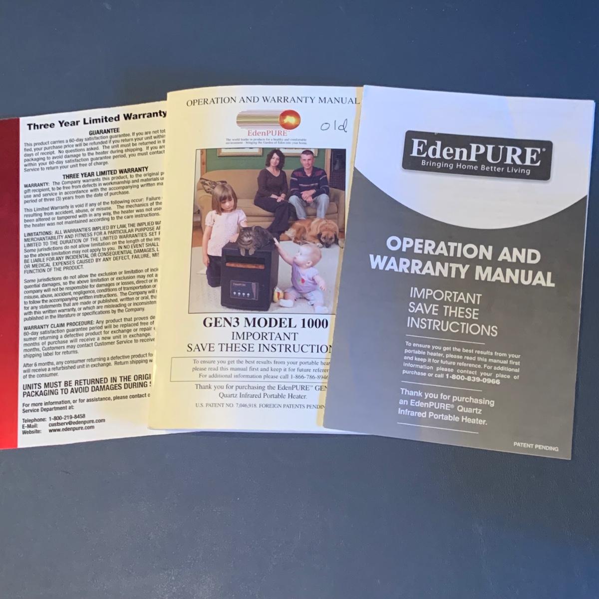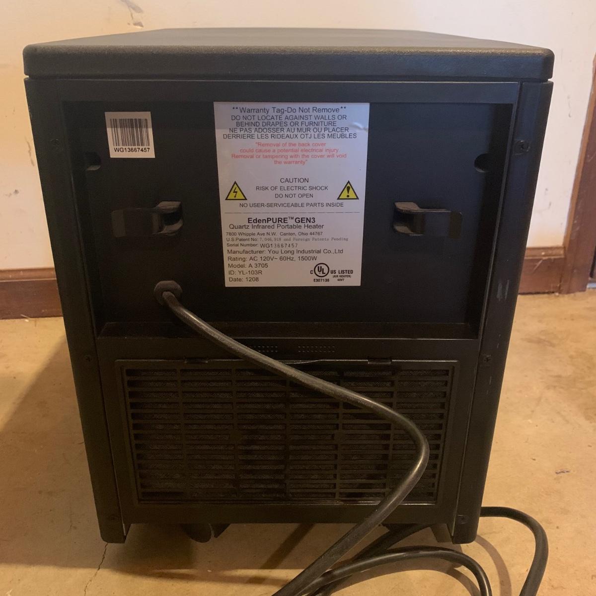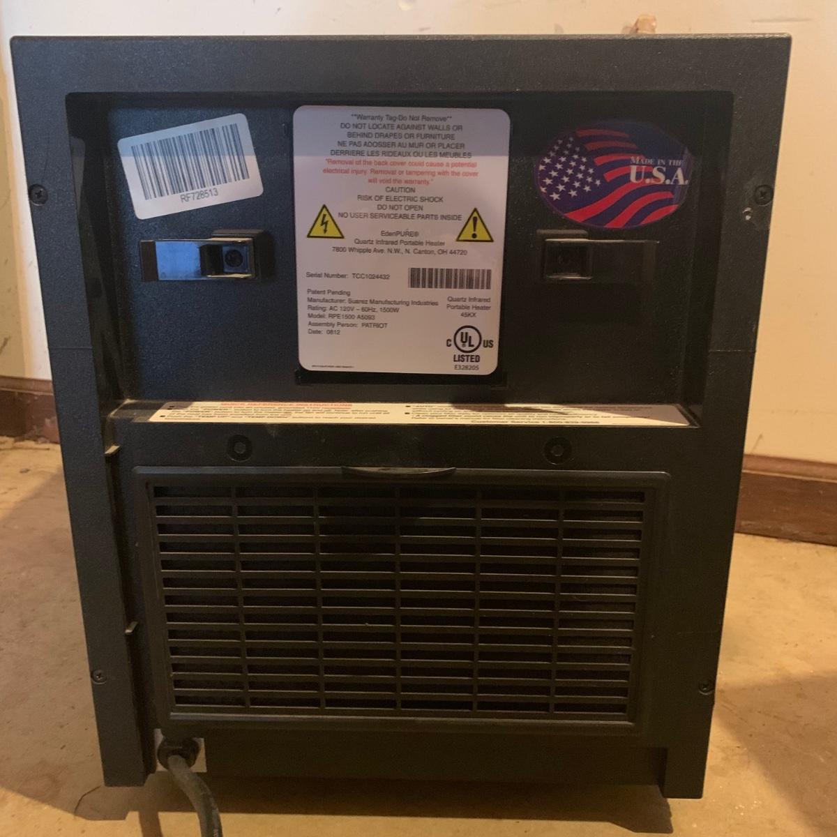 A pair of EdenPure brand quartz infrared portable heaters with original receipts and operation manual. They are different models and slightly different sizes, but both are approximately 13” x 19” x 17”H. Both units powered on when plugged in. They come on casters and are easy to move.
