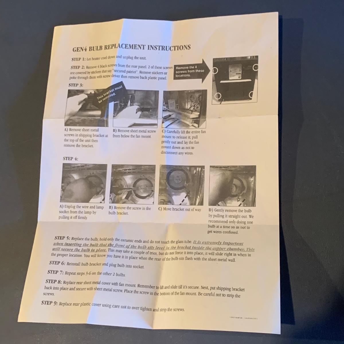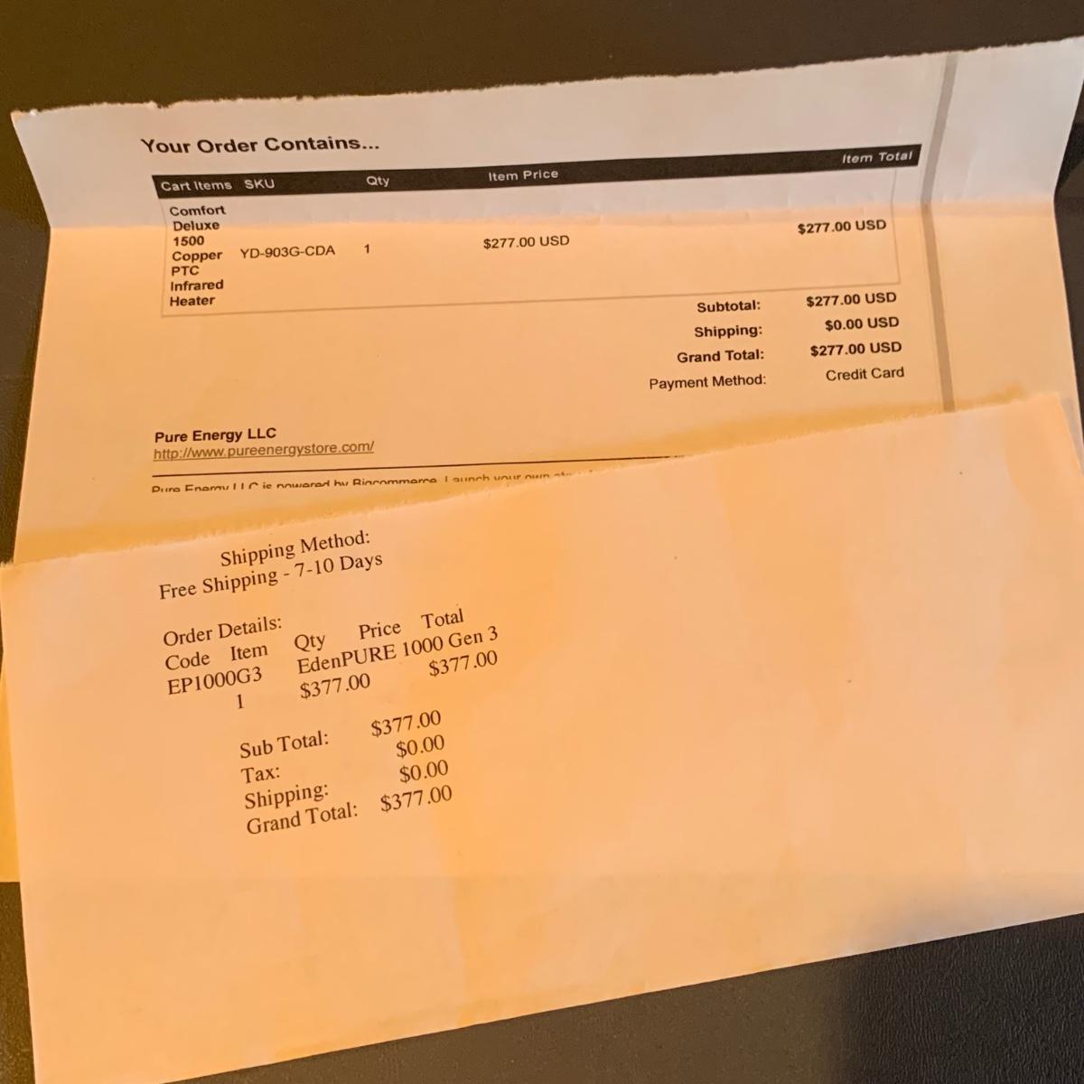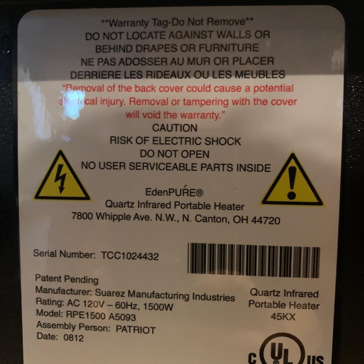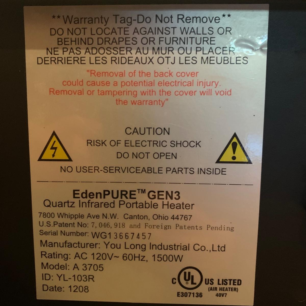 A pair of EdenPure brand quartz infrared portable heaters with original receipts and operation manual. They are different models and slightly different sizes, but both are approximately 13” x 19” x 17”H. Both units powered on when plugged in. They come on casters and are easy to move.
