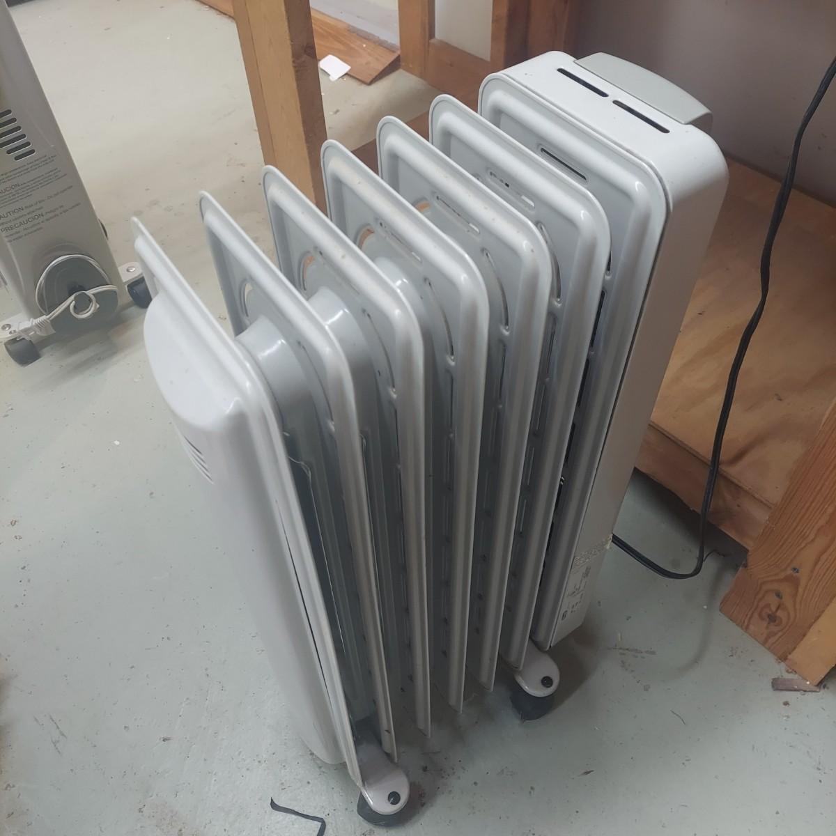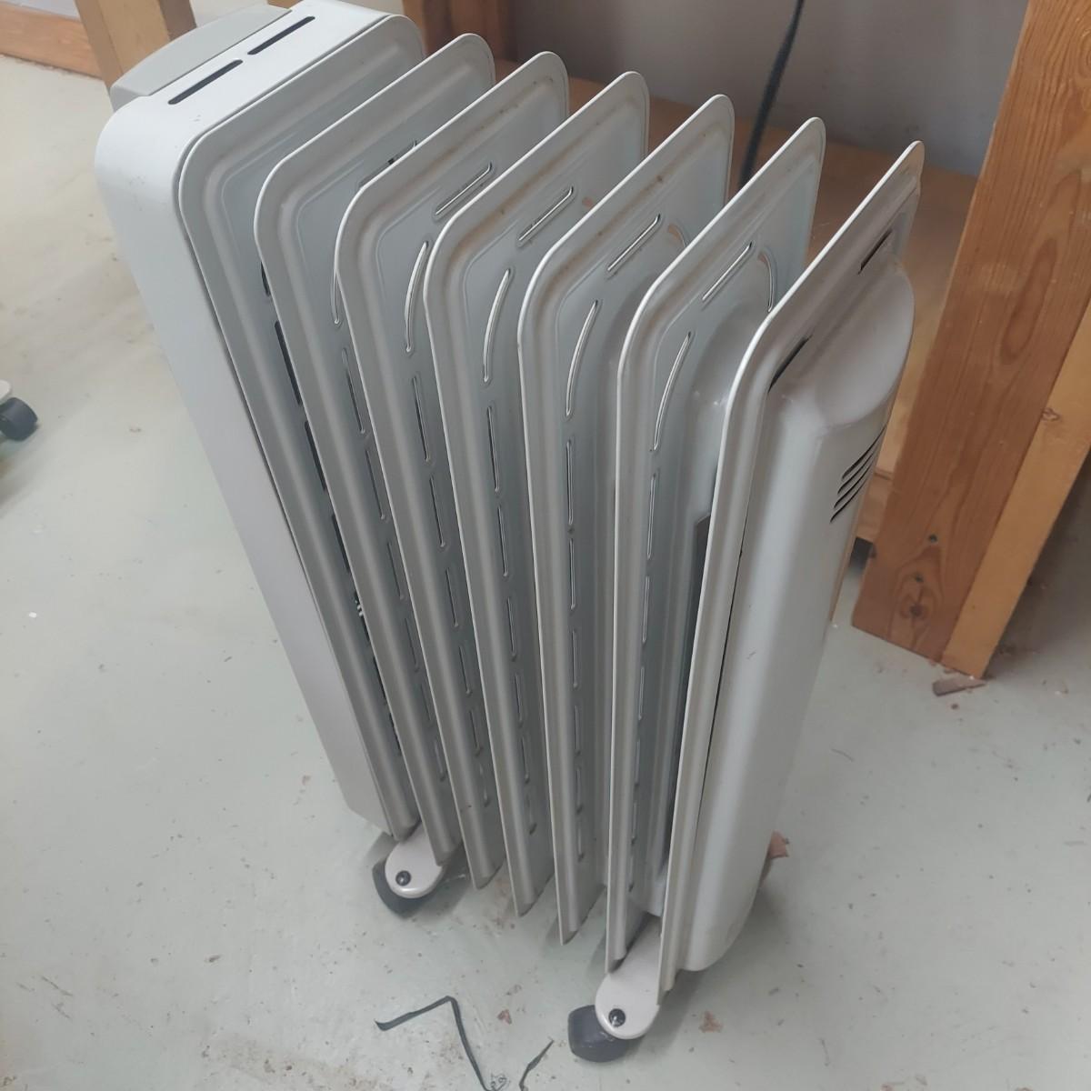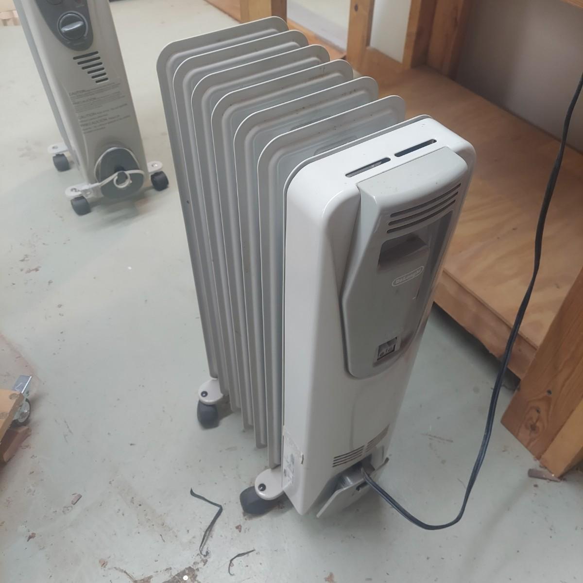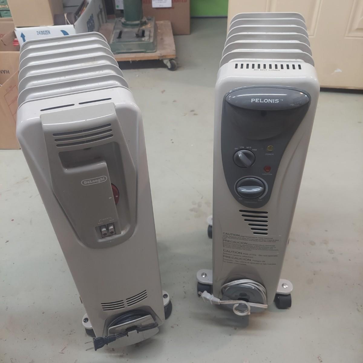 Lot includes two rolling radiator heaters. The Pelonis is oil filled. The DeLonghi is an air type. They are approximately the same size measuring 6" x 14” x 26"H. Please see photos for details. Local Pickup Only