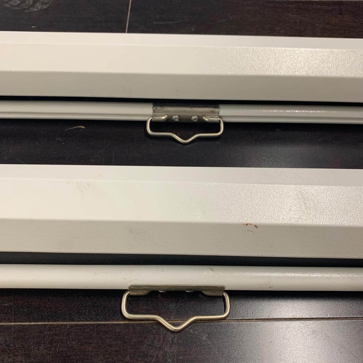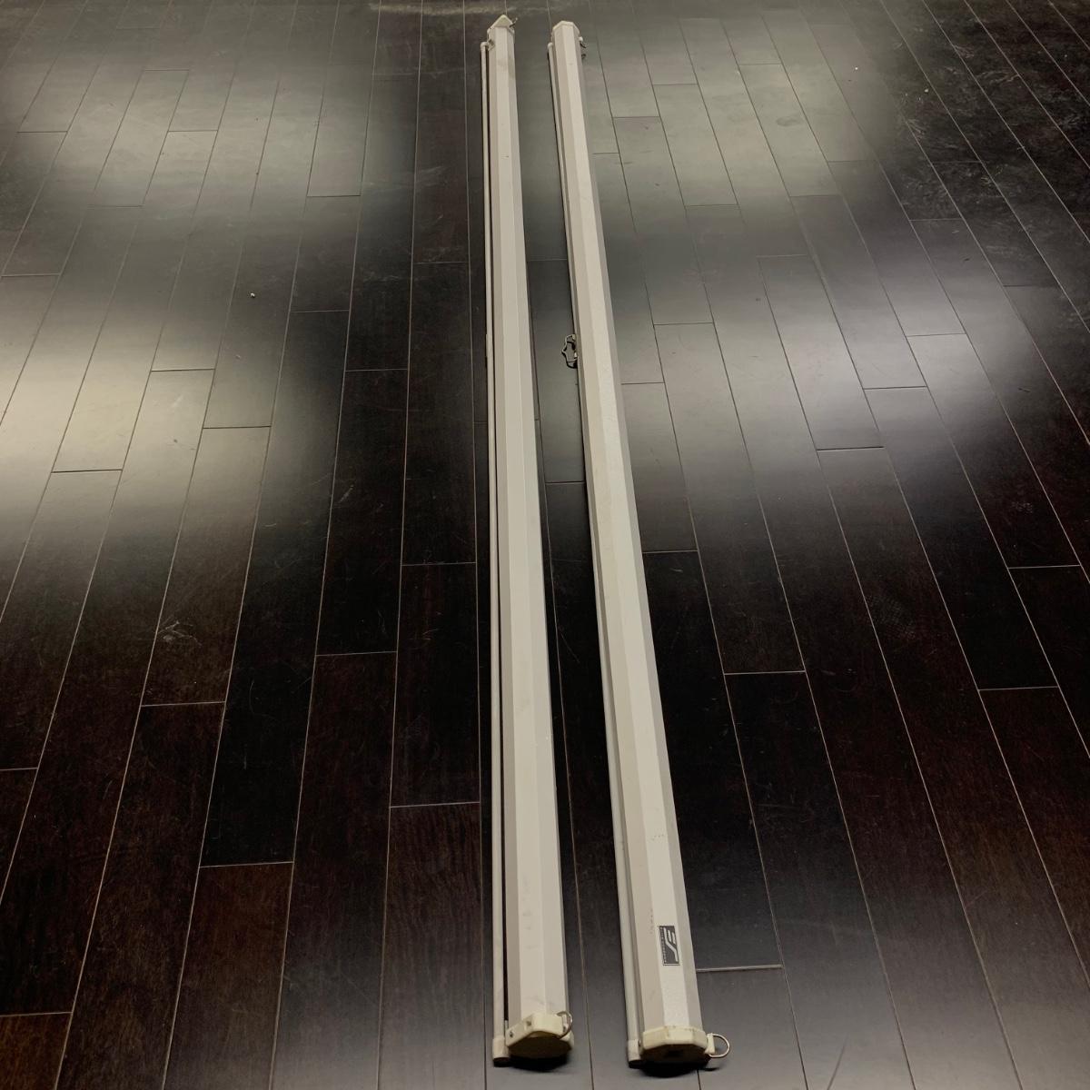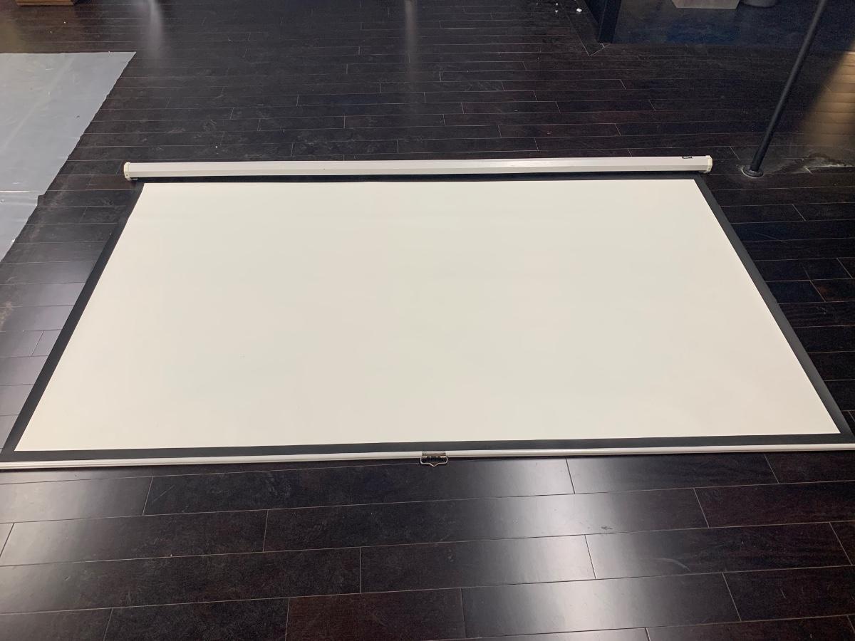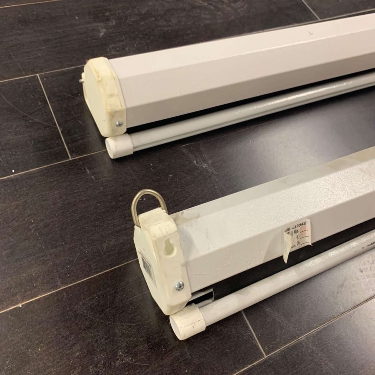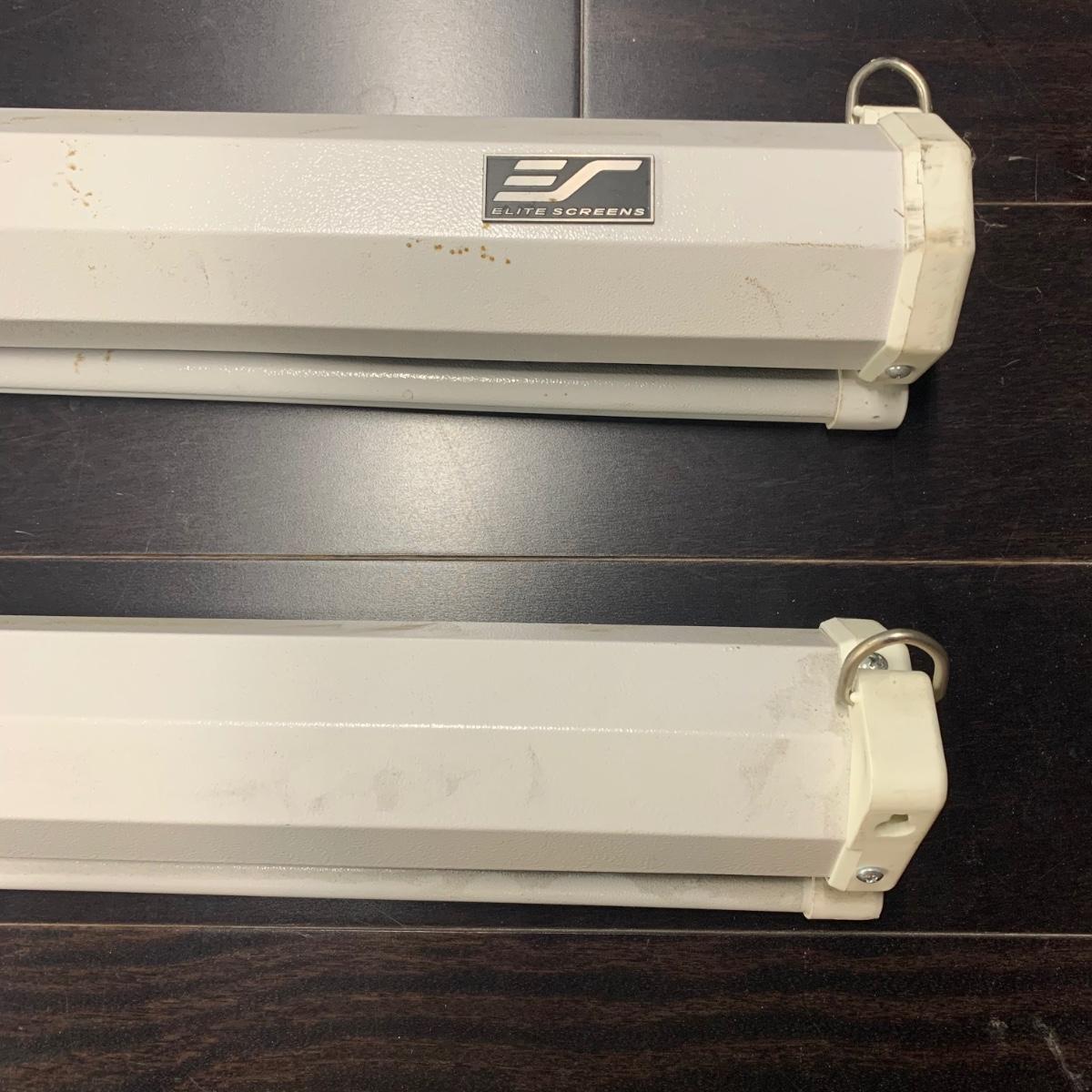 Two Elite Screens brand roll down manual projector screens. Model M120XWH2. They each come in a white metal case that measures approximately 9.5 ft. long. There is hardware attached to each case for hanging on a wall or ceiling. Screen measures 9 ft. x 62”. Screens appear to be in very good condition. Local pickup only.
