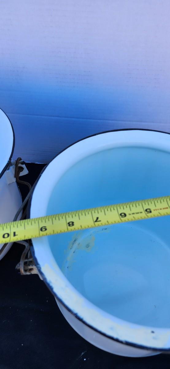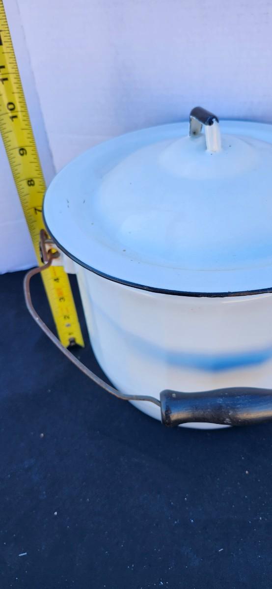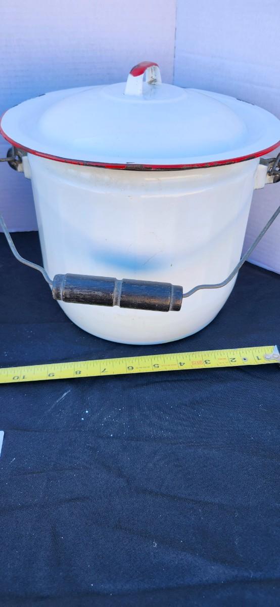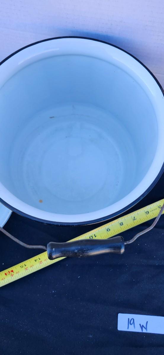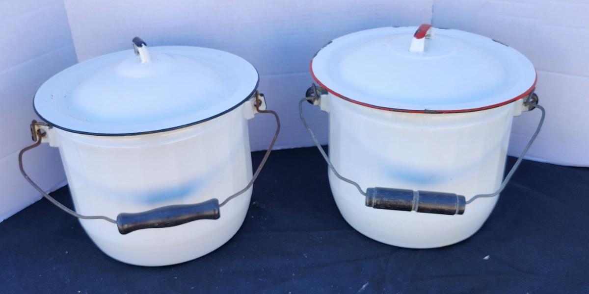Two Enamel Chamber Pot with Lid Vintage White with Black Trim wire Bail Wood Handle