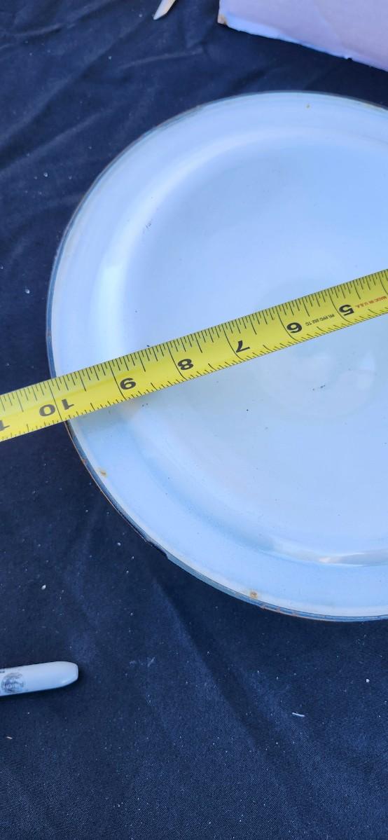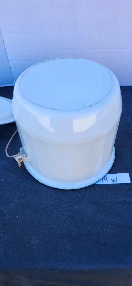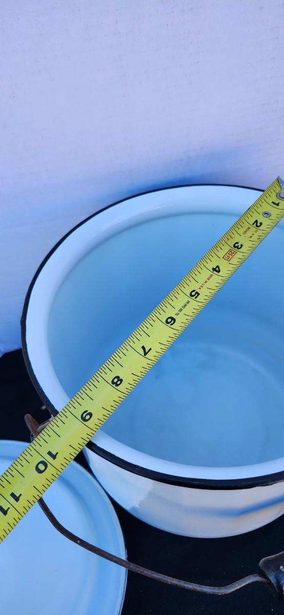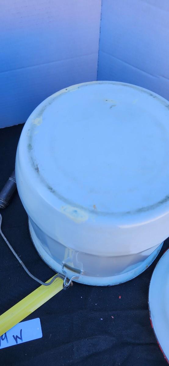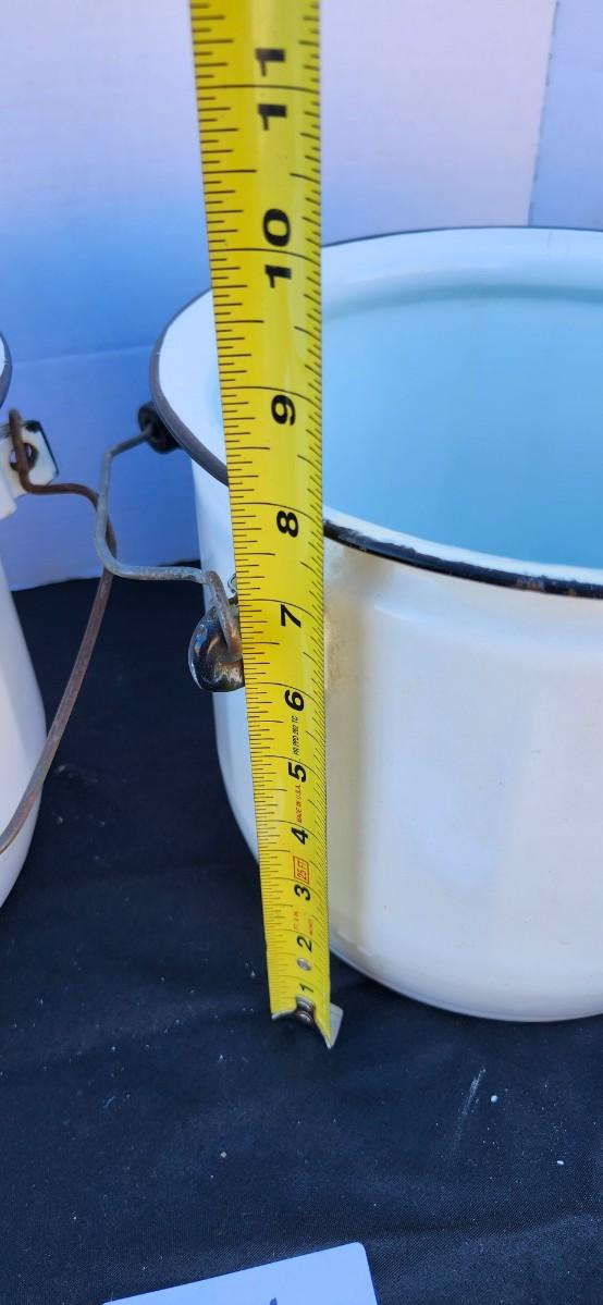 Two Enamel Chamber Pot with Lid Vintage White with Black Trim wire Bail Wood Handle