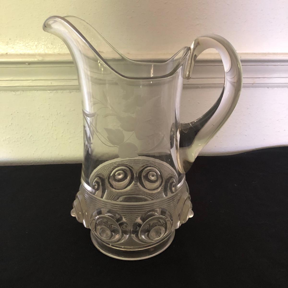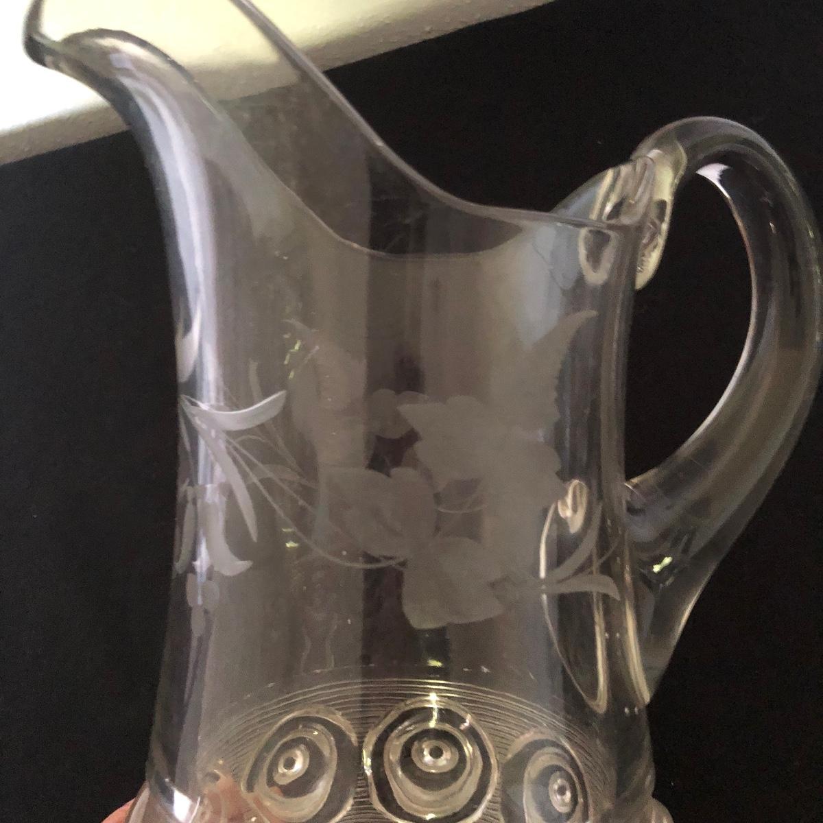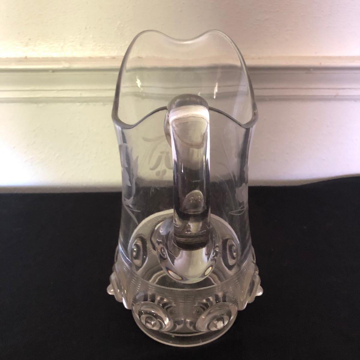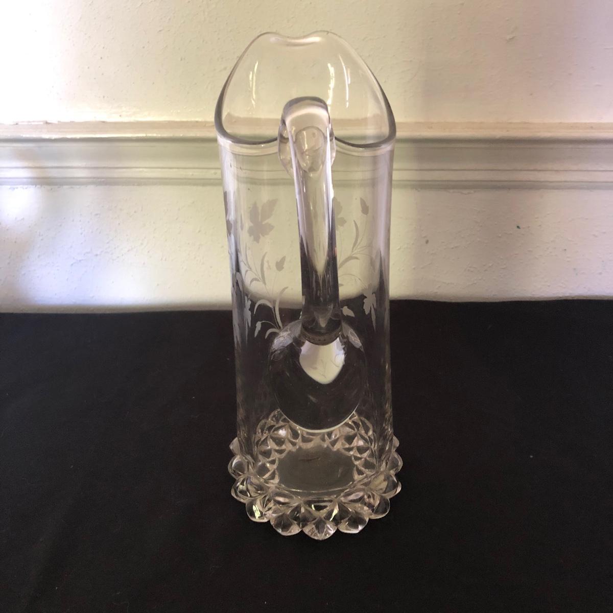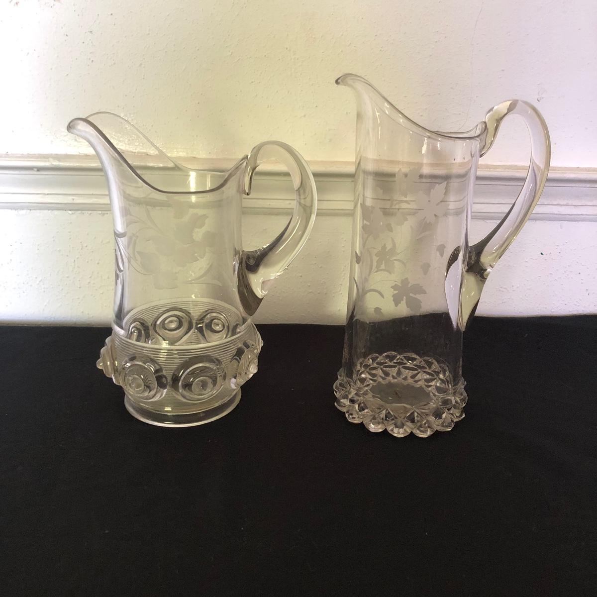 Lot includes two etched glass pitchers with a glass design on bottom. Tallest pitcher measures 5”D x 12” tall.