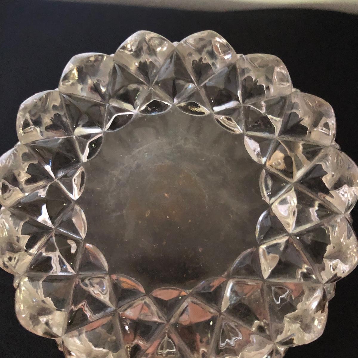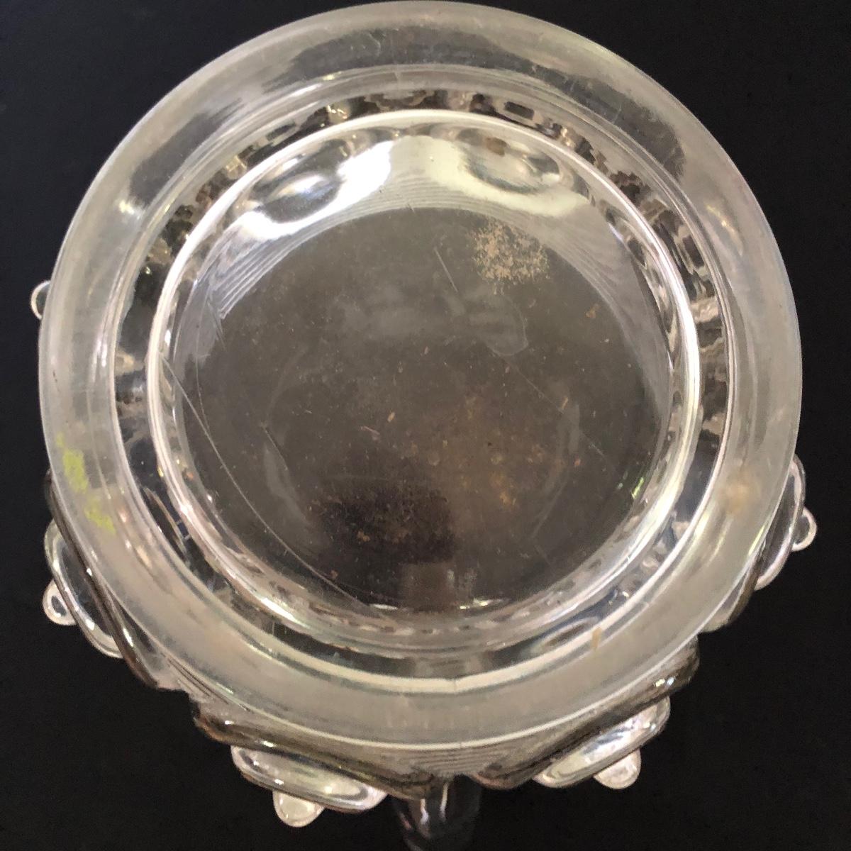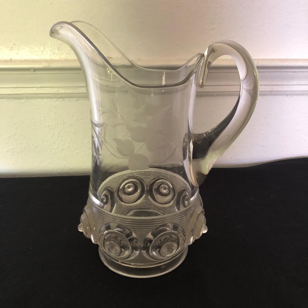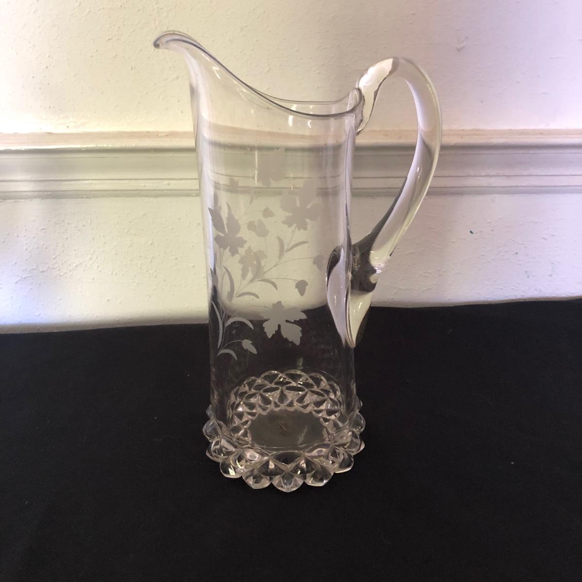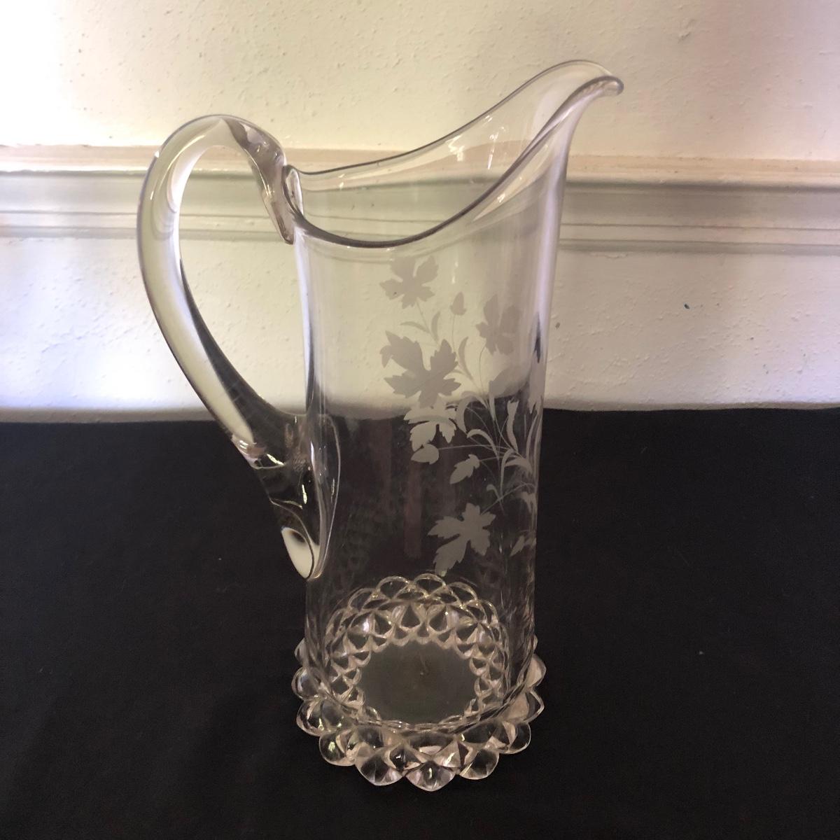 Lot includes two etched glass pitchers with a glass design on bottom. Tallest pitcher measures 5”D x 12” tall.