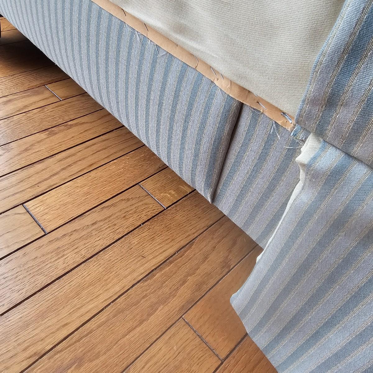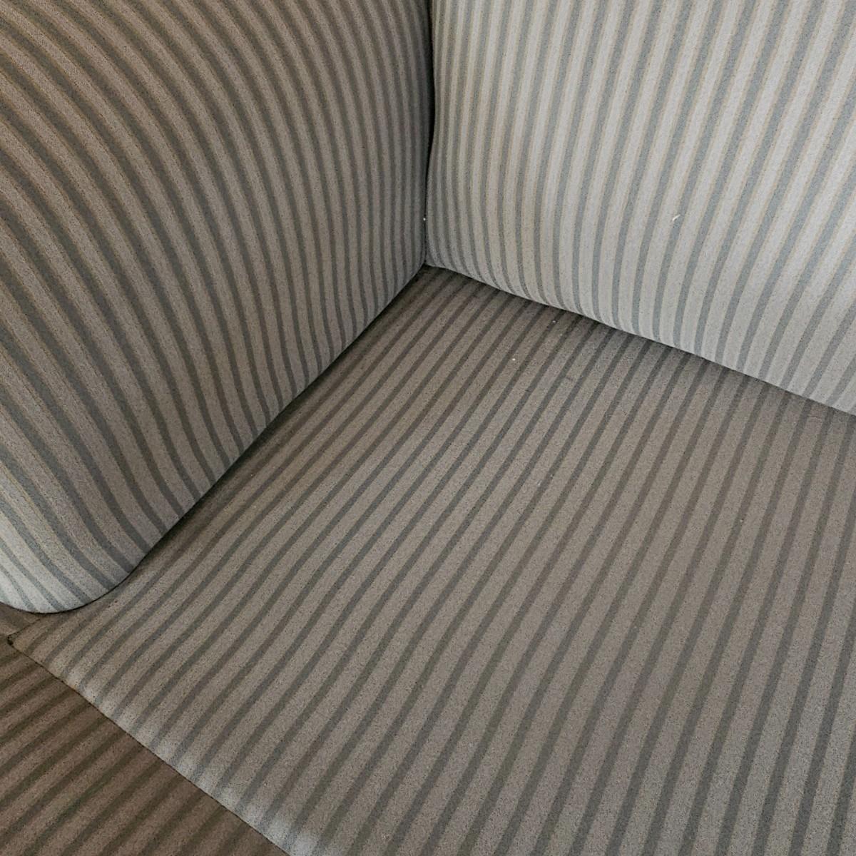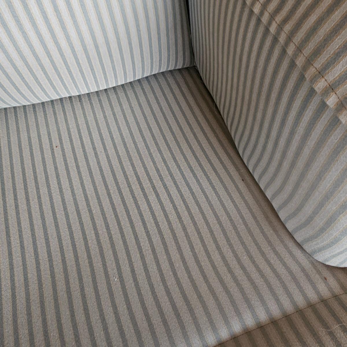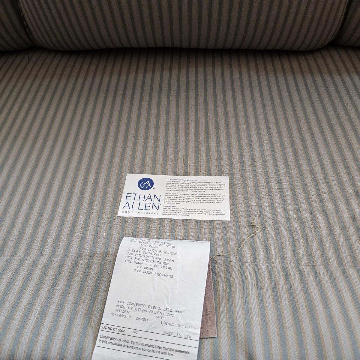 This lot contains two Ethan Allen sage green three seat sofas. Each couch is a striped sage green and comes with arm covers and two pillows. Each sofa measures 90” x 33” x 32”H with a 19” seat height. Both couches are in great condition. Local pick up only. Winning bidder must bring assistance to help move and load this item due to its weight and/or size.