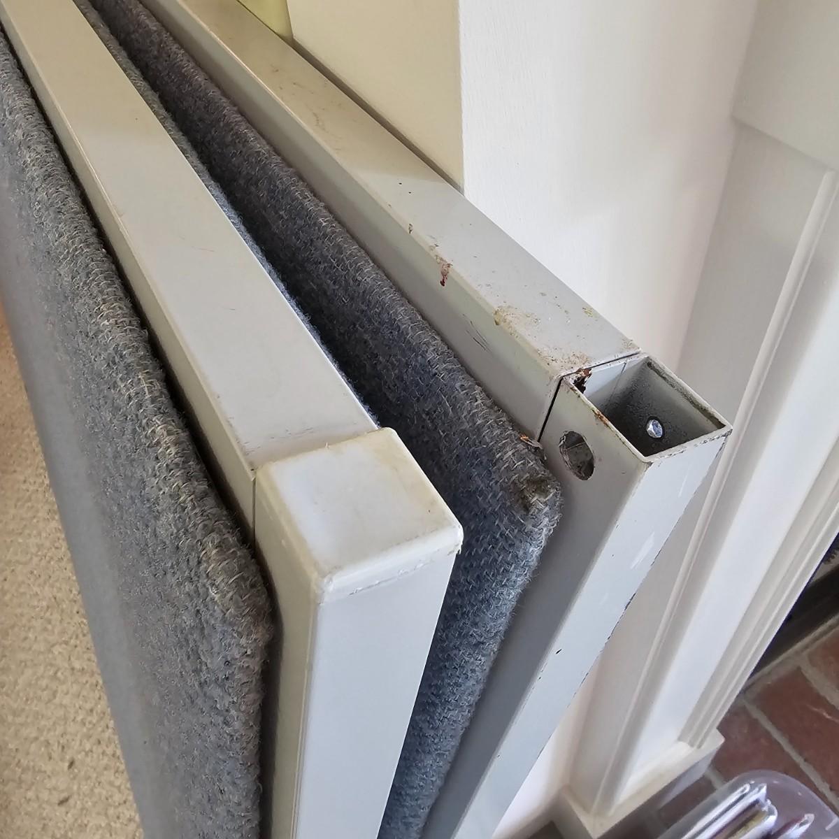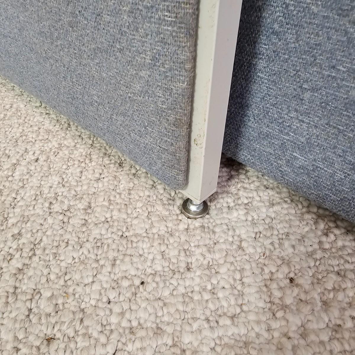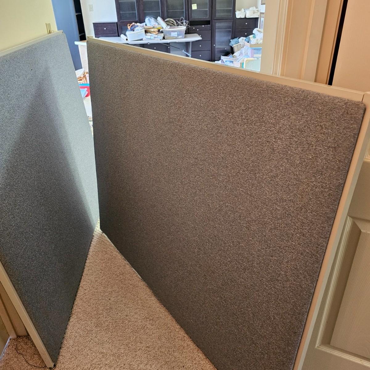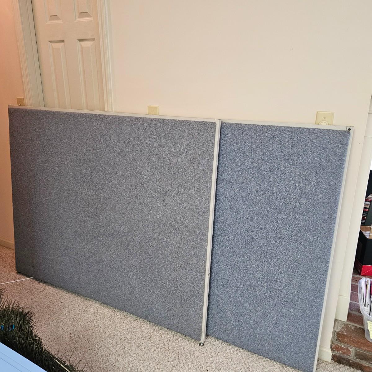 A pair of office style cubicle dividers covered in blue fabric. Both pieces have gray steel frames and soft, bulletin board type panels. Each one measures 60.5" x 2" x 48"H. Adjustable feet at bottom. See photos for details. Local pickup only. Winning bidder must bring assistance to help move and load this item due to its weight and/or size.