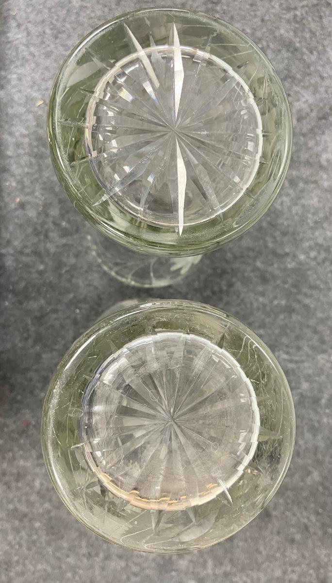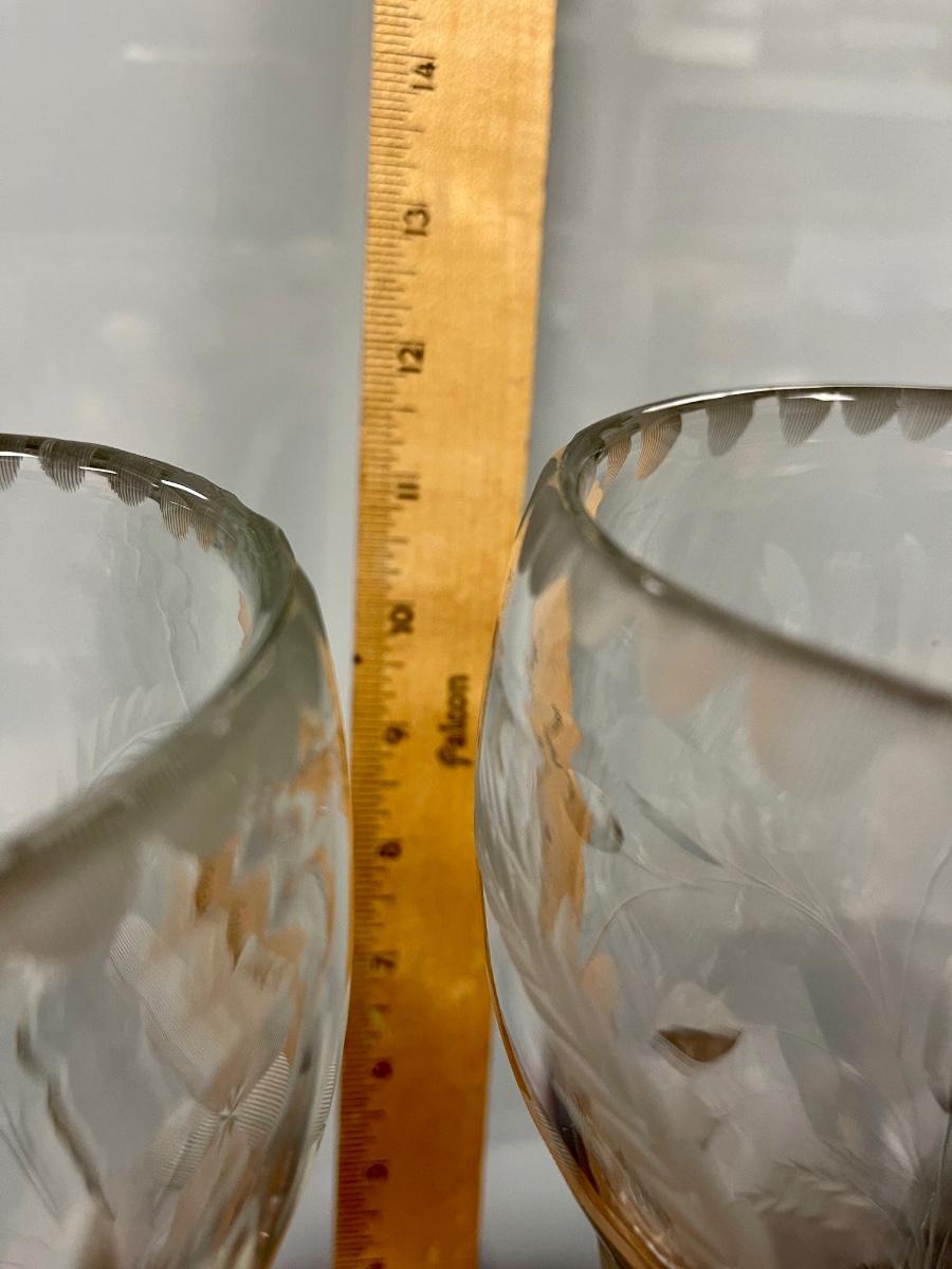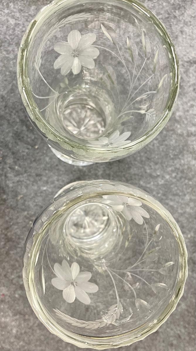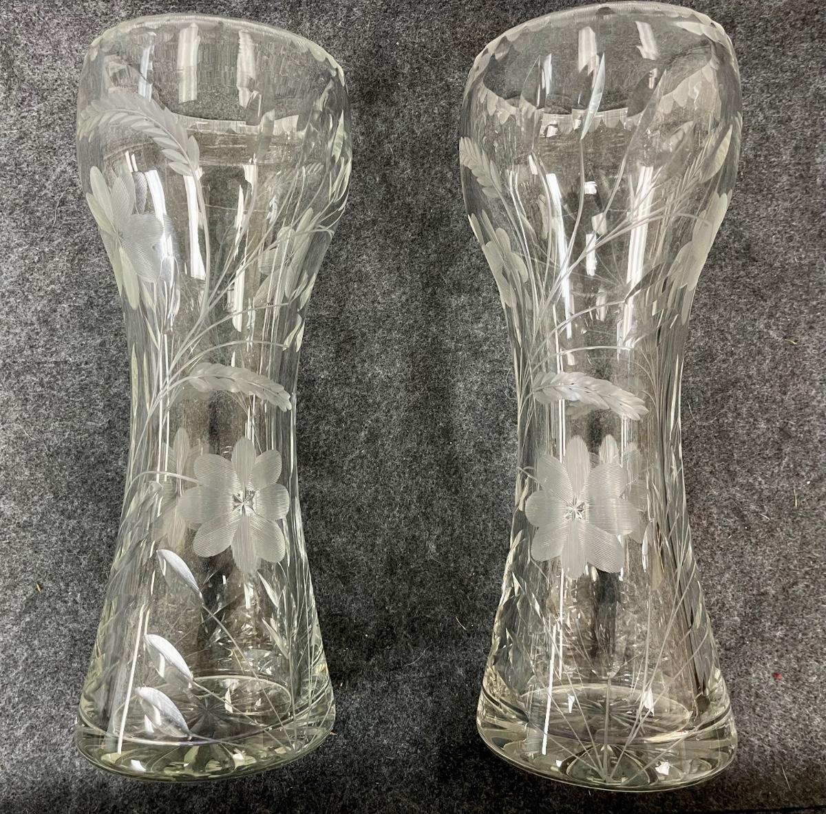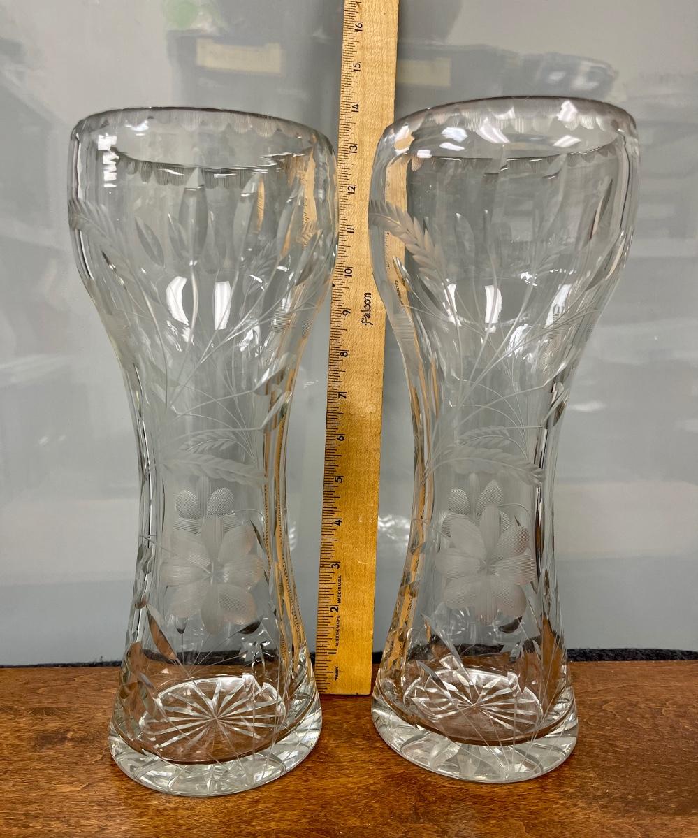 Pair of Vintage Floral Etched Crystal Glass Vases