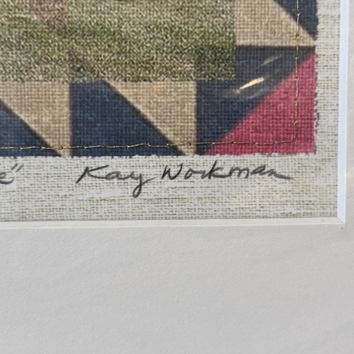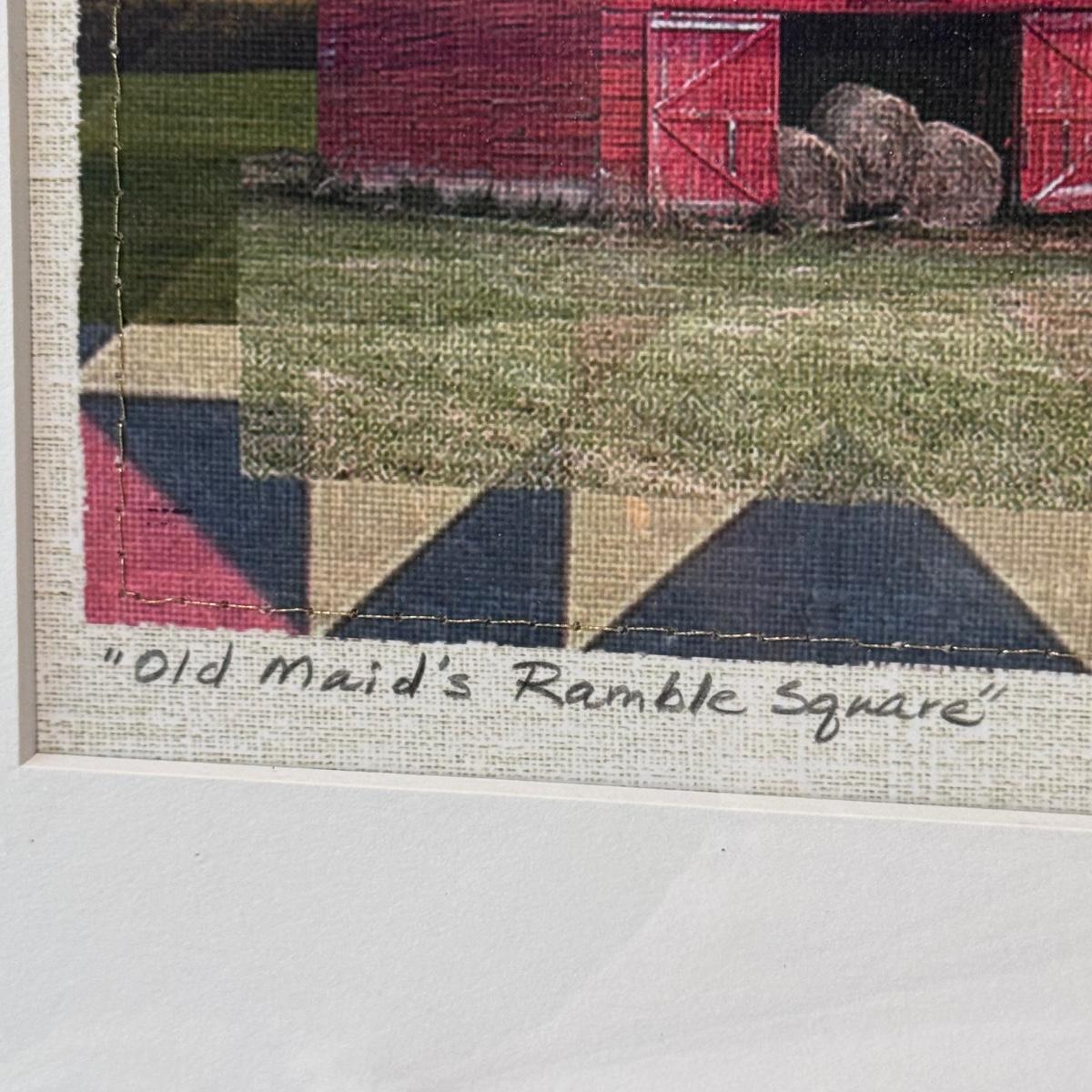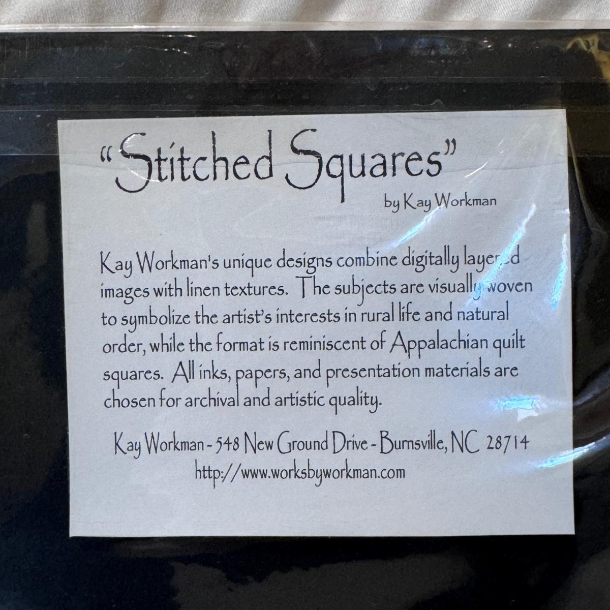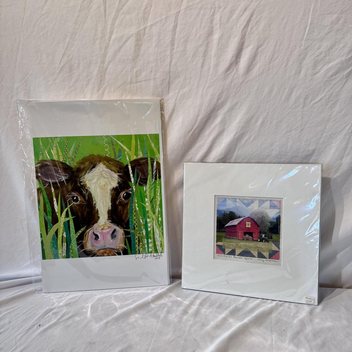Lot includes one print of a cow by Susannah Raine-Haddad and one print titled “Old Maid’s Ramble Square” by Kay Workman. The cow print is signed with pen in the bottom left corner. The ramble square print is also signed in pencil. Both pieces are protected in a plastic sleeve. The cow print measures 12” x 18”H. Shipping available.