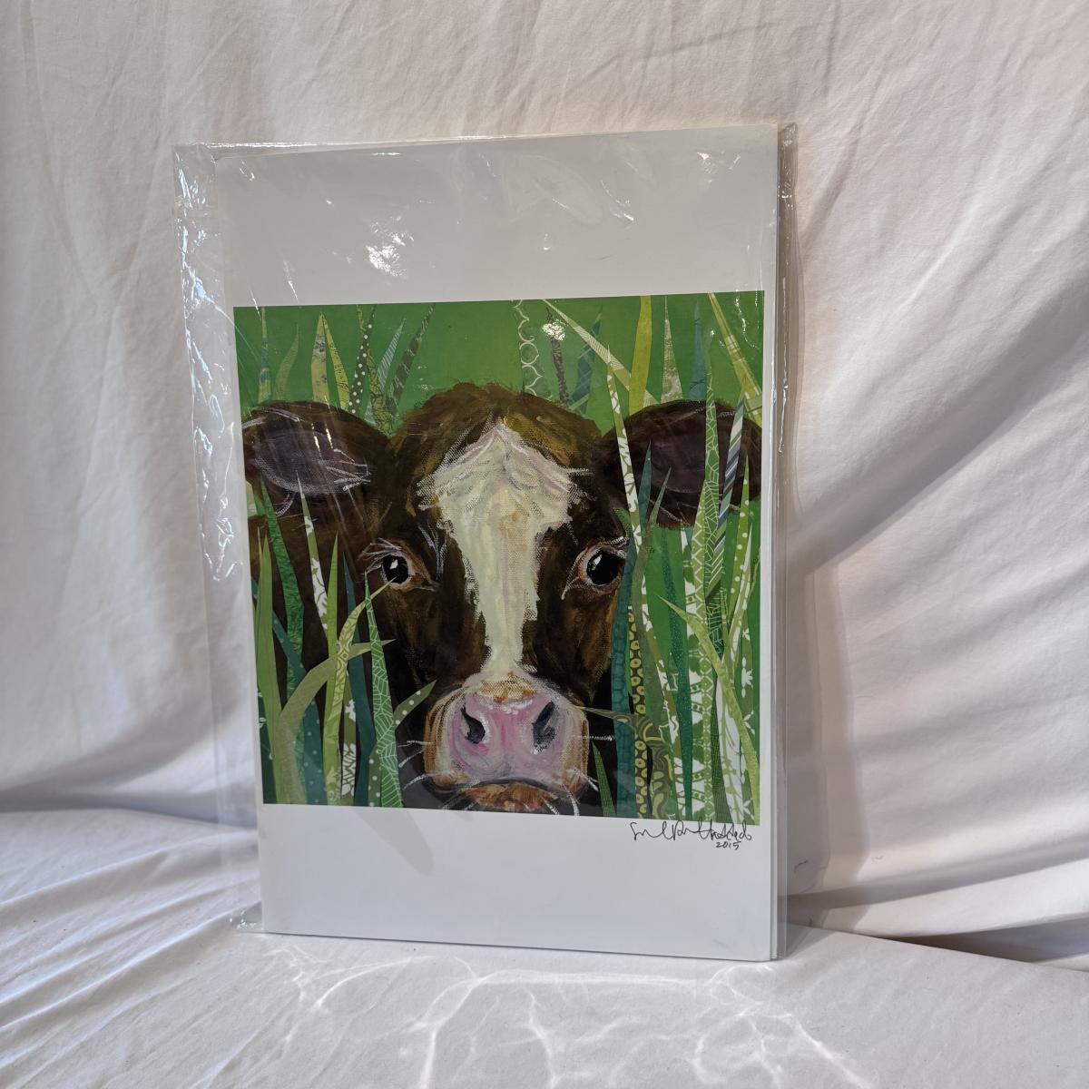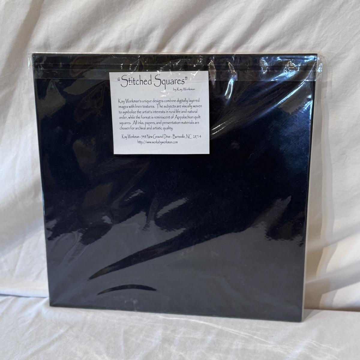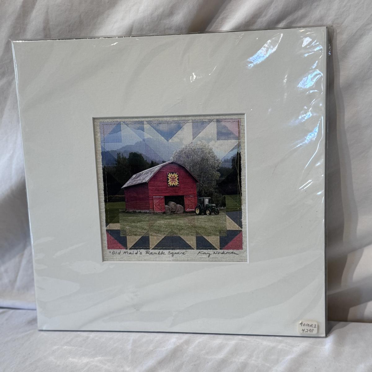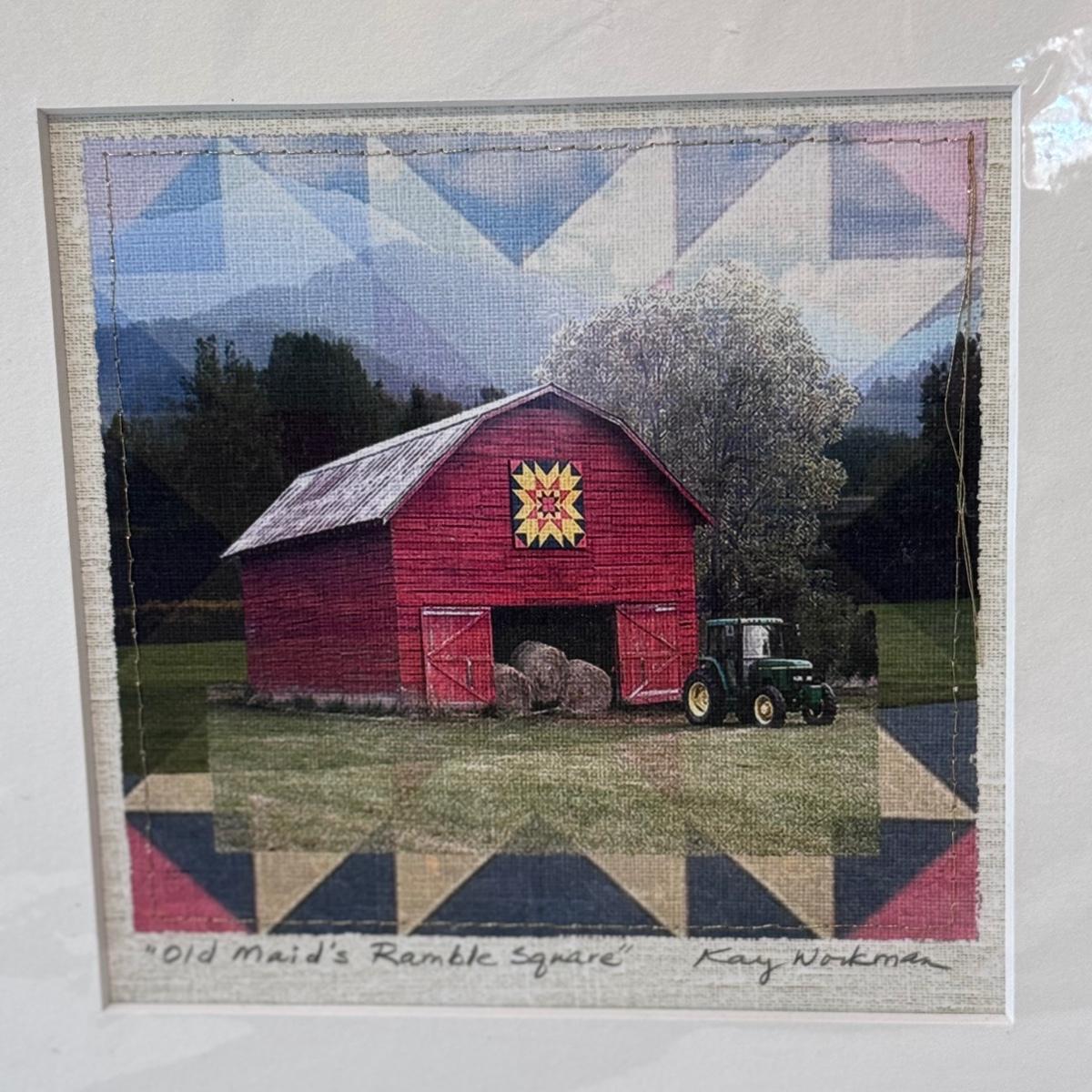 Lot includes one print of a cow by Susannah Raine-Haddad and one print titled “Old Maid’s Ramble Square” by Kay Workman. The cow print is signed with pen in the bottom left corner. The ramble square print is also signed in pencil. Both pieces are protected in a plastic sleeve. The cow print measures 12” x 18”H. Shipping available.