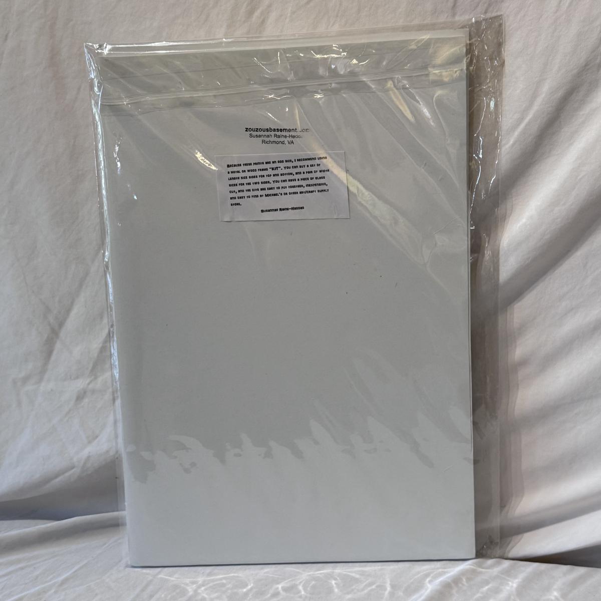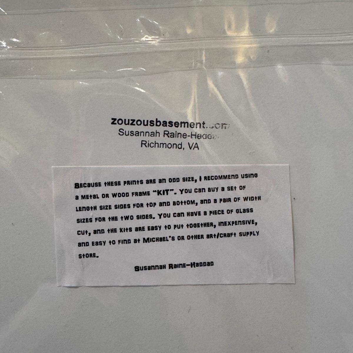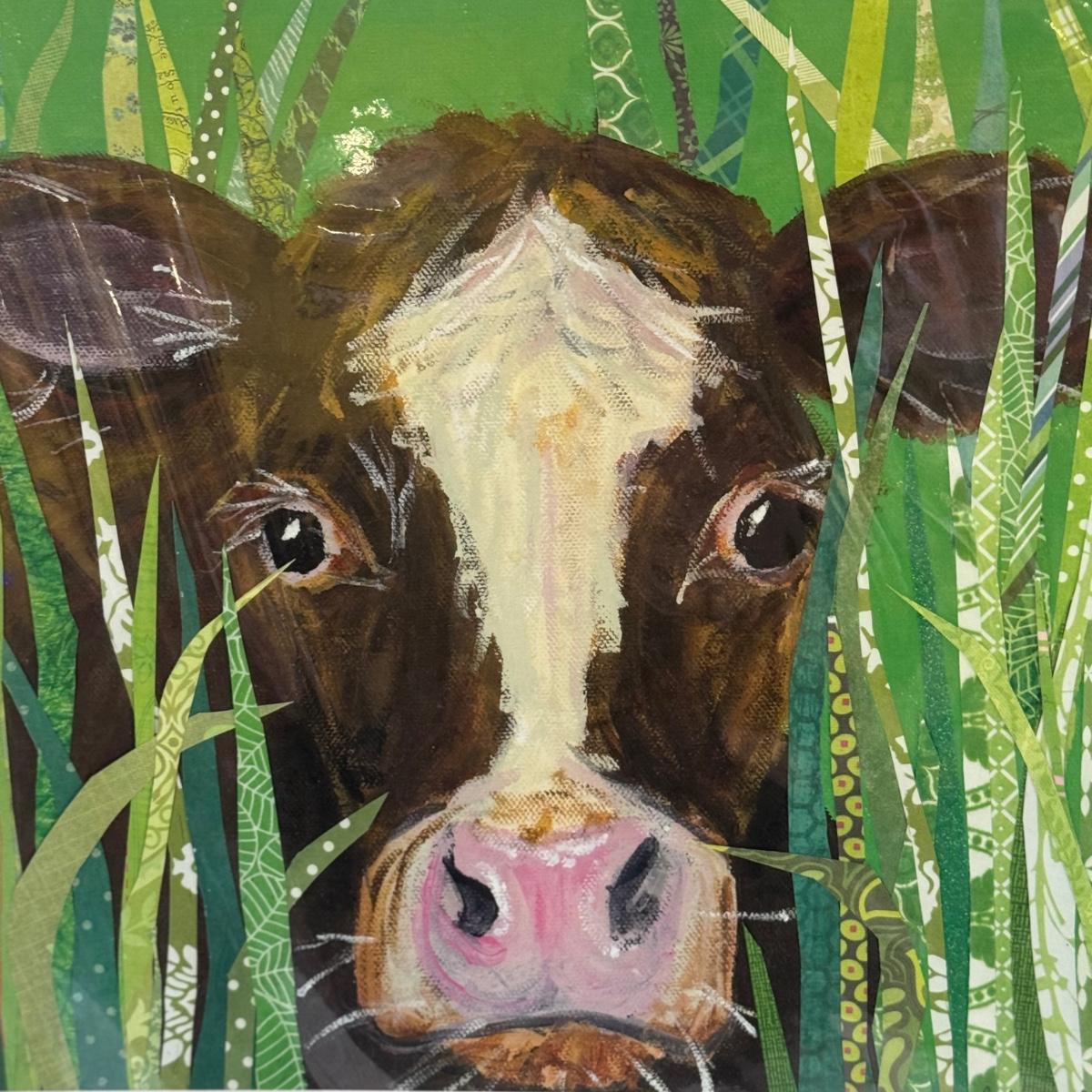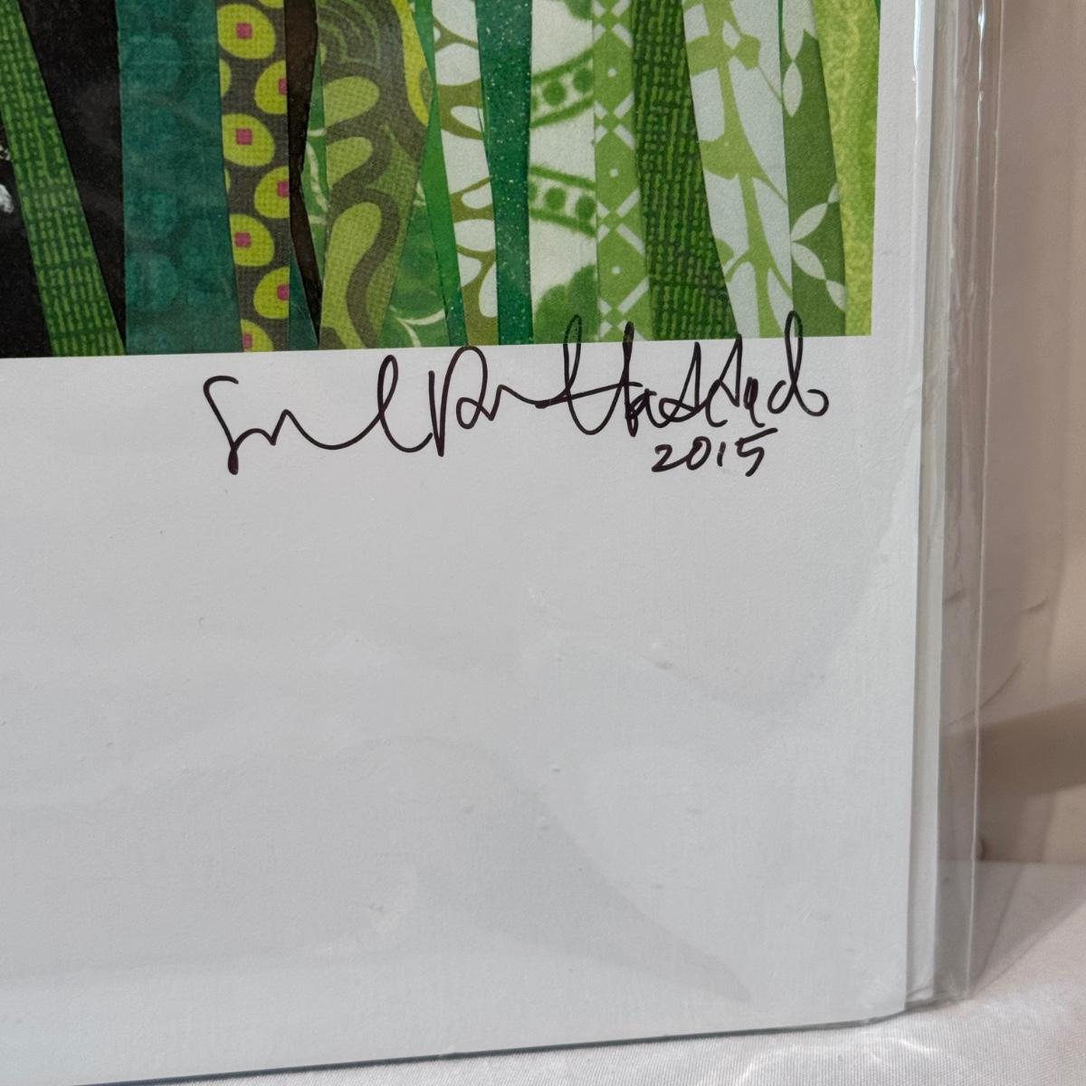 Lot includes one print of a cow by Susannah Raine-Haddad and one print titled “Old Maid’s Ramble Square” by Kay Workman. The cow print is signed with pen in the bottom left corner. The ramble square print is also signed in pencil. Both pieces are protected in a plastic sleeve. The cow print measures 12” x 18”H. Shipping available.