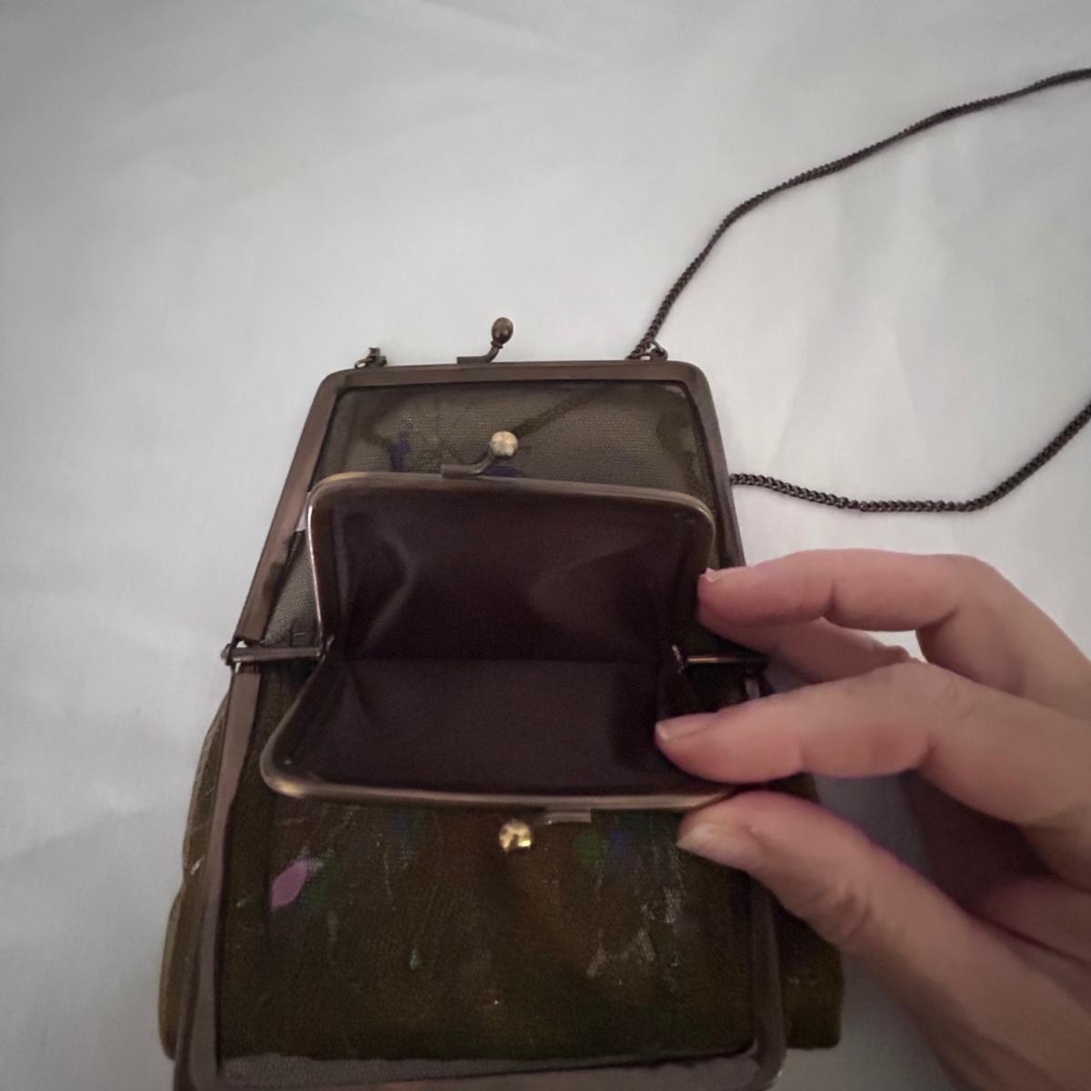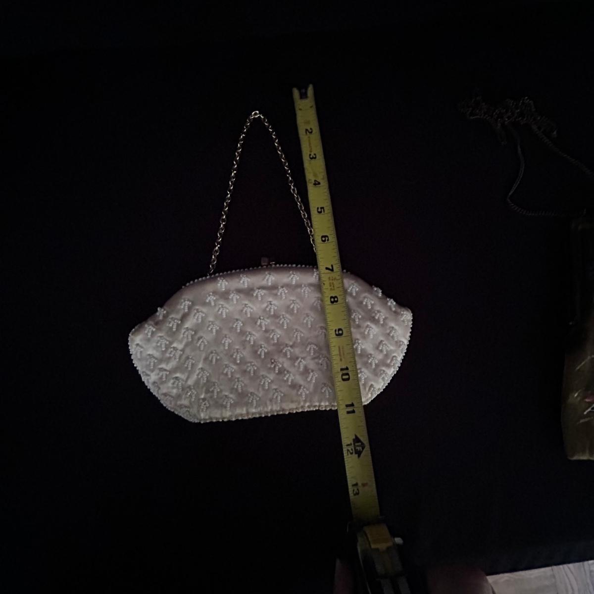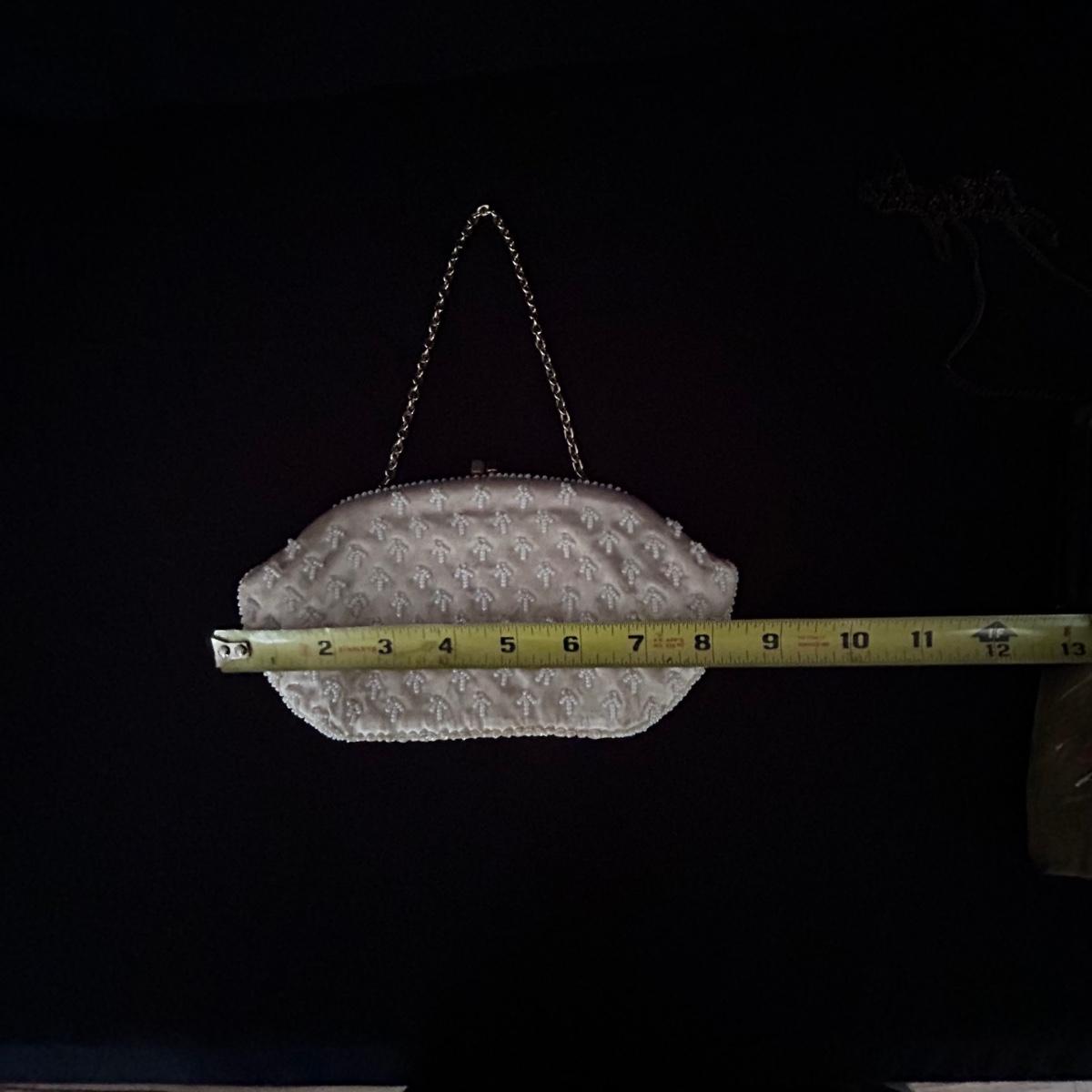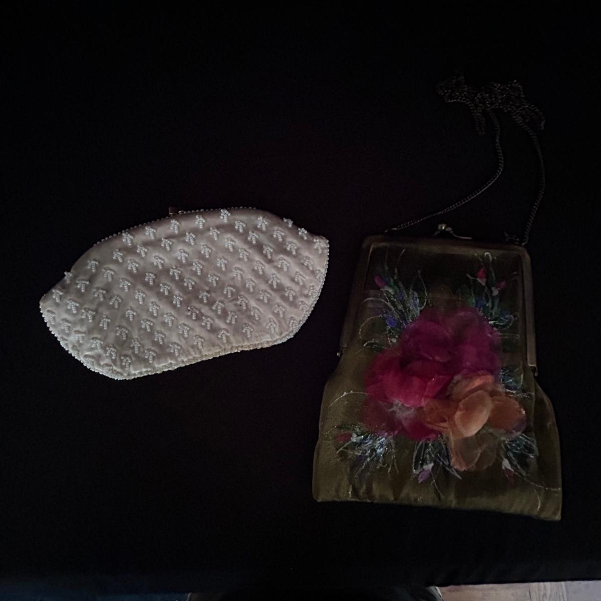 Two lovely clutch or shoulder purses for those special events. The cream colored one is a Safco bag that appears to be a satin material and quilted. It has an inner pocket and the shoulder chain can be tucked in to use as a clutch back. The green/tan mesh bag has a snap inner pocket and the ornate colorful outside is textured (see images). Shipping available.