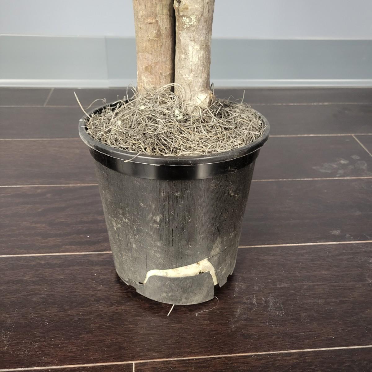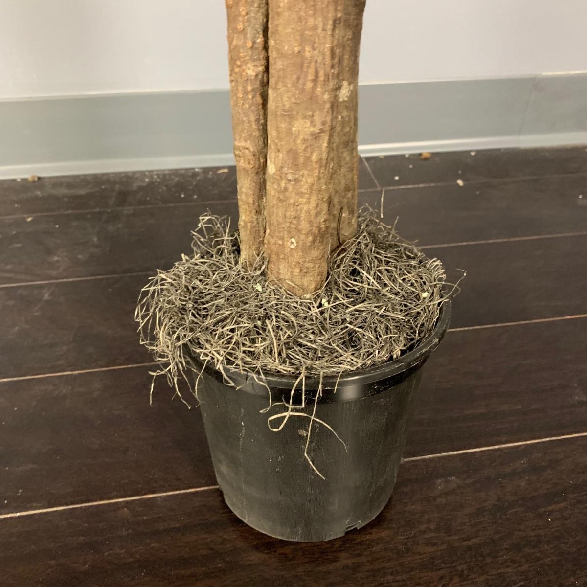 Two faux maple trees. Each measure approximately 80” tall. The tree trunks appear to be real, but the leaves are artificial. Both will need another pot to stand upright on their own, they are currently in black plastic pots. One trees post is cracked. Local pickup only.