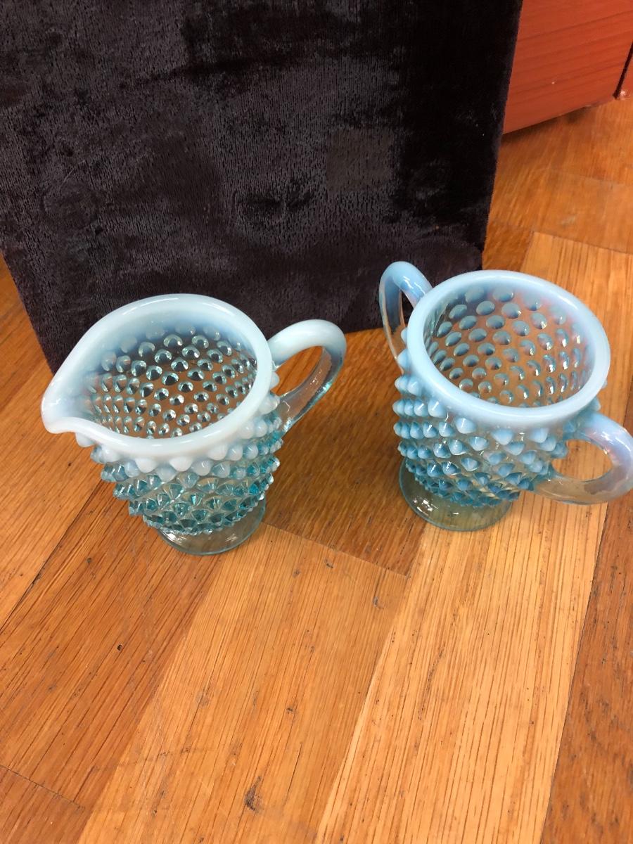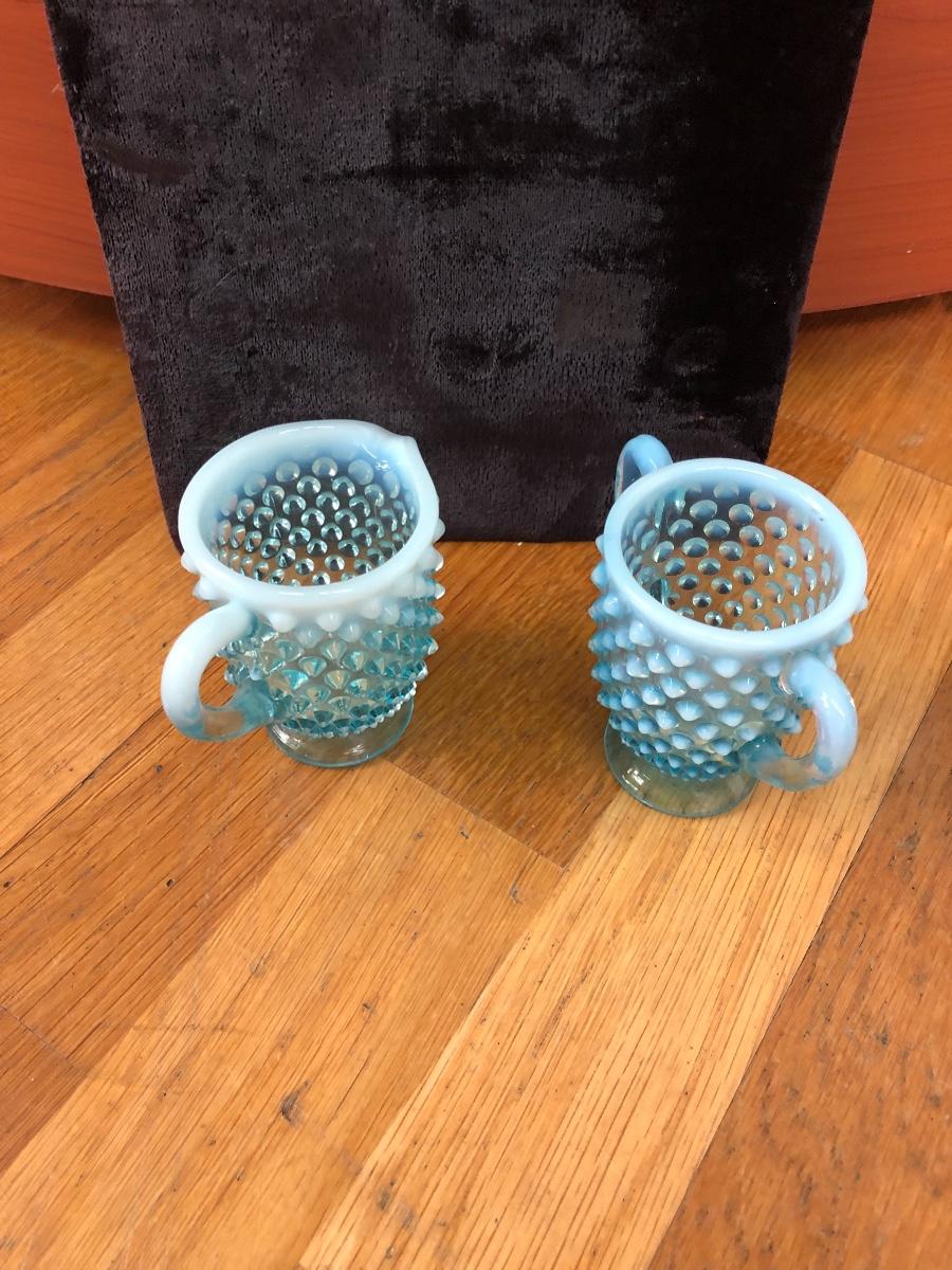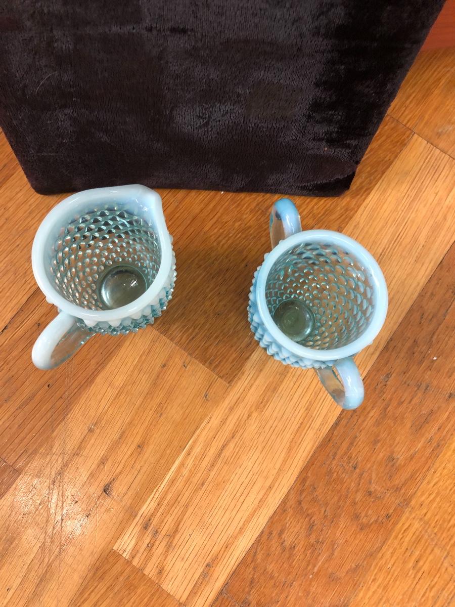 These are two mini opalescent baby blue hobnail creamer and sugar. They measure 3.5”
