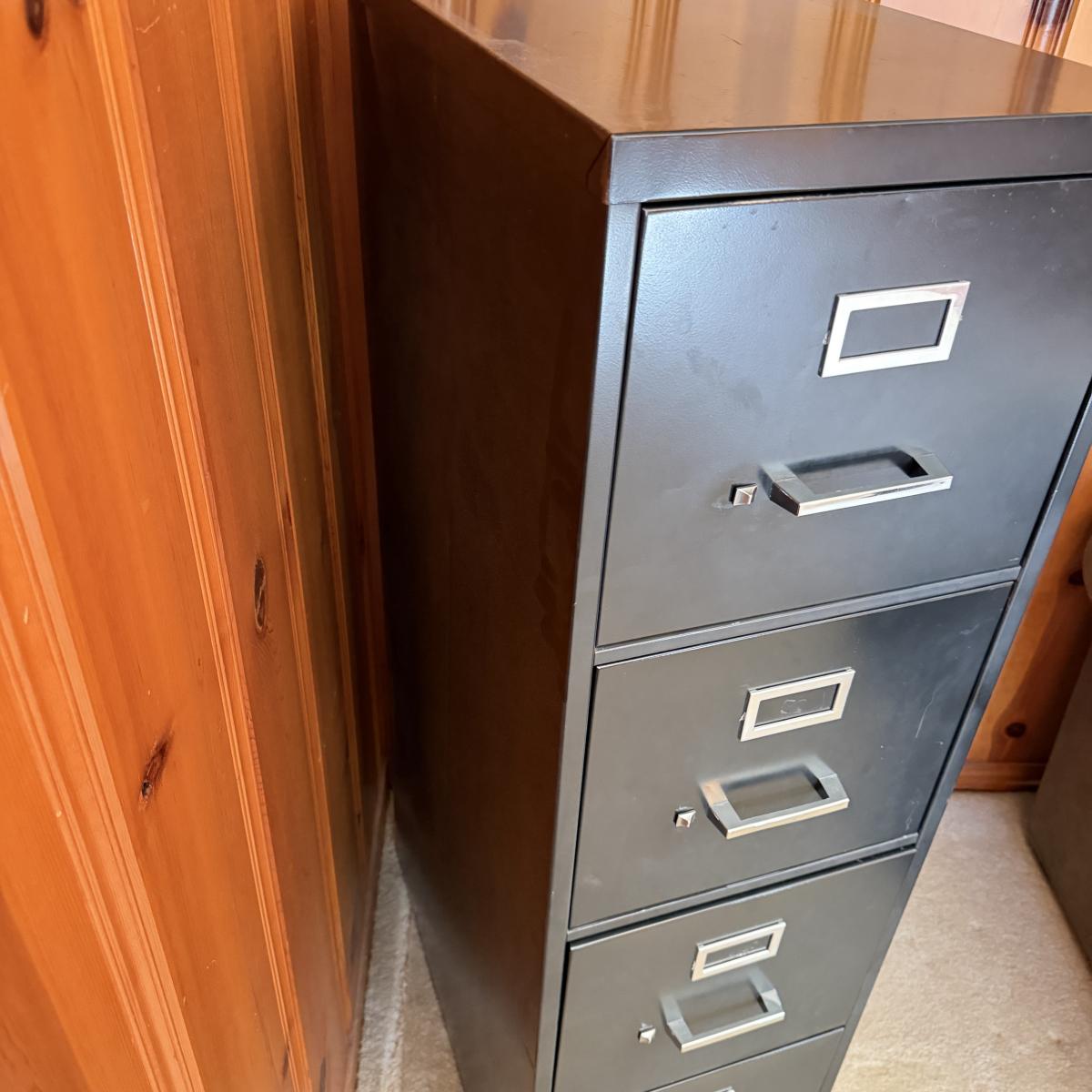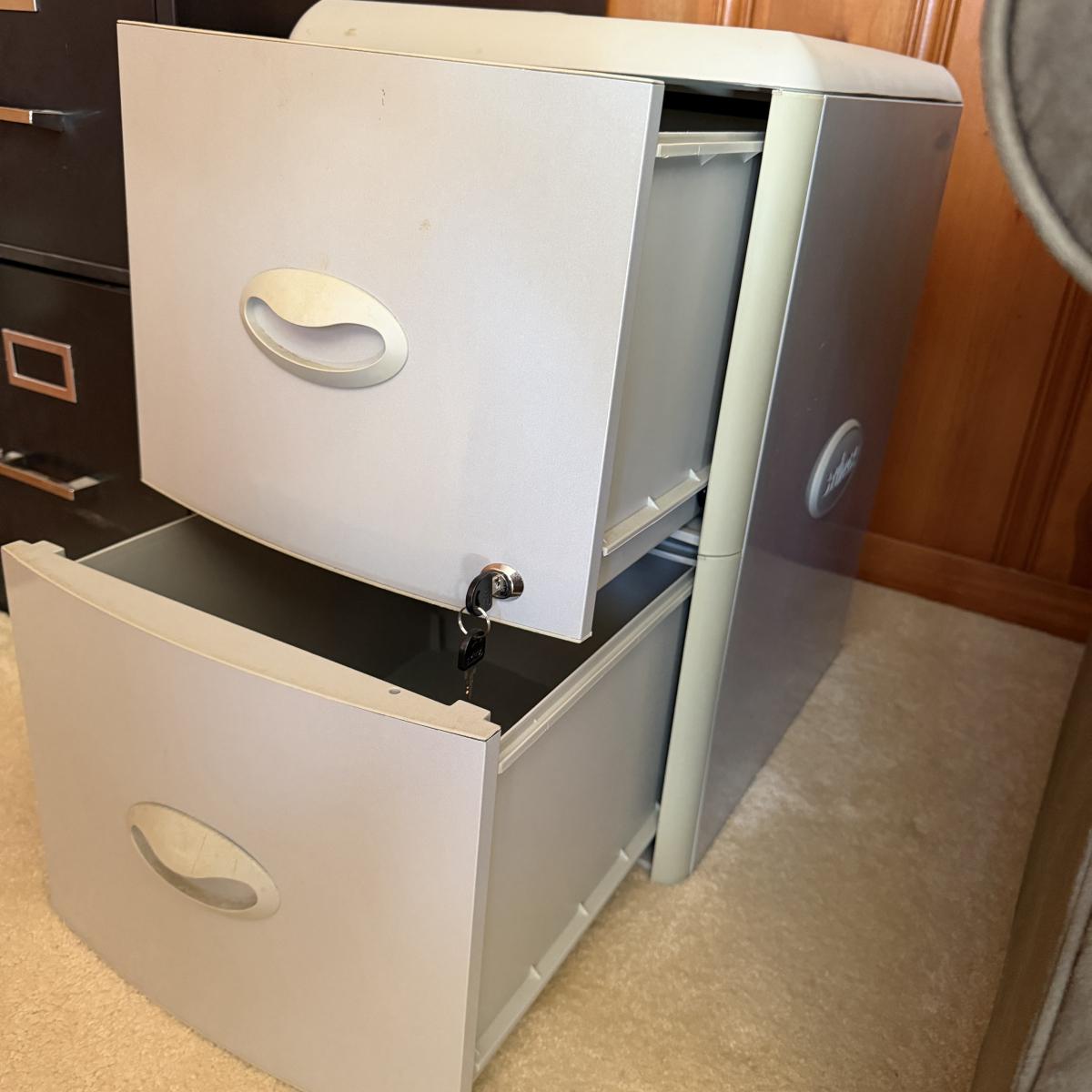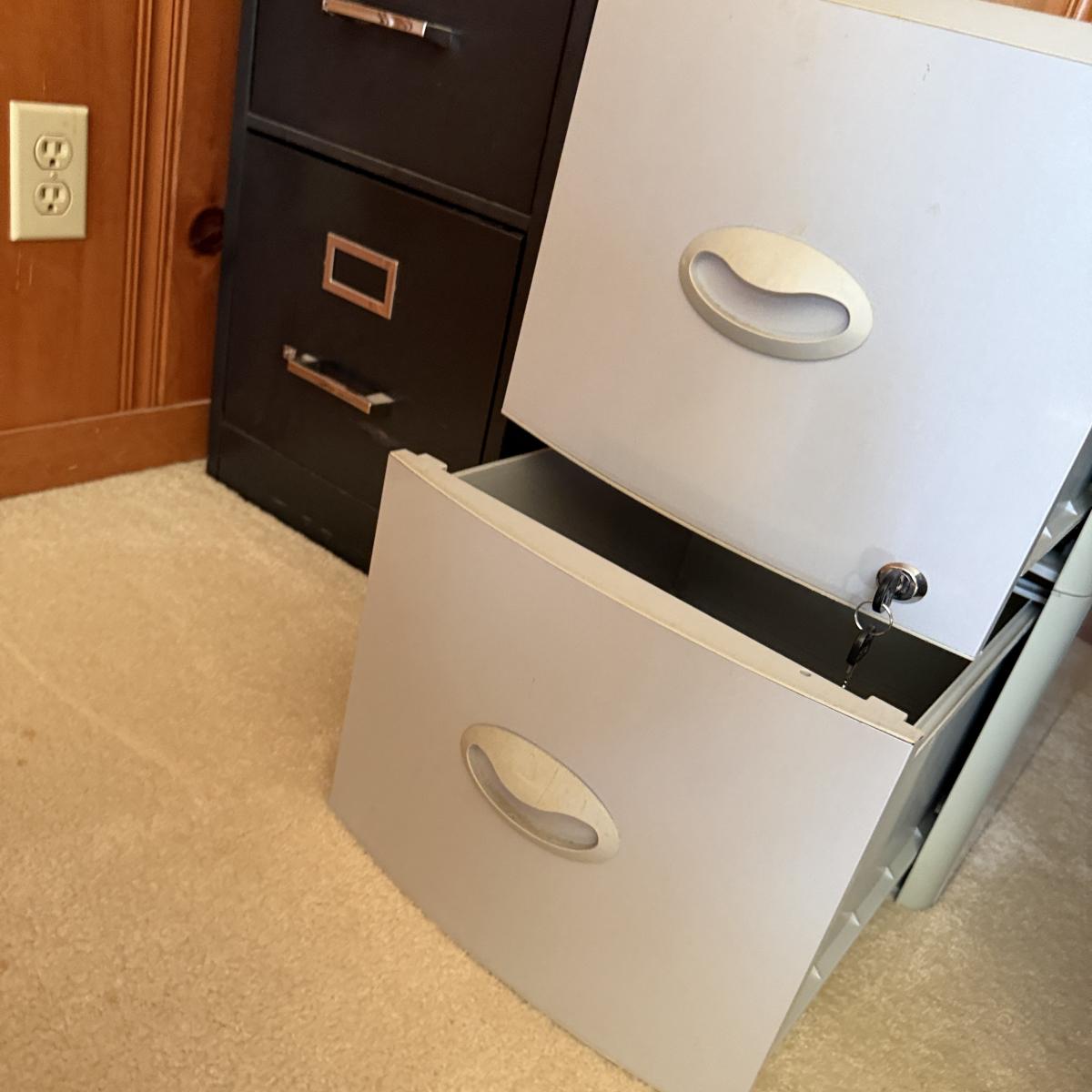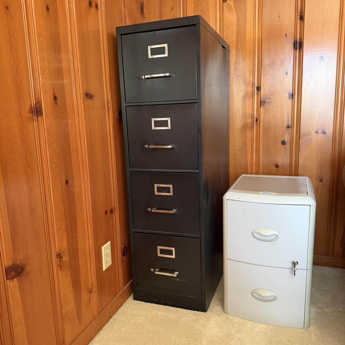 Lot includes a plastic two drawer locking file cabinet with key and a four drawer metal filing cabinet. Largest cabinet measures 15” x 27” x 52”H