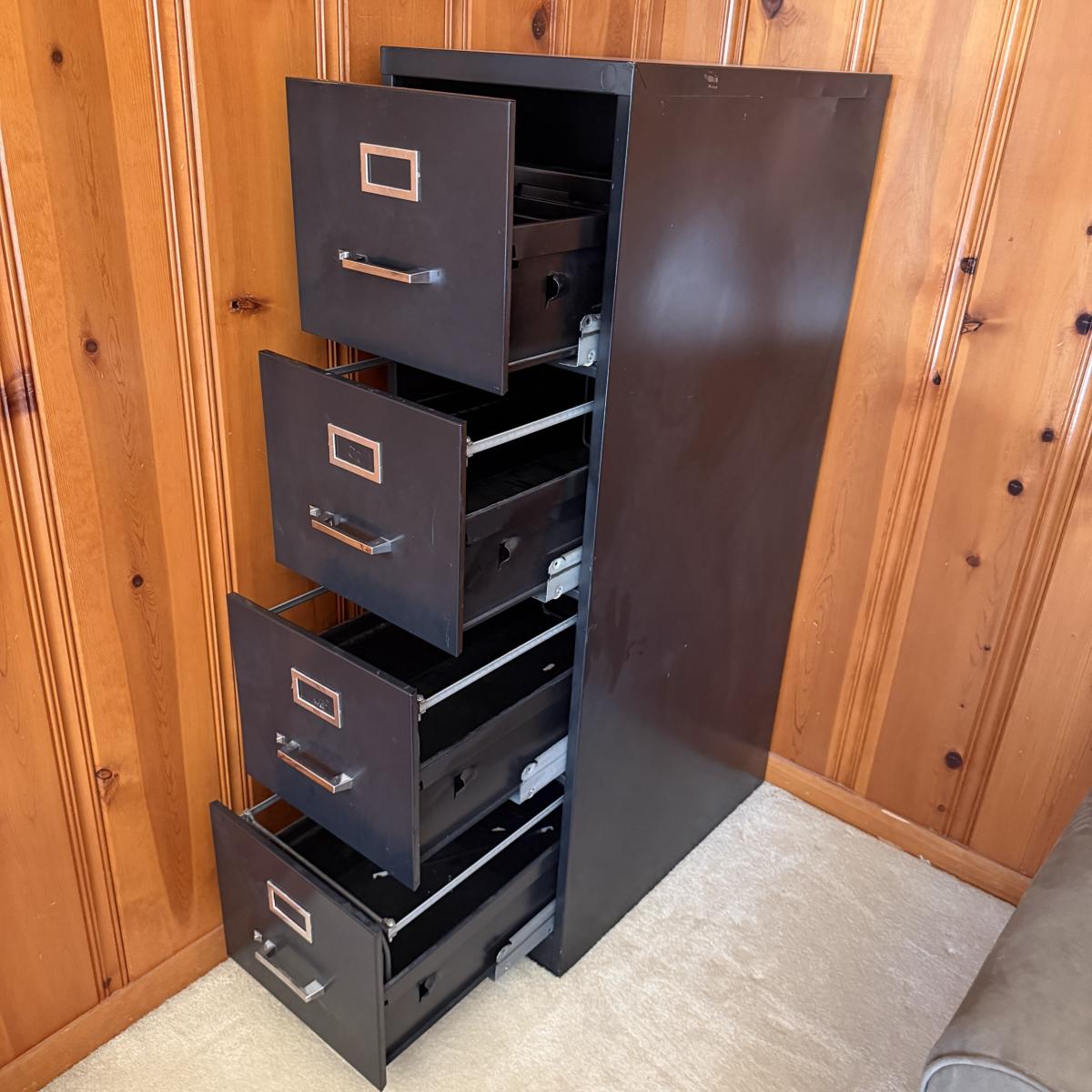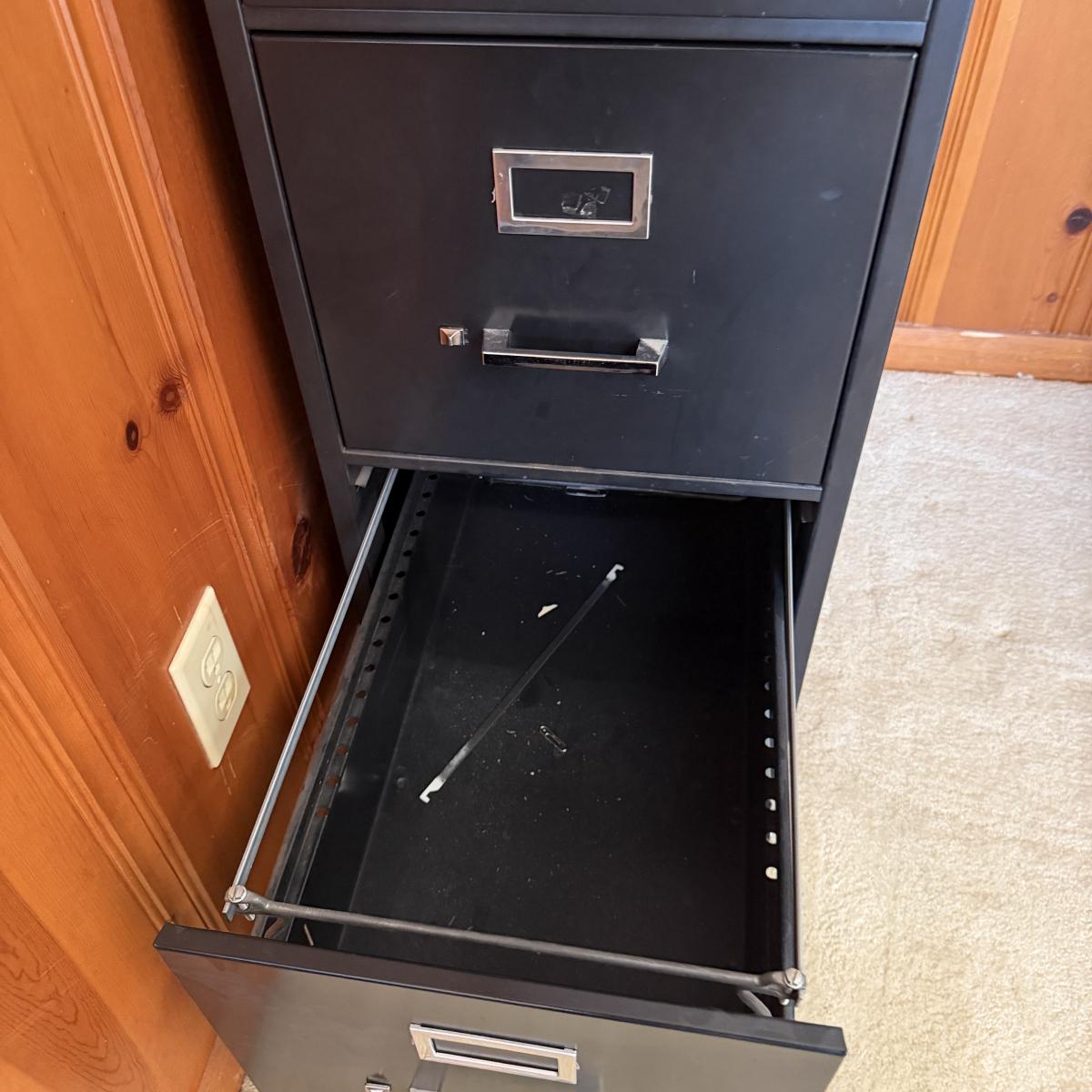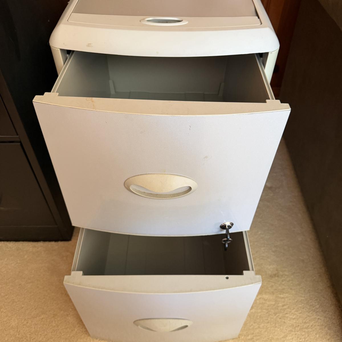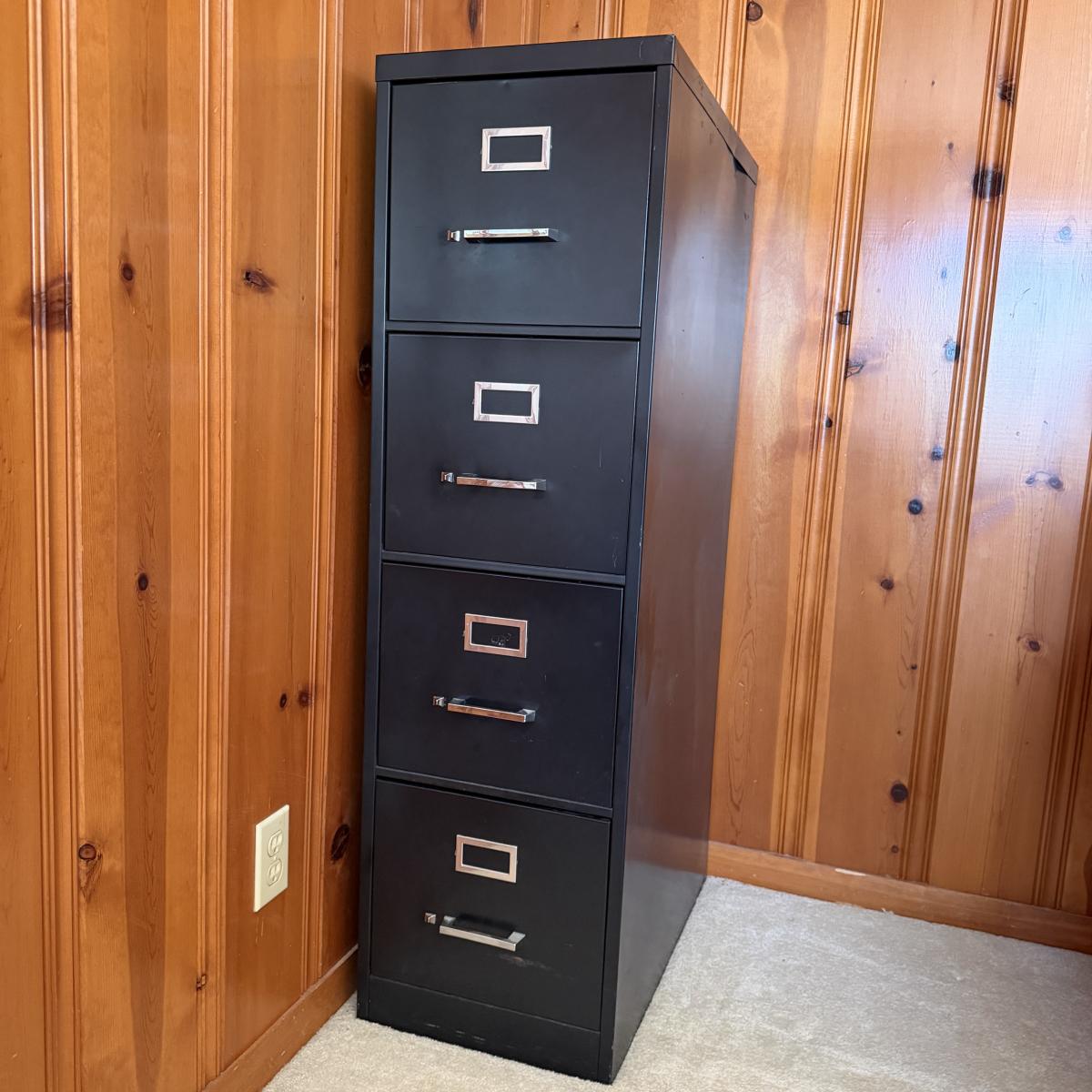 Lot includes a plastic two drawer locking file cabinet with key and a four drawer metal filing cabinet. Largest cabinet measures 15” x 27” x 52”H