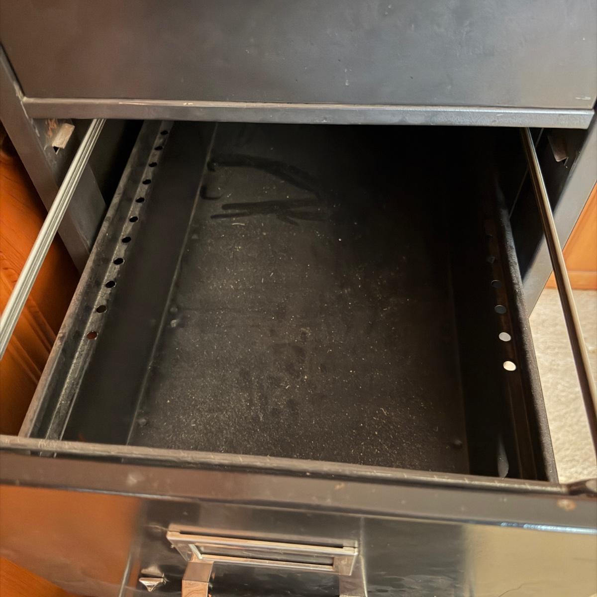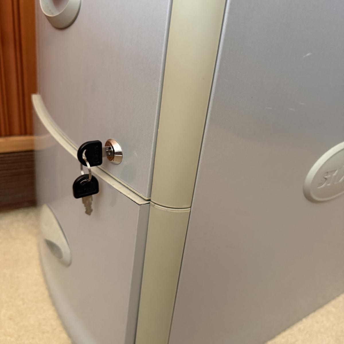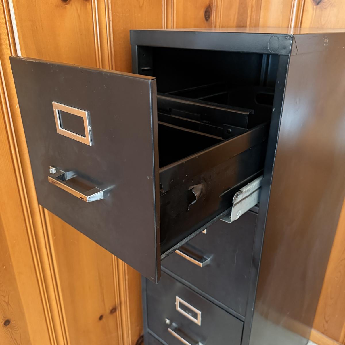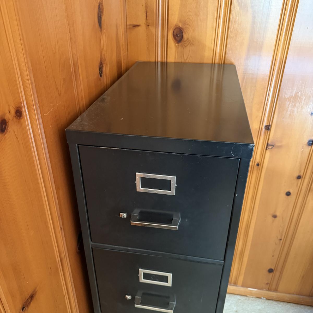 Lot includes a plastic two drawer locking file cabinet with key and a four drawer metal filing cabinet. Largest cabinet measures 15” x 27” x 52”H