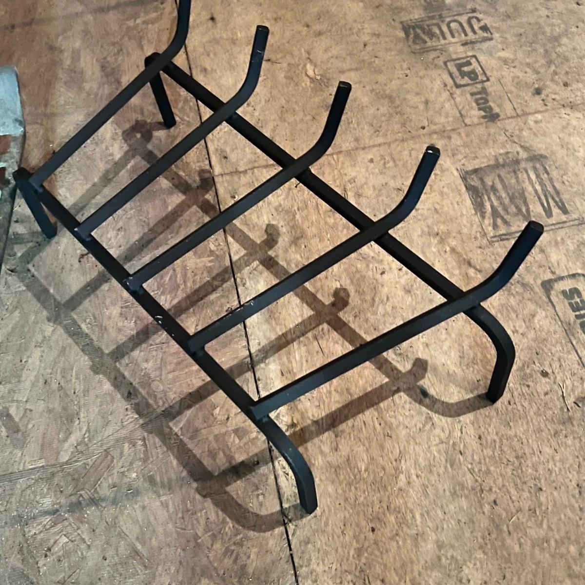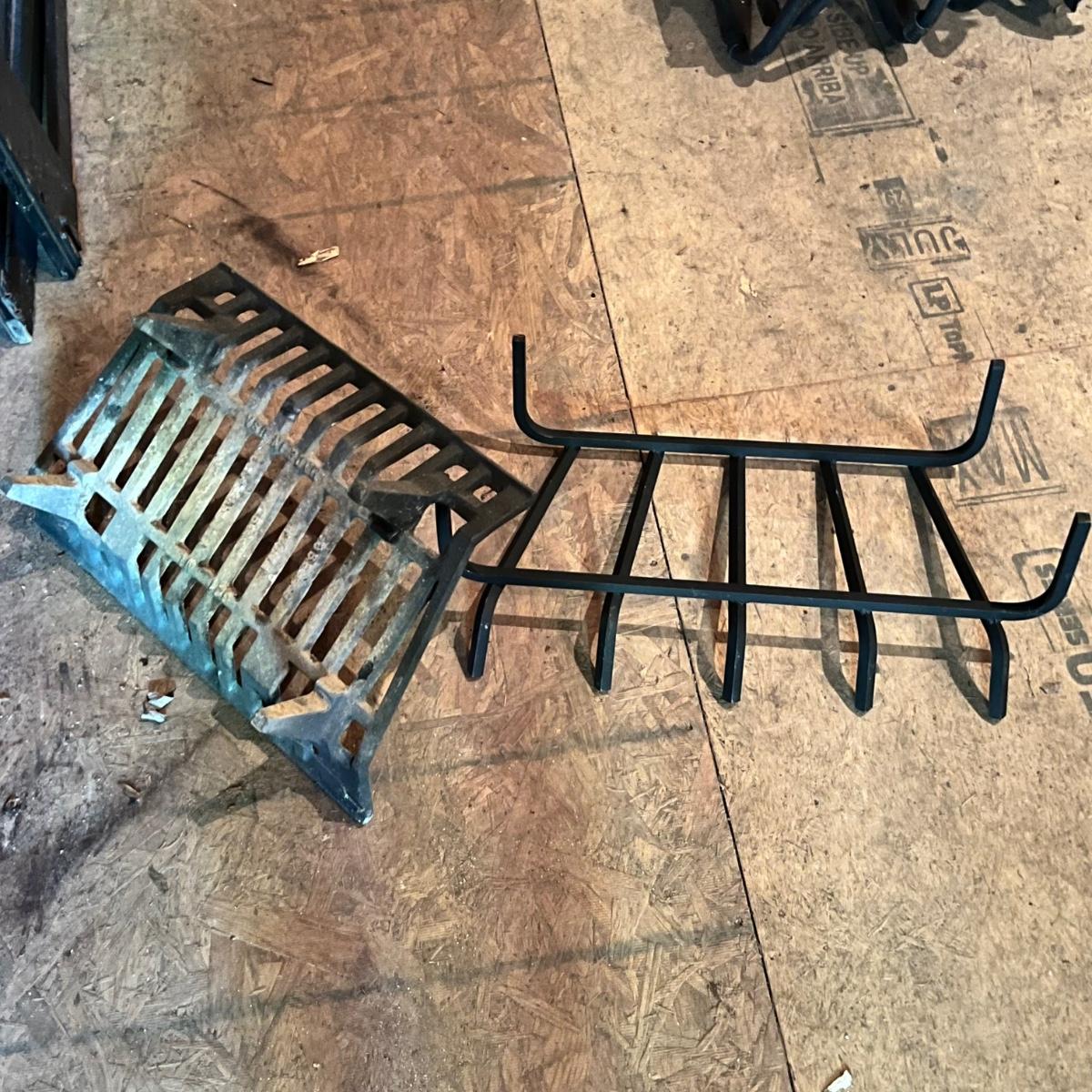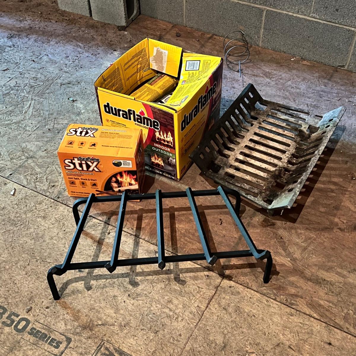 Two metal fireplace grate lot includes a lighter-weight black steel grate and a heavier grate that appears to be wrought iron. The heavier grate measures 21” x 14” x 10”H. Also included are Duraflame fire starter logs and sticks for indoor and outdoor use. Local pick up only.