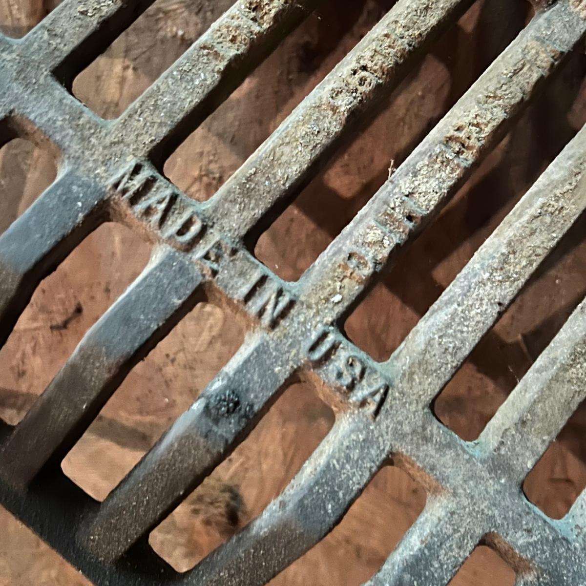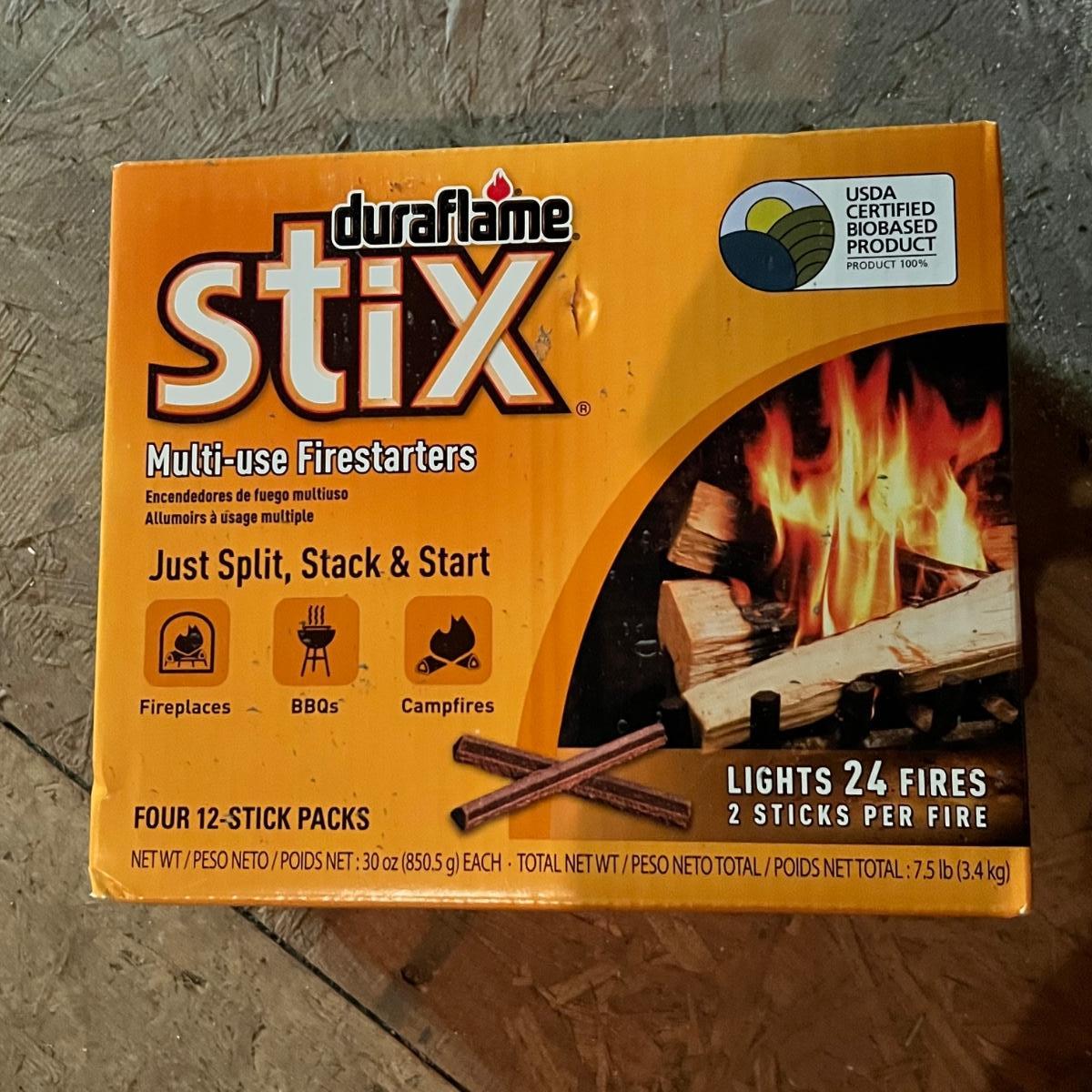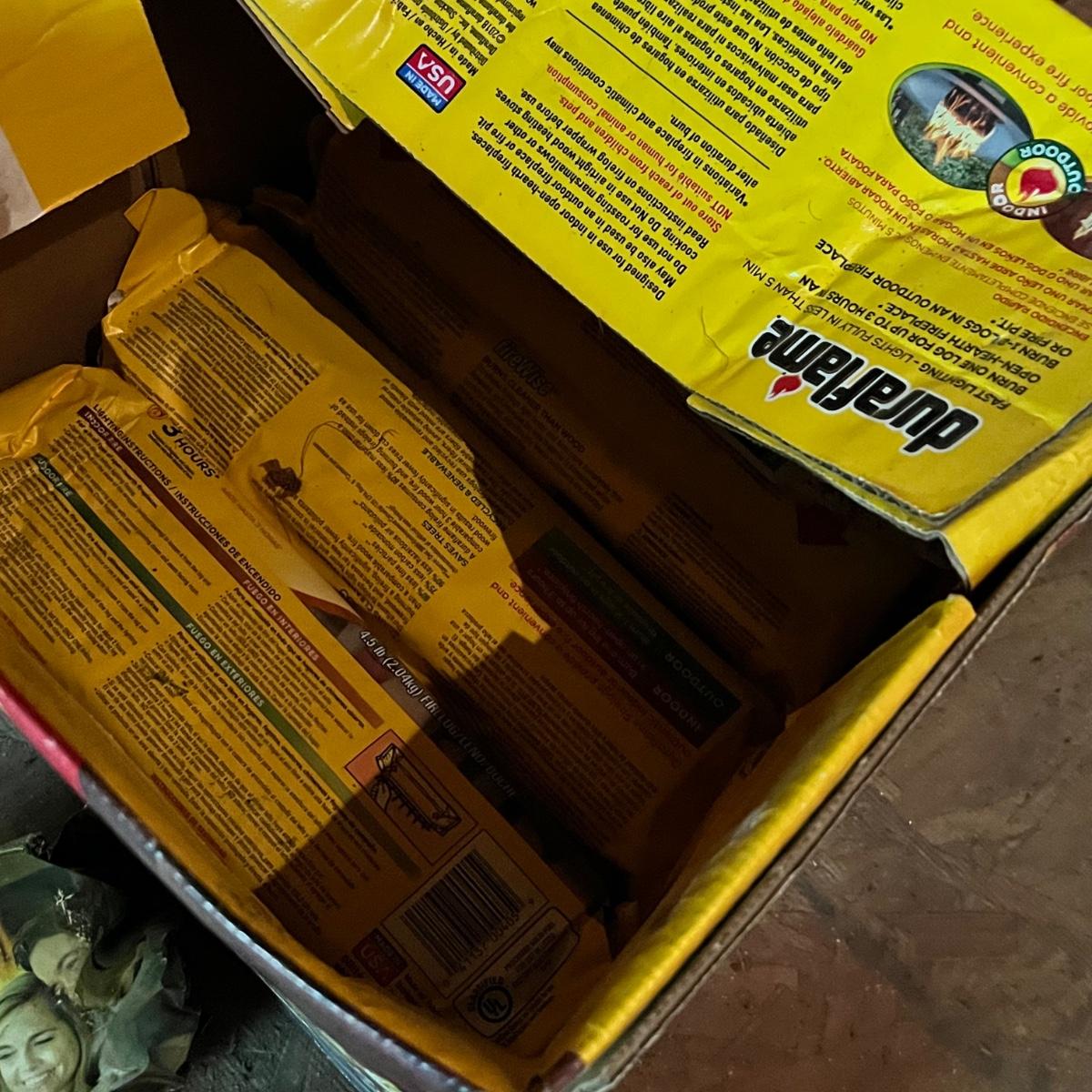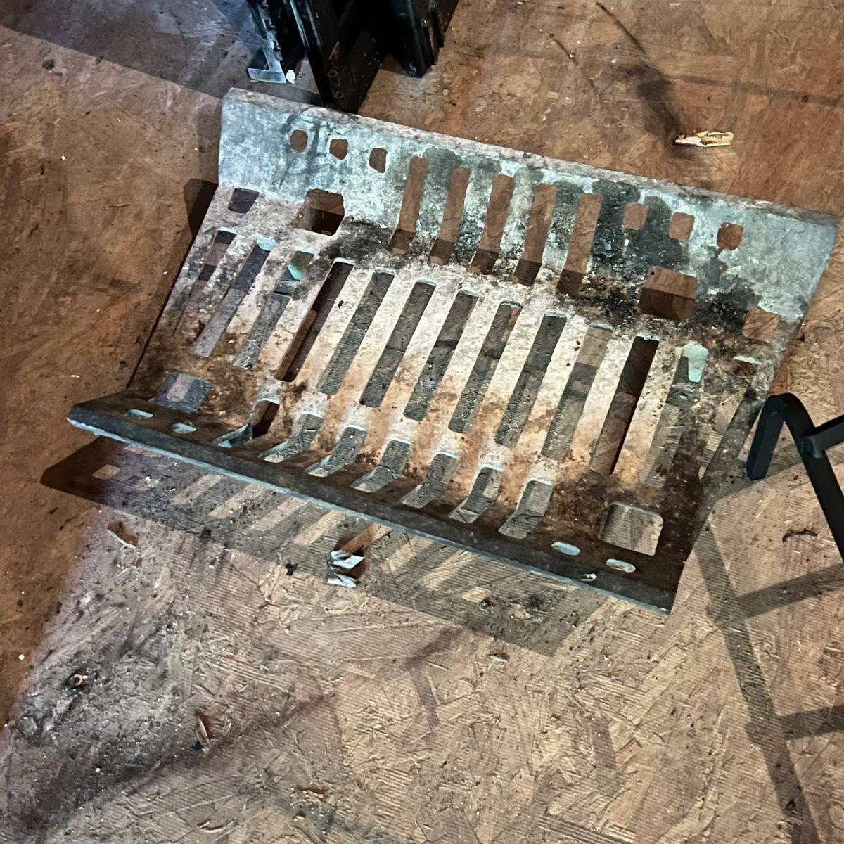 Two metal fireplace grate lot includes a lighter-weight black steel grate and a heavier grate that appears to be wrought iron. The heavier grate measures 21” x 14” x 10”H. Also included are Duraflame fire starter logs and sticks for indoor and outdoor use. Local pick up only.
