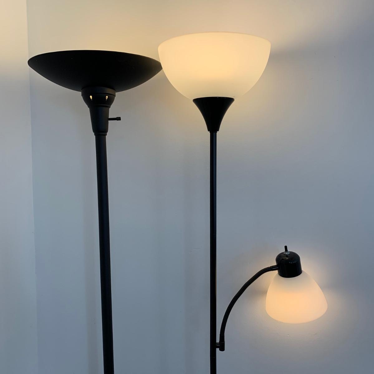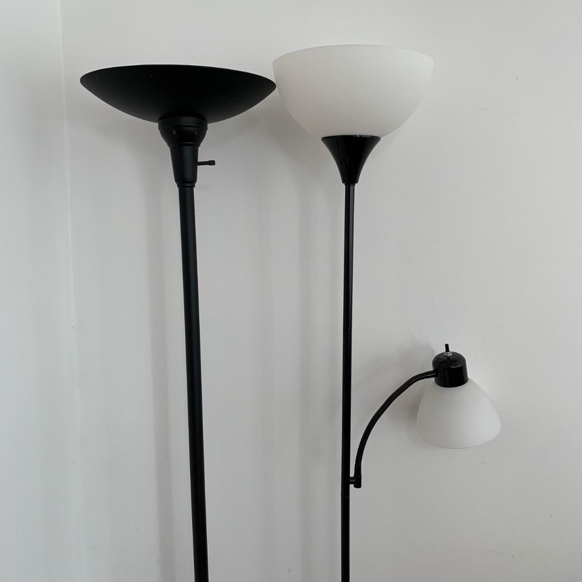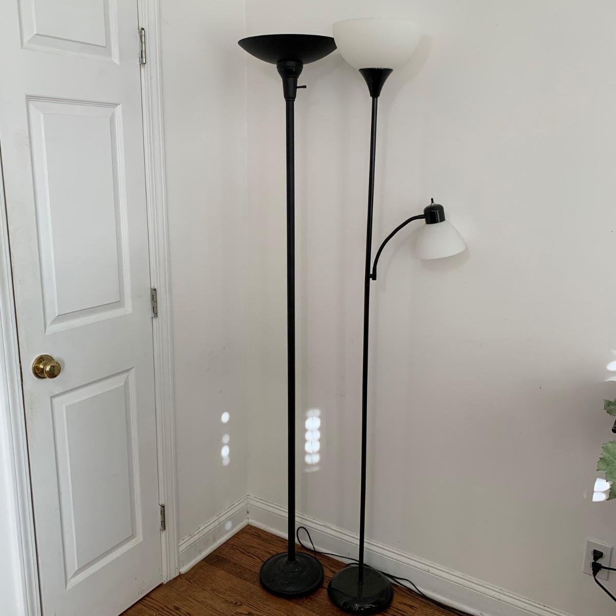 Two black floor lamps featuring single brightness setting. Black lamp measures approximately, 9.25”D x 71”H. Lamps powered on when plugged in. Please see photos for more details.