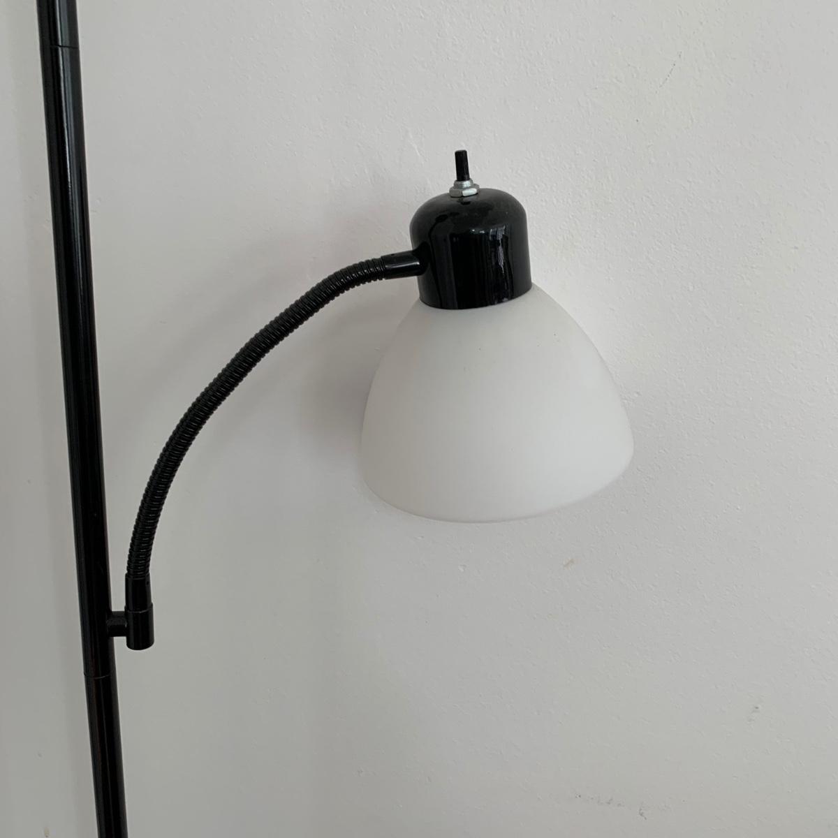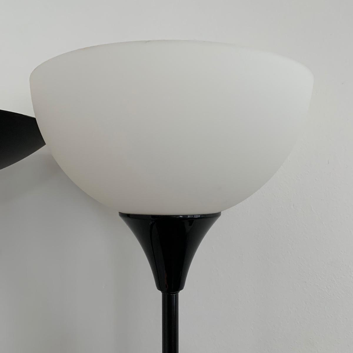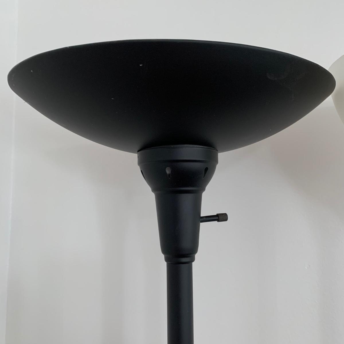 Two black floor lamps featuring single brightness setting. Black lamp measures approximately, 9.25”D x 71”H. Lamps powered on when plugged in. Please see photos for more details.