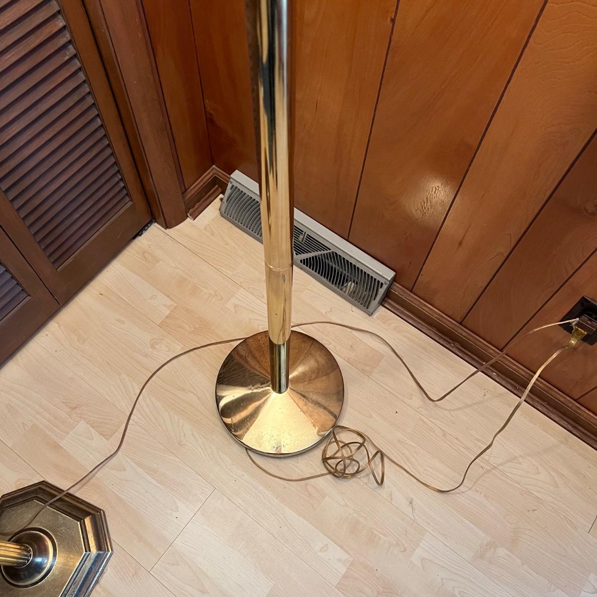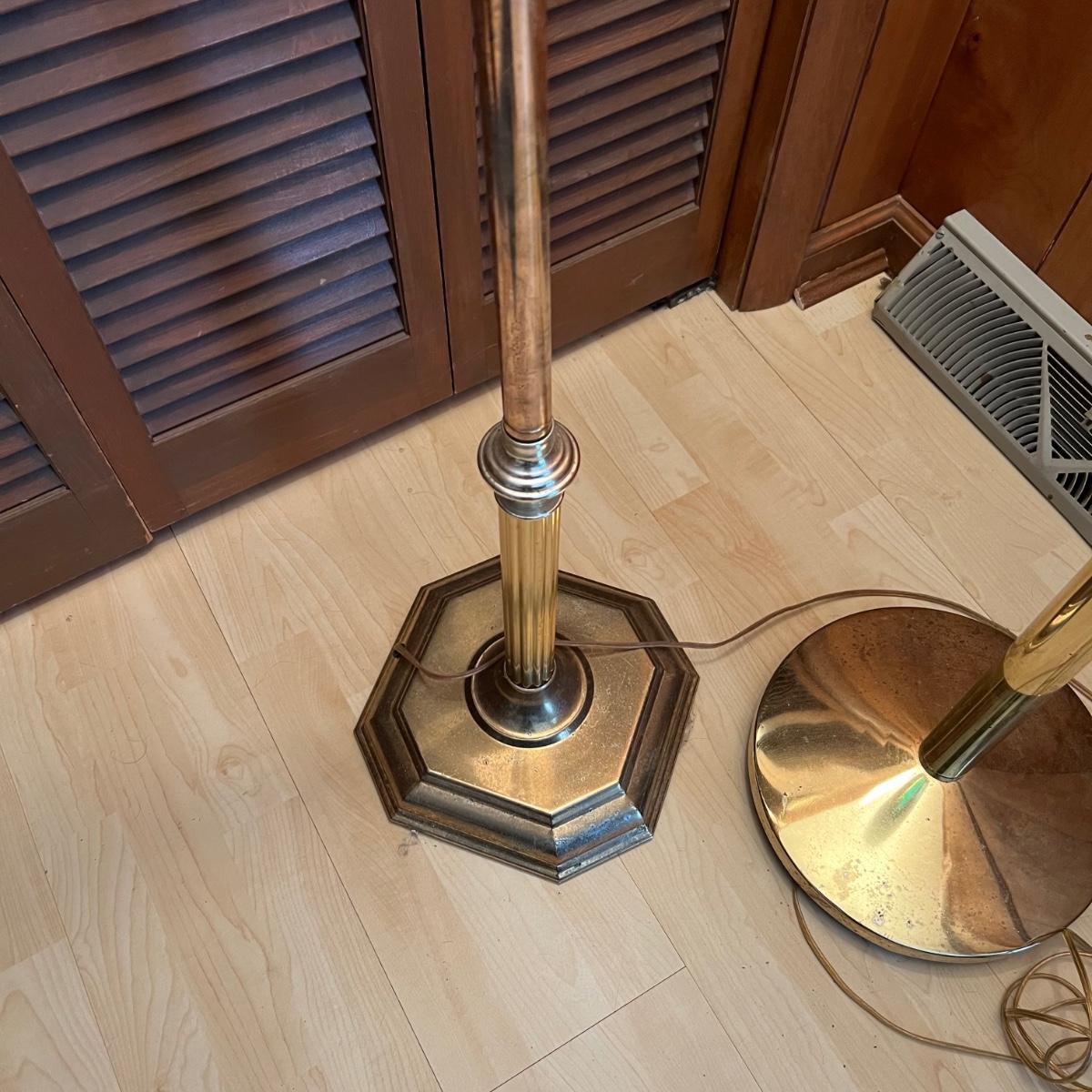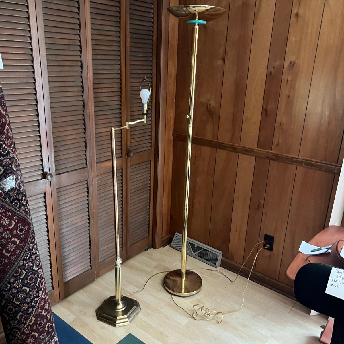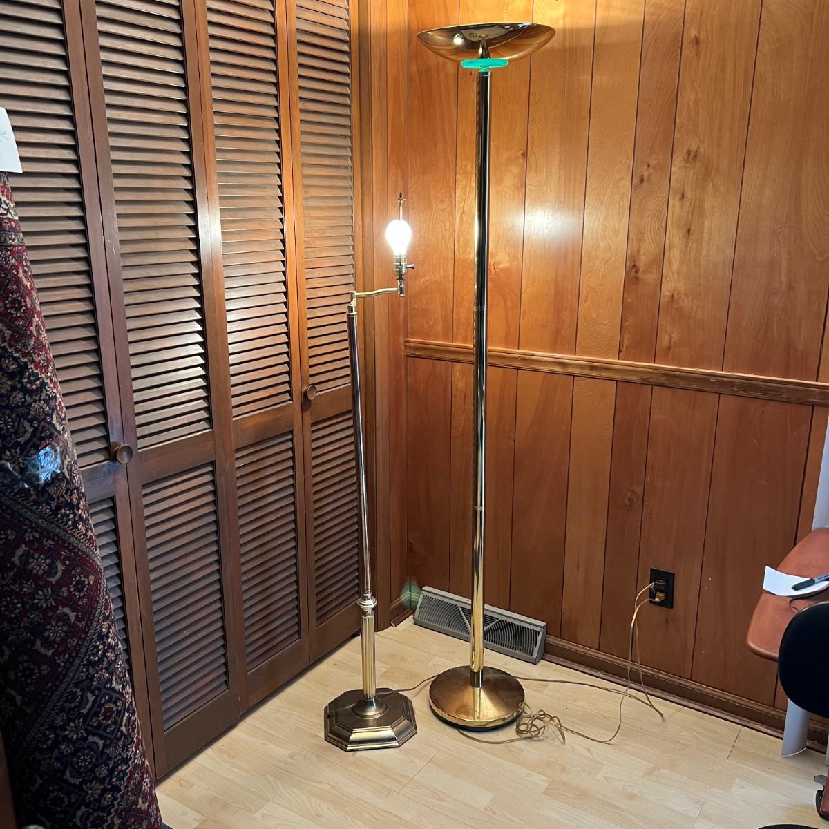 Both of these two floor lamps are gold colored metal. The lamp with up-lighting has a dimmer switch and measures 12”D (top) x 71”H. Both turned on when tested.