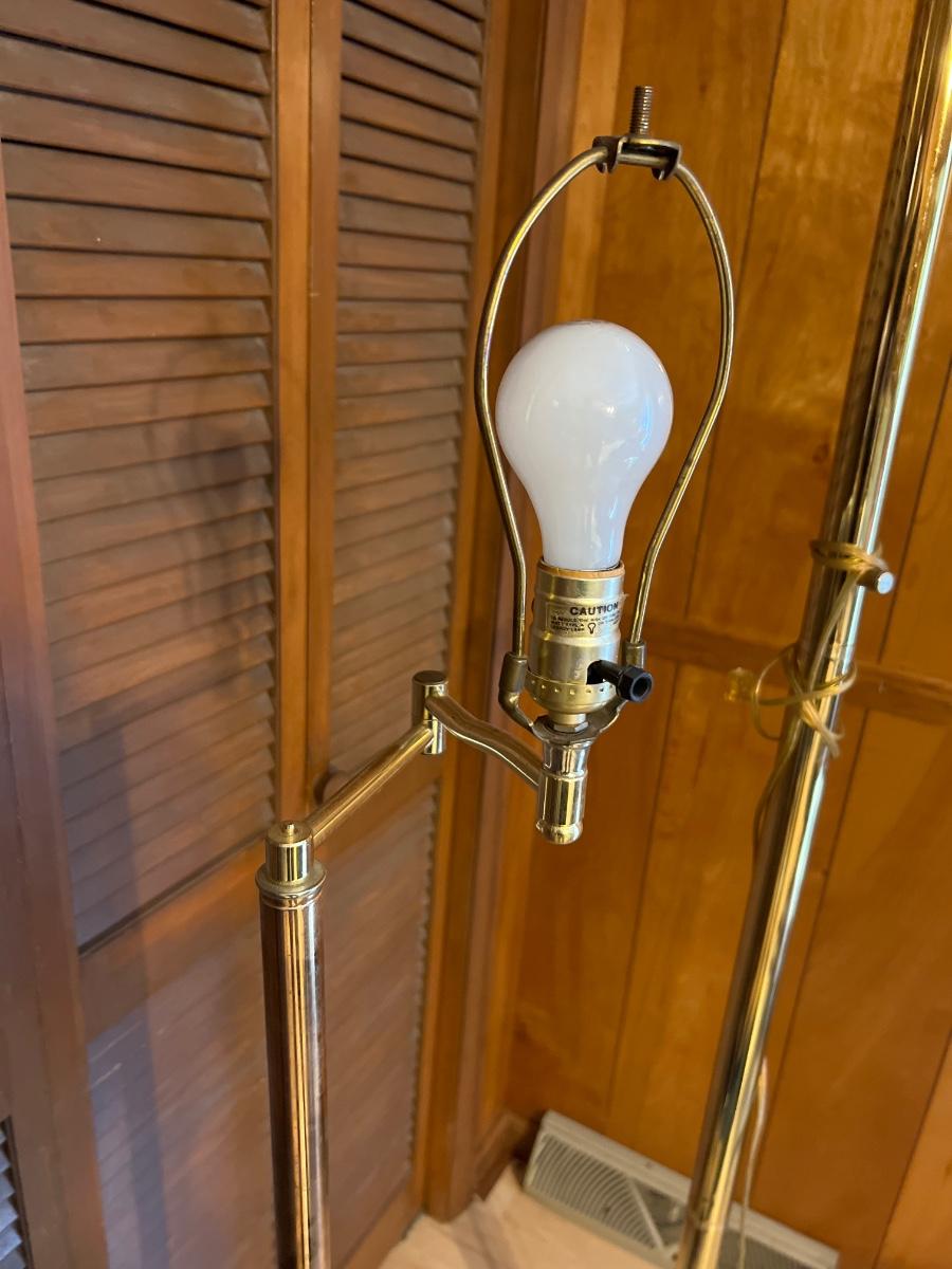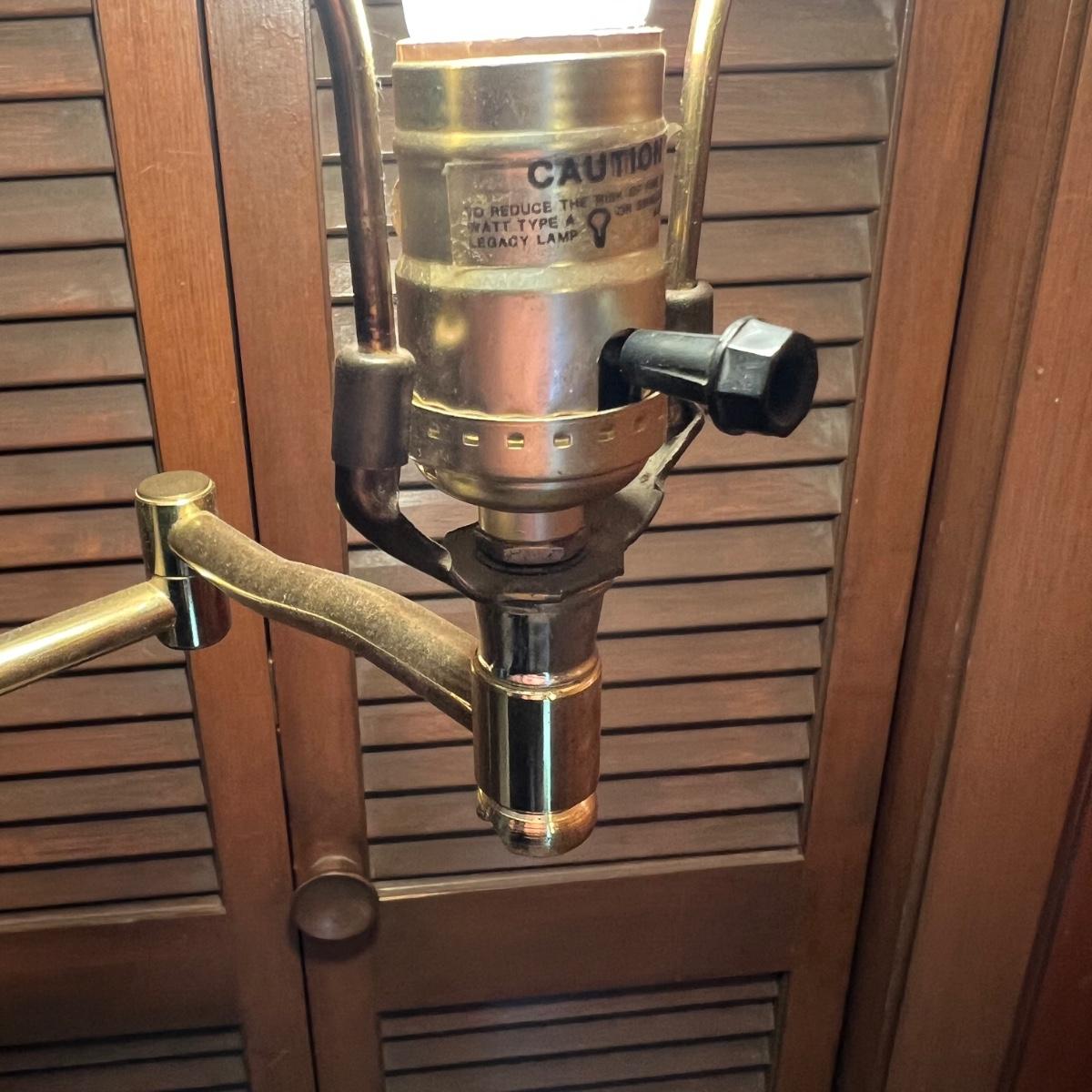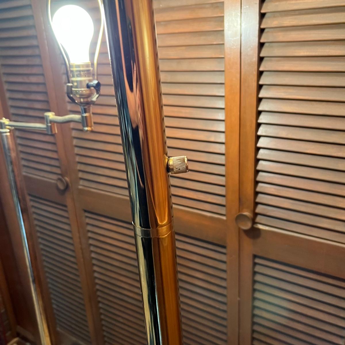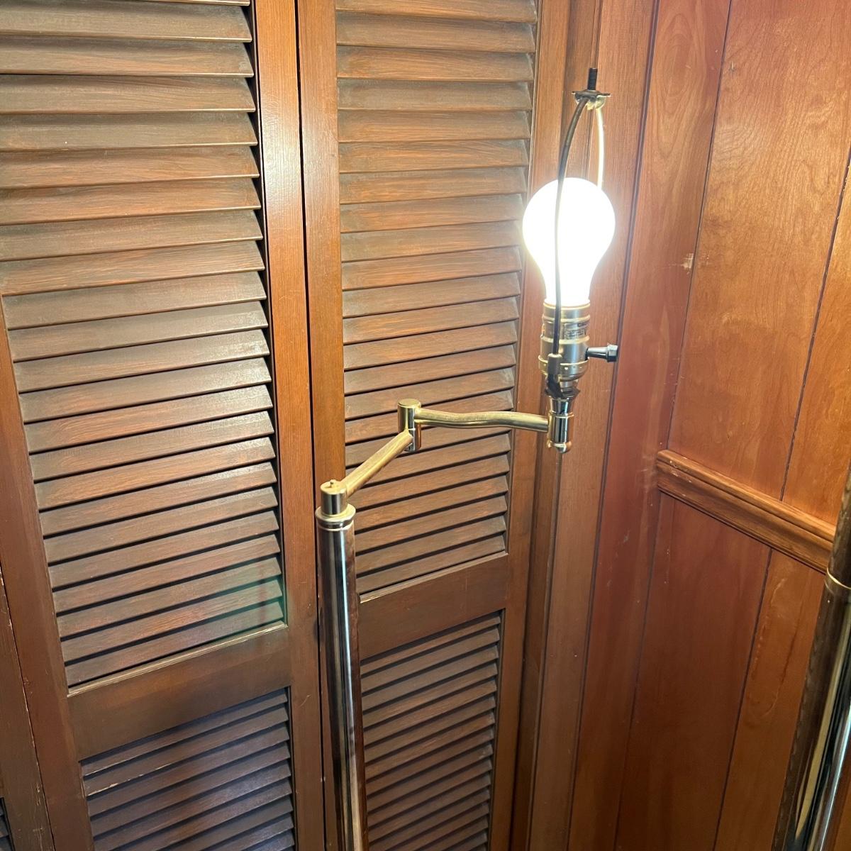 Both of these two floor lamps are gold colored metal. The lamp with up-lighting has a dimmer switch and measures 12”D (top) x 71”H. Both turned on when tested.