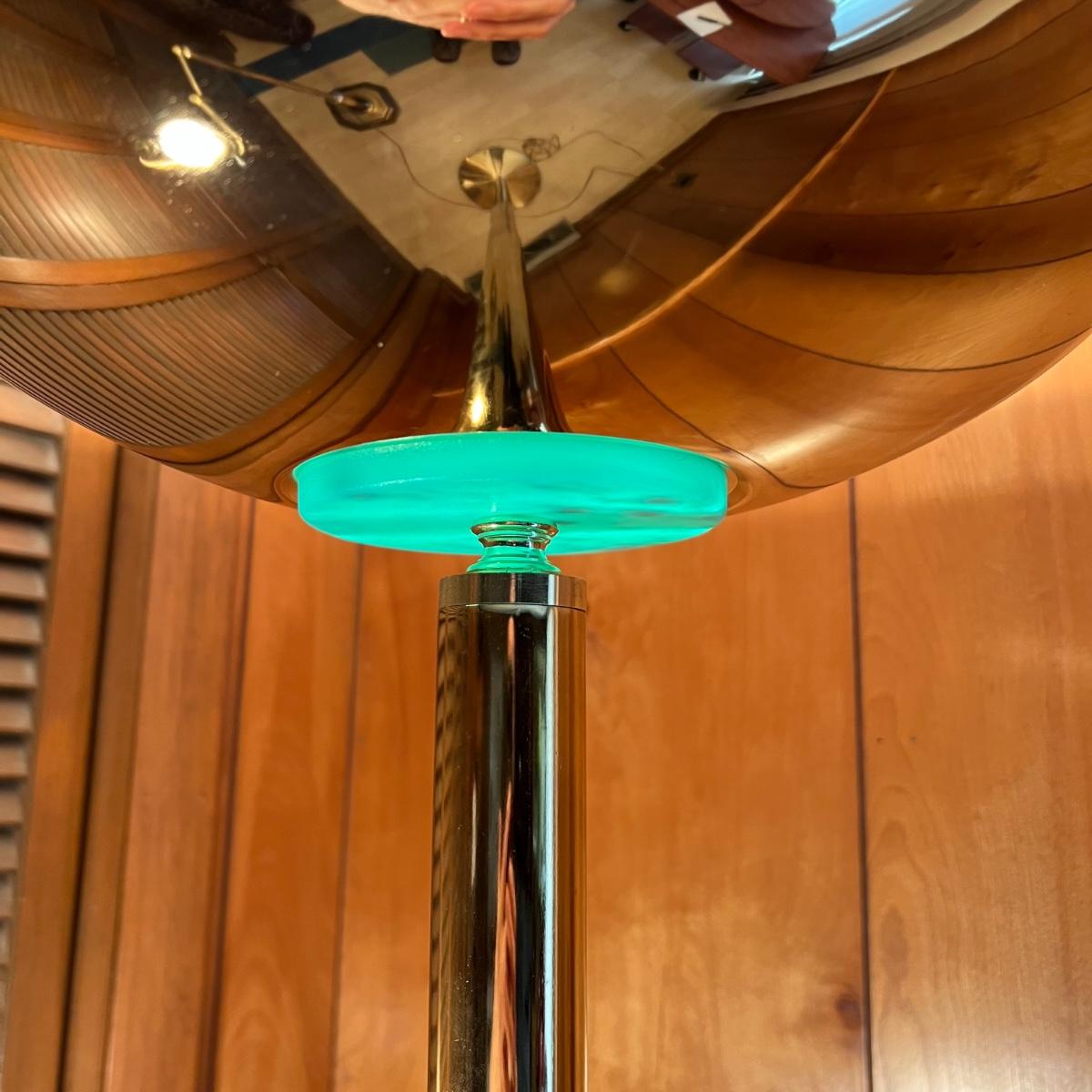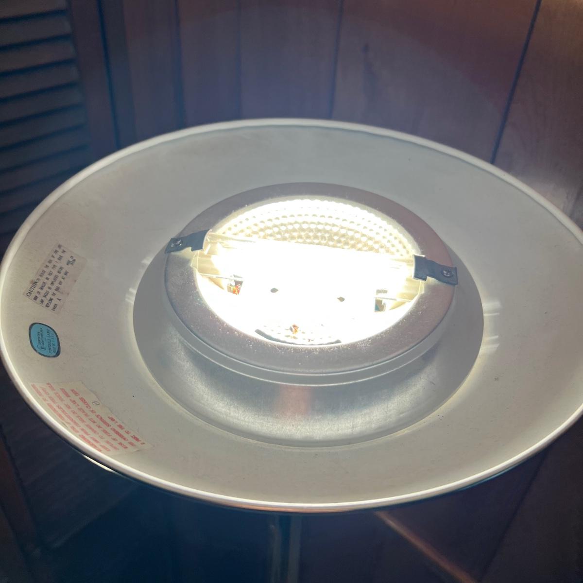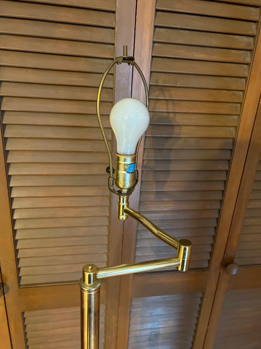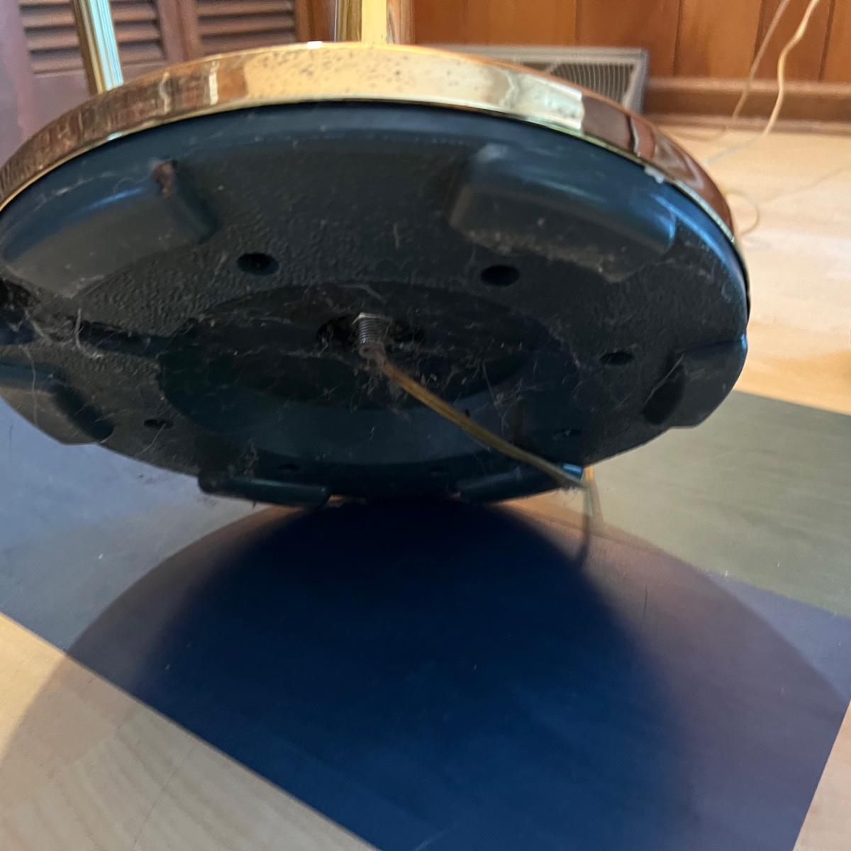 Both of these two floor lamps are gold colored metal. The lamp with up-lighting has a dimmer switch and measures 12”D (top) x 71”H. Both turned on when tested.