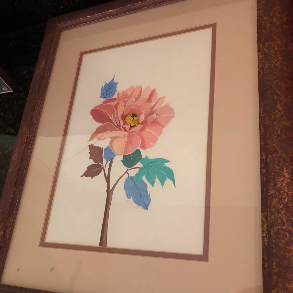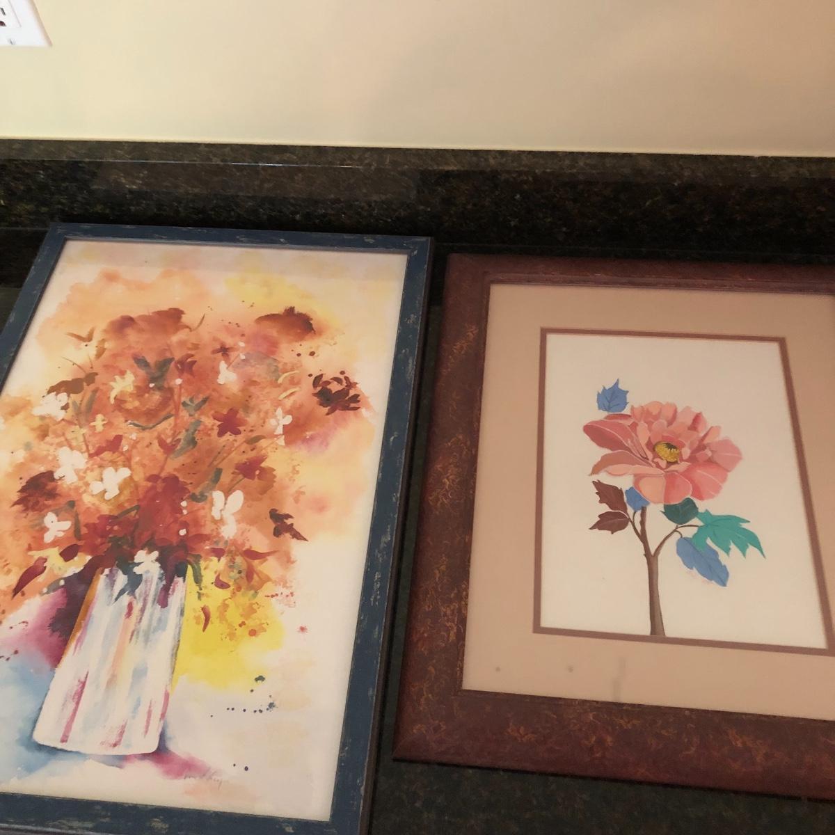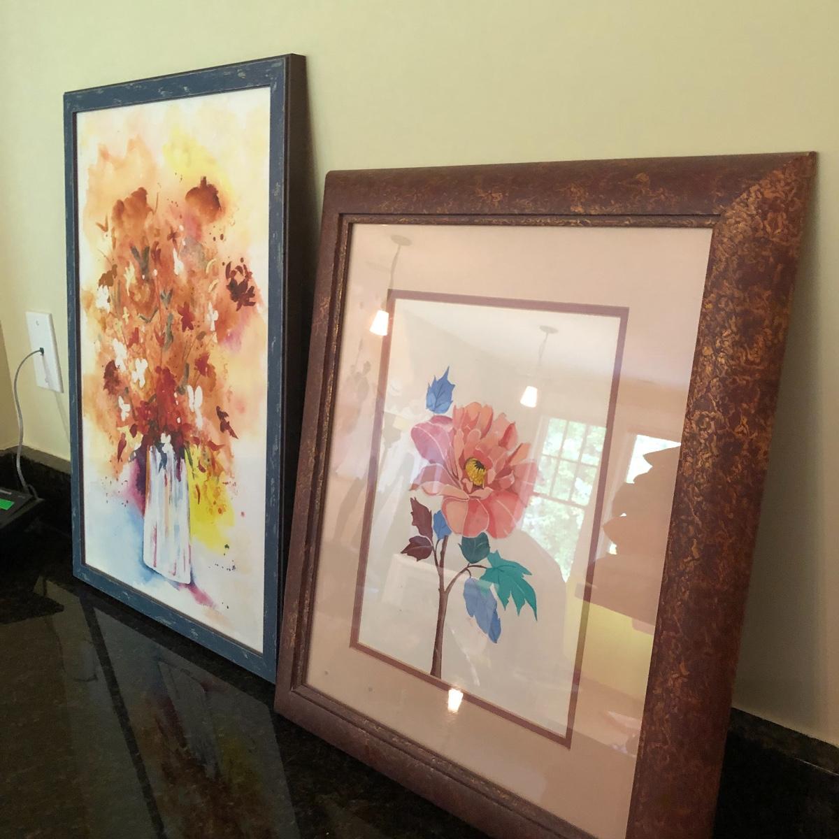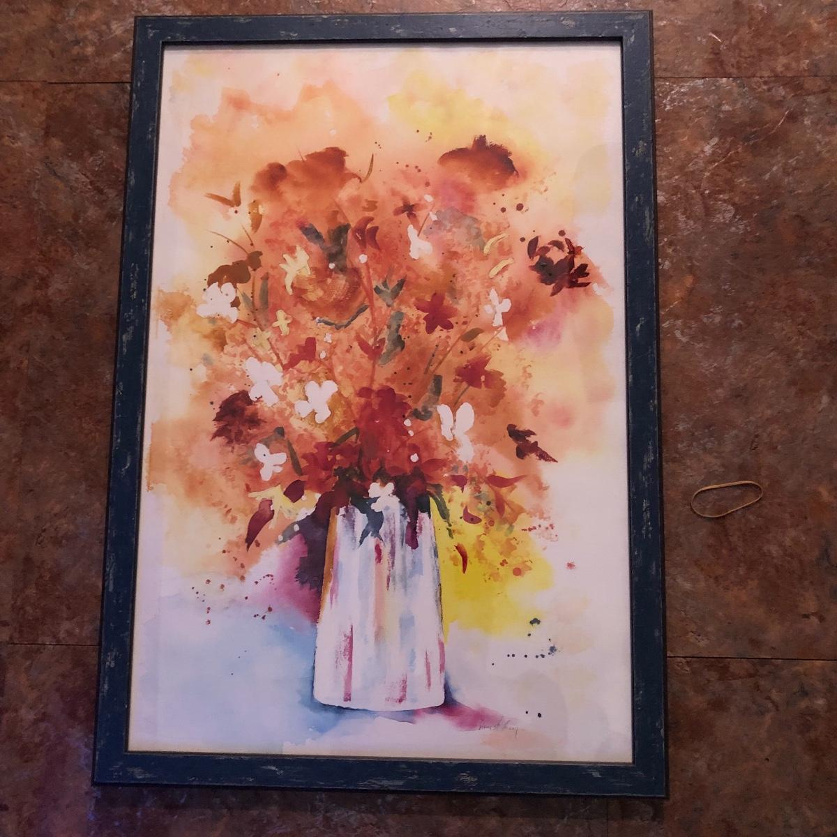 This lot contains two watercolors painted by Diane Levy. The orange floral in a Grey wooden frame measures 16.5” x 24”. The smaller flower in a brown wooden frame measures 17” x 20”. Shipping Available. If shipping, please call UPS for an estimate.