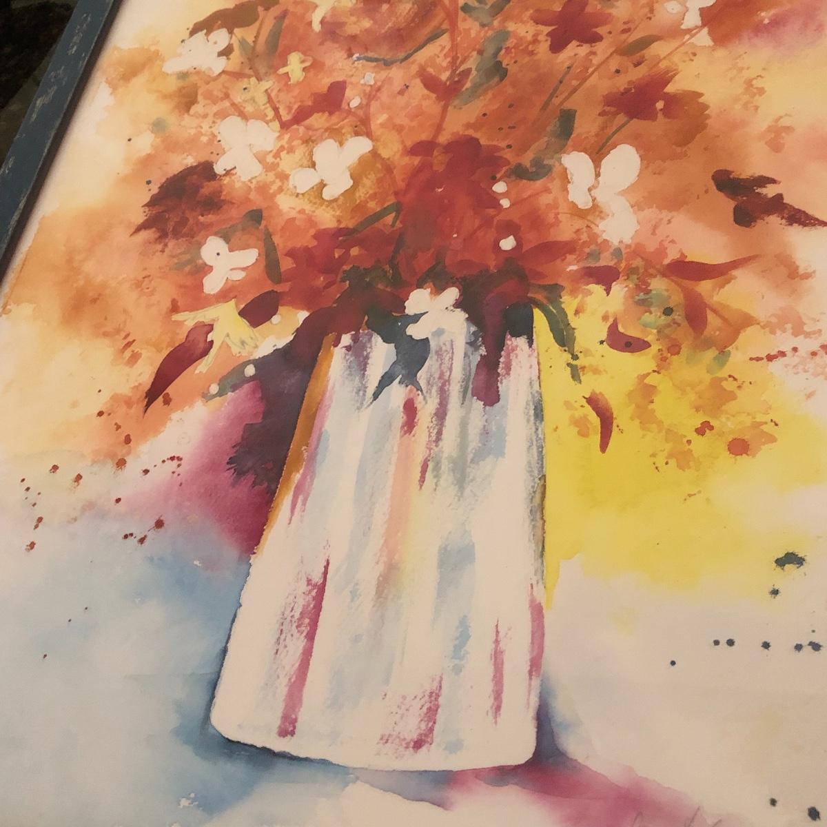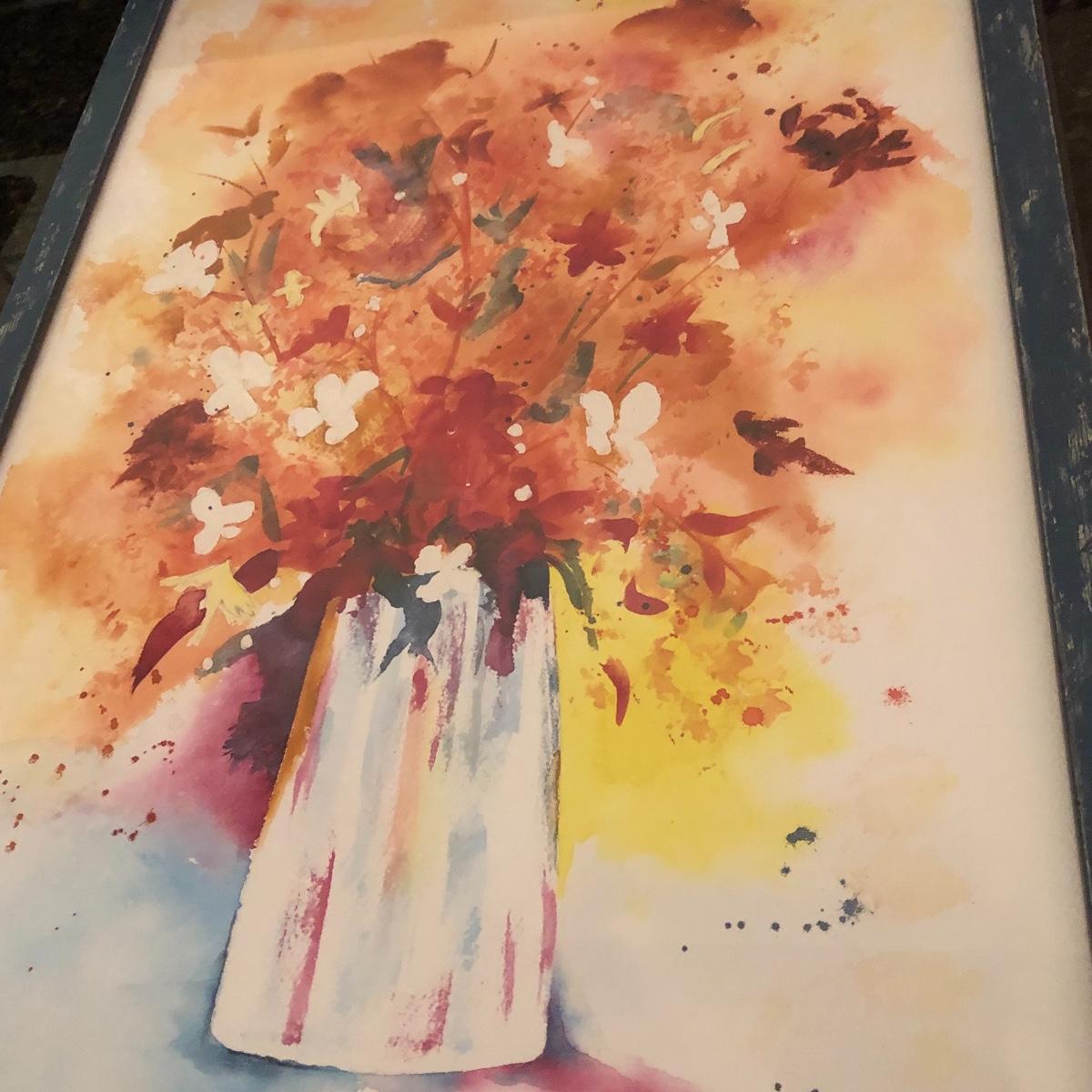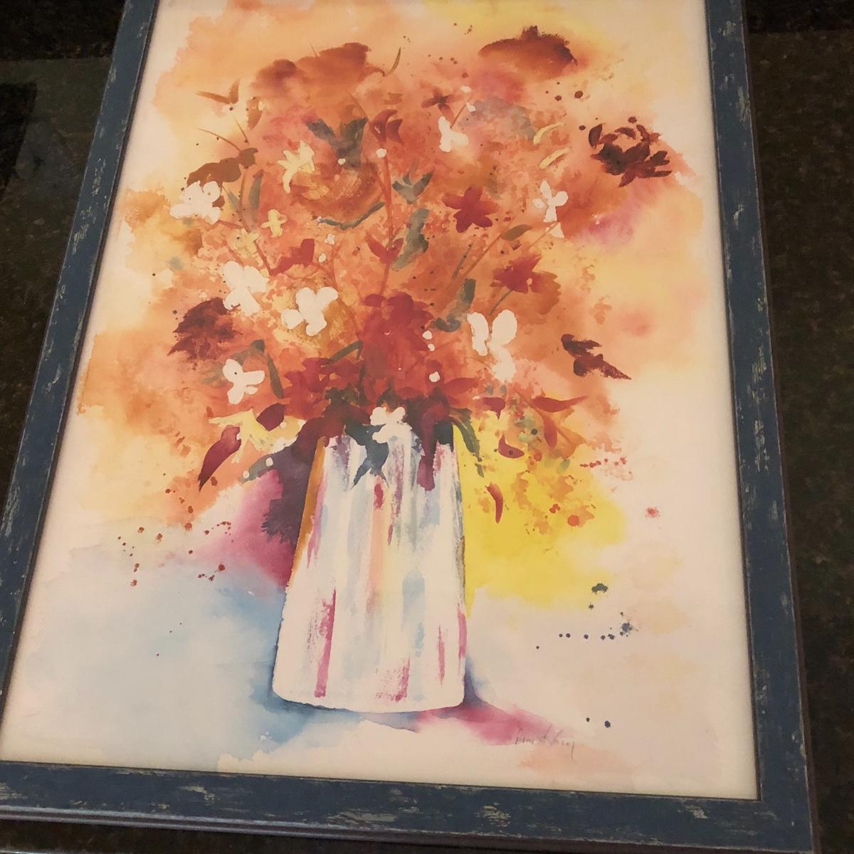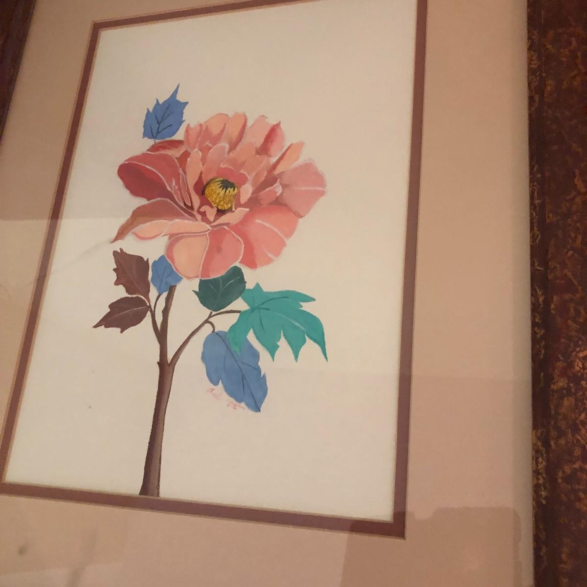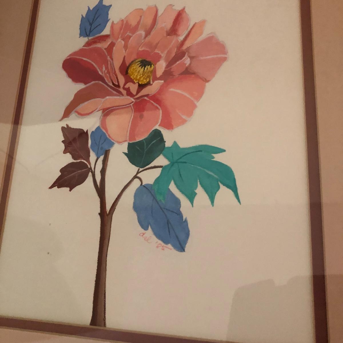 This lot contains two watercolors painted by Diane Levy. The orange floral in a Grey wooden frame measures 16.5” x 24”. The smaller flower in a brown wooden frame measures 17” x 20”. Shipping Available. If shipping, please call UPS for an estimate.