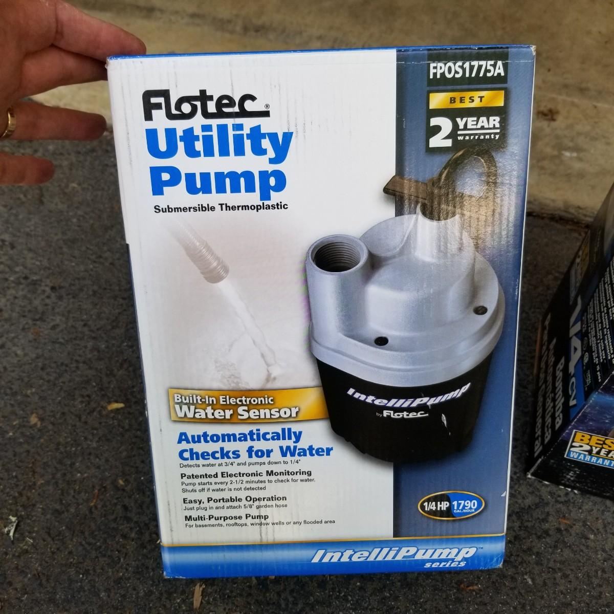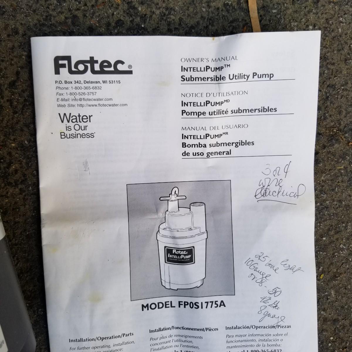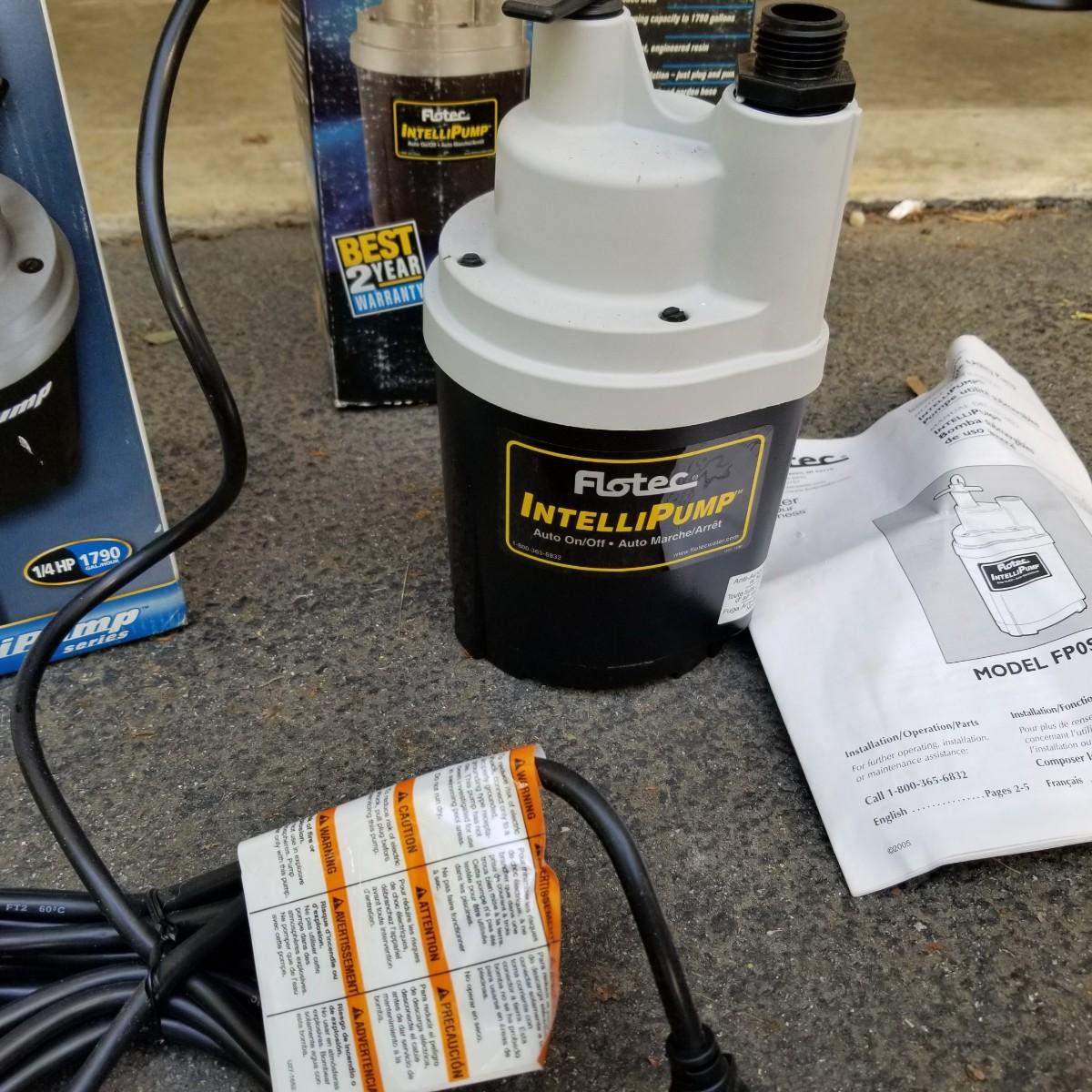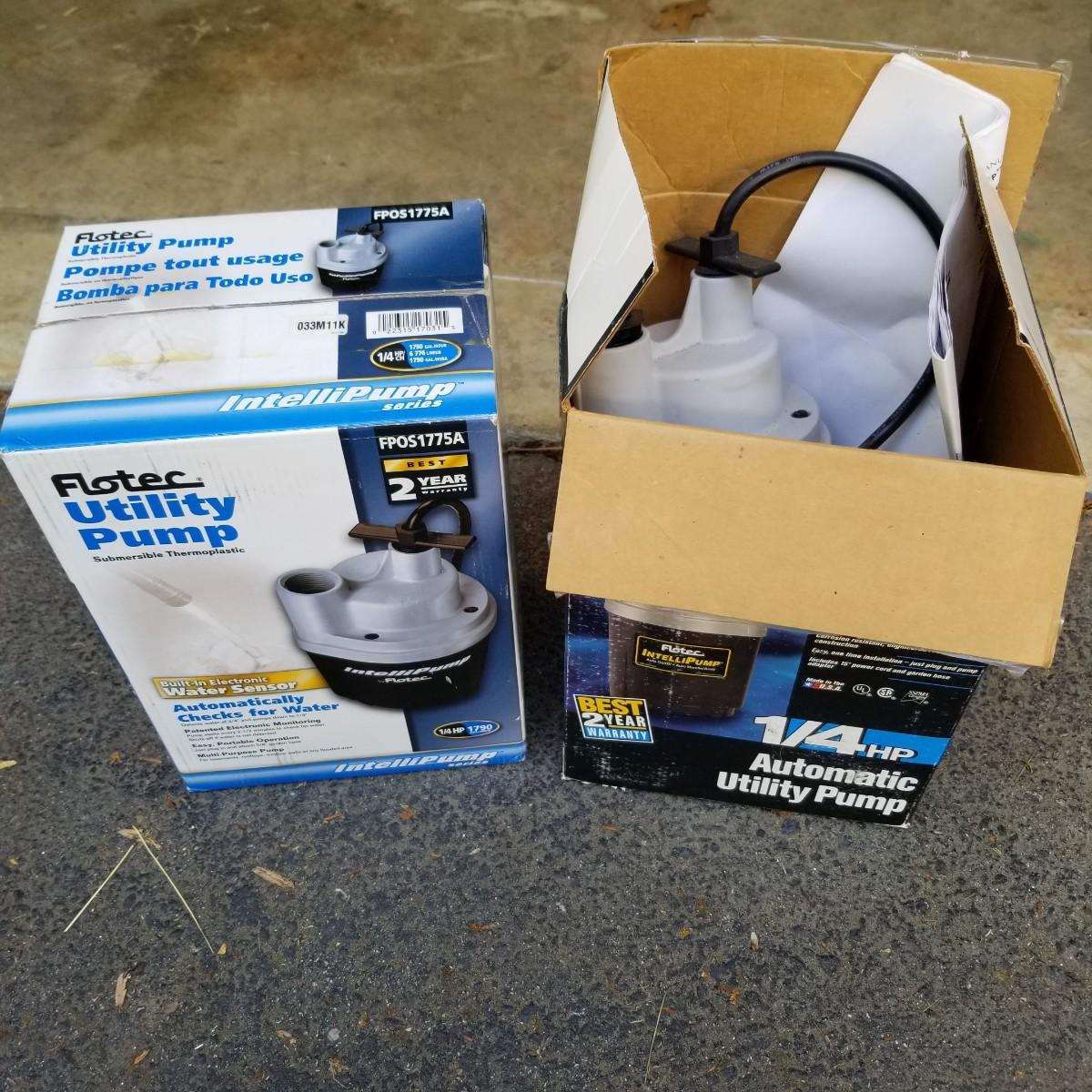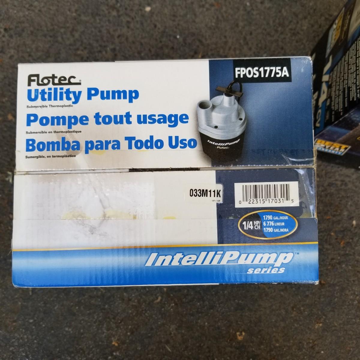 A pair of new in box Flotec pumps, part of their Intellipump Series. 1/4 horsepower, 1790 gal/hr capacity. Model FPOS1775A. Not tested. Shipping available.