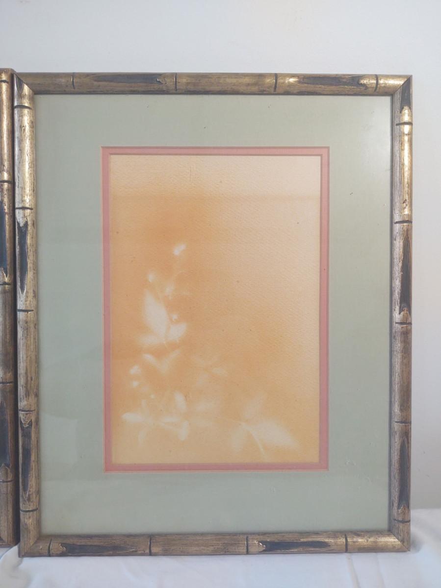 Look carefully at this unique artwork and you'll see where flowers and fauna have been pressed or laid onto the board and then the board is painted around them leaving the impression where the fauna was placed before the painting.