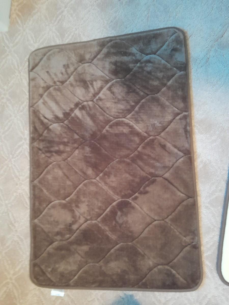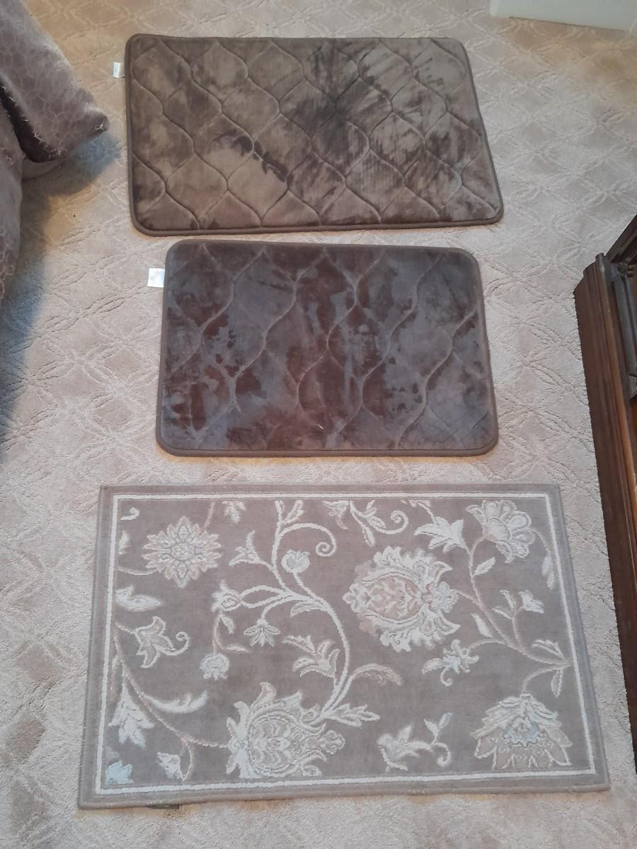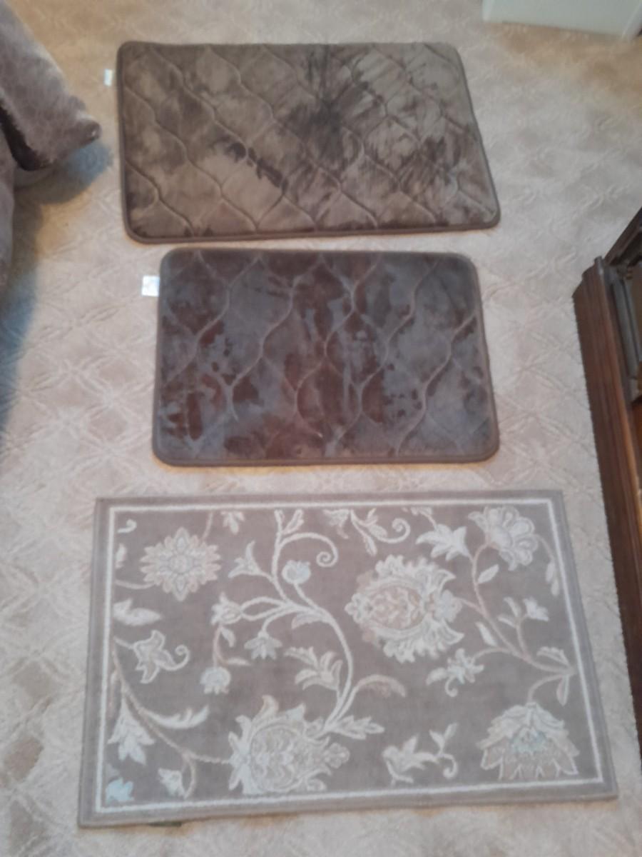 TWO BROWN SOFT FOAM BATHMATS, 30" X 20" AND 24.5" X 7.5"AND A RUBBER BACKED RUG 32" X 19"