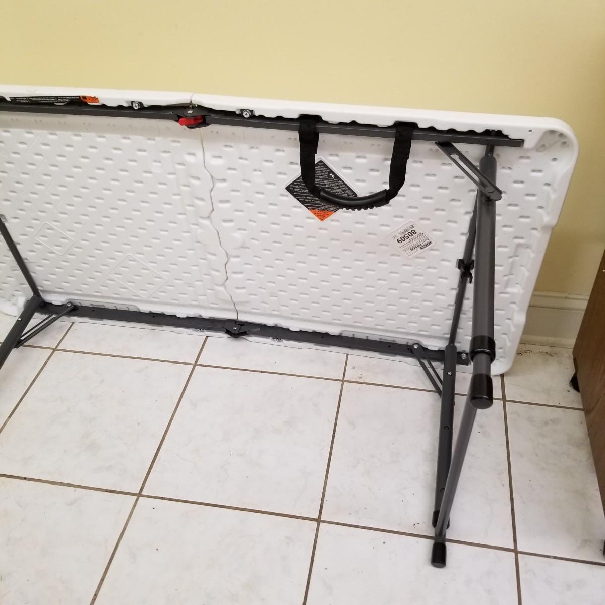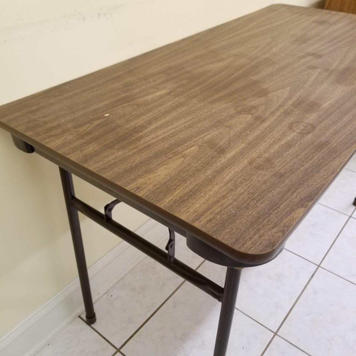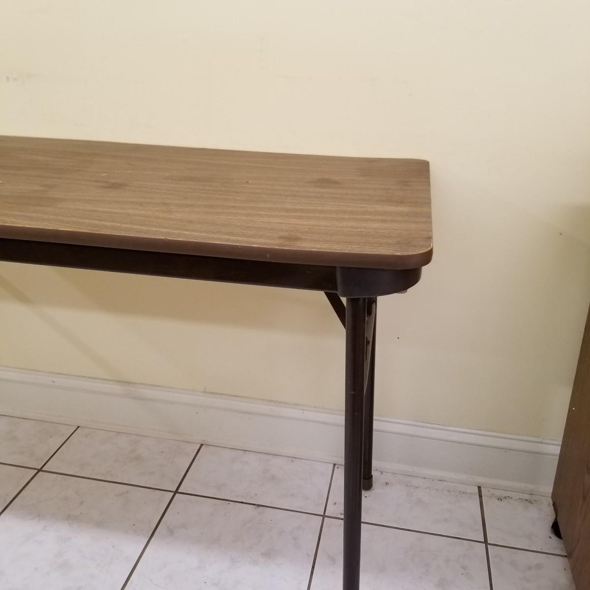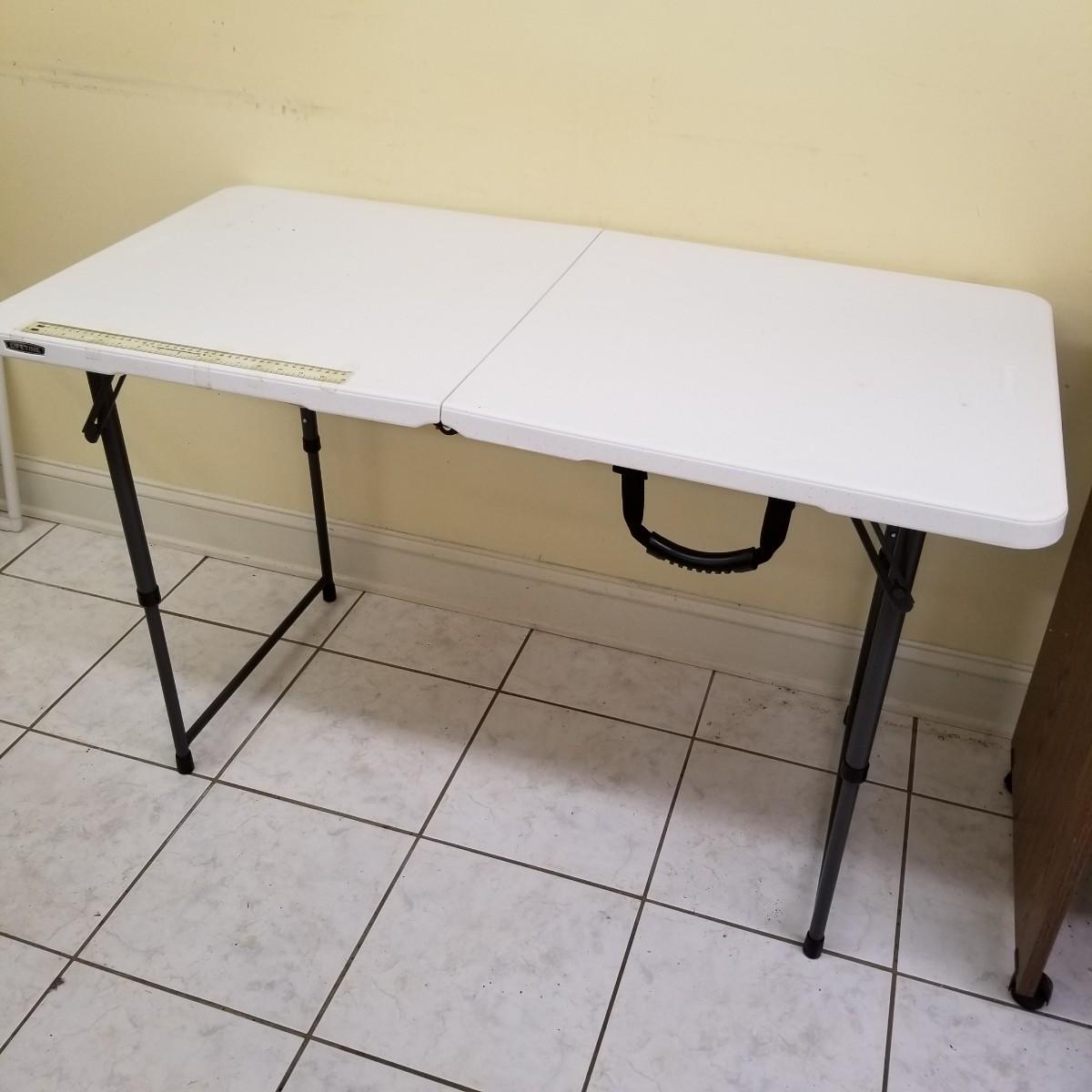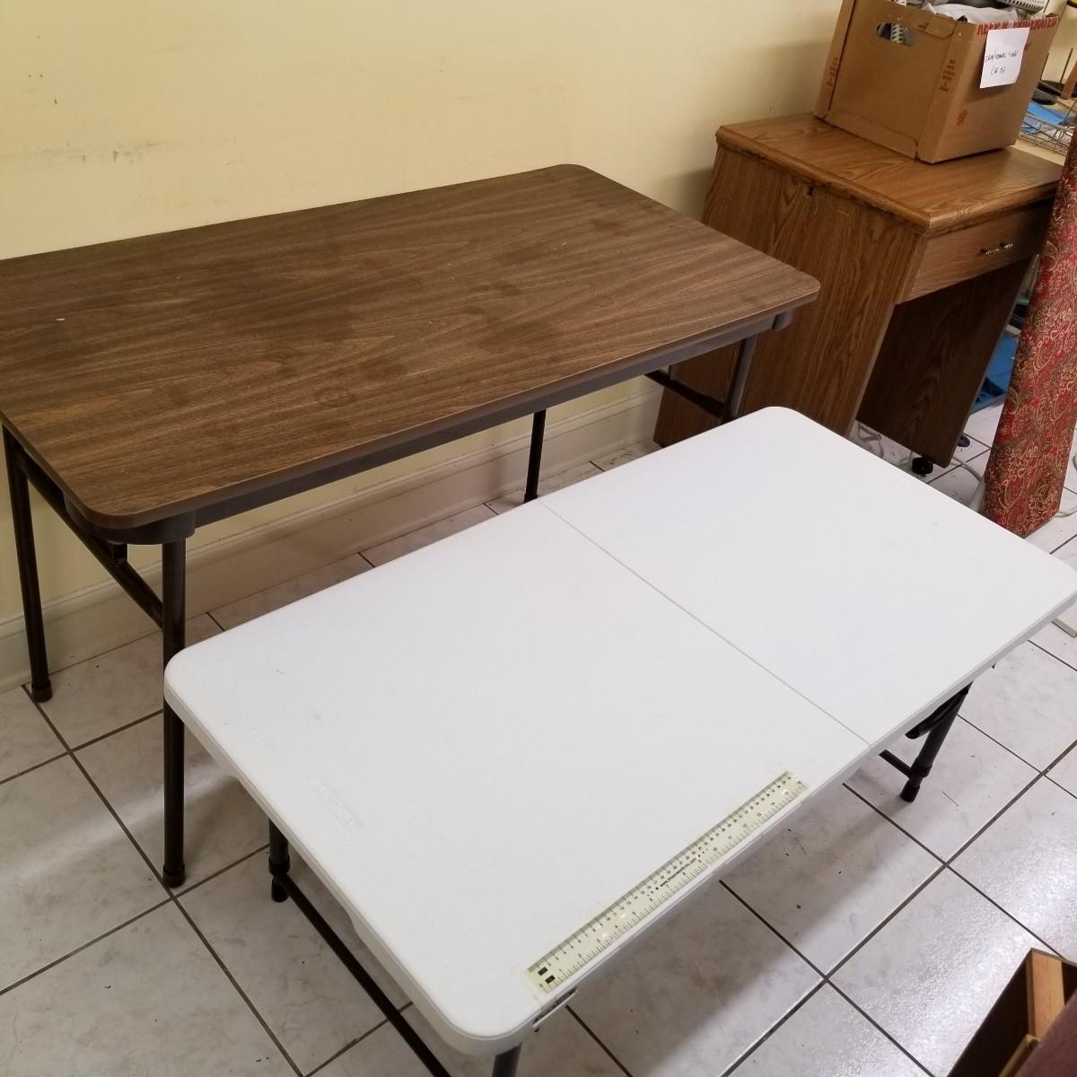 A pair of smaller folding tables, one with adjustable height. Brown table is particle board/laminate top, measures 48"x24"x29". White table is 24"x24"3" closed, opens to 48"x23" and height adjustable from 19"to 29". See photos for details. Local pickup only.