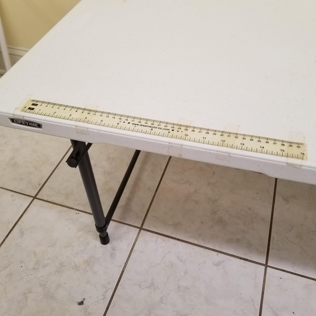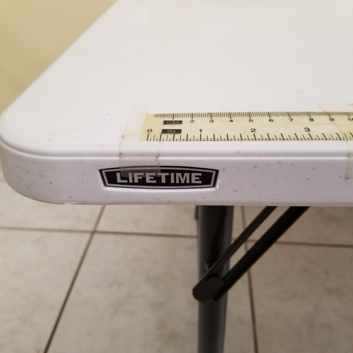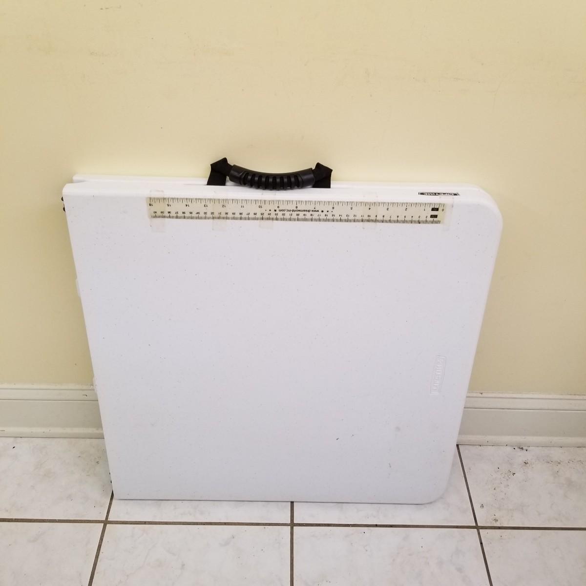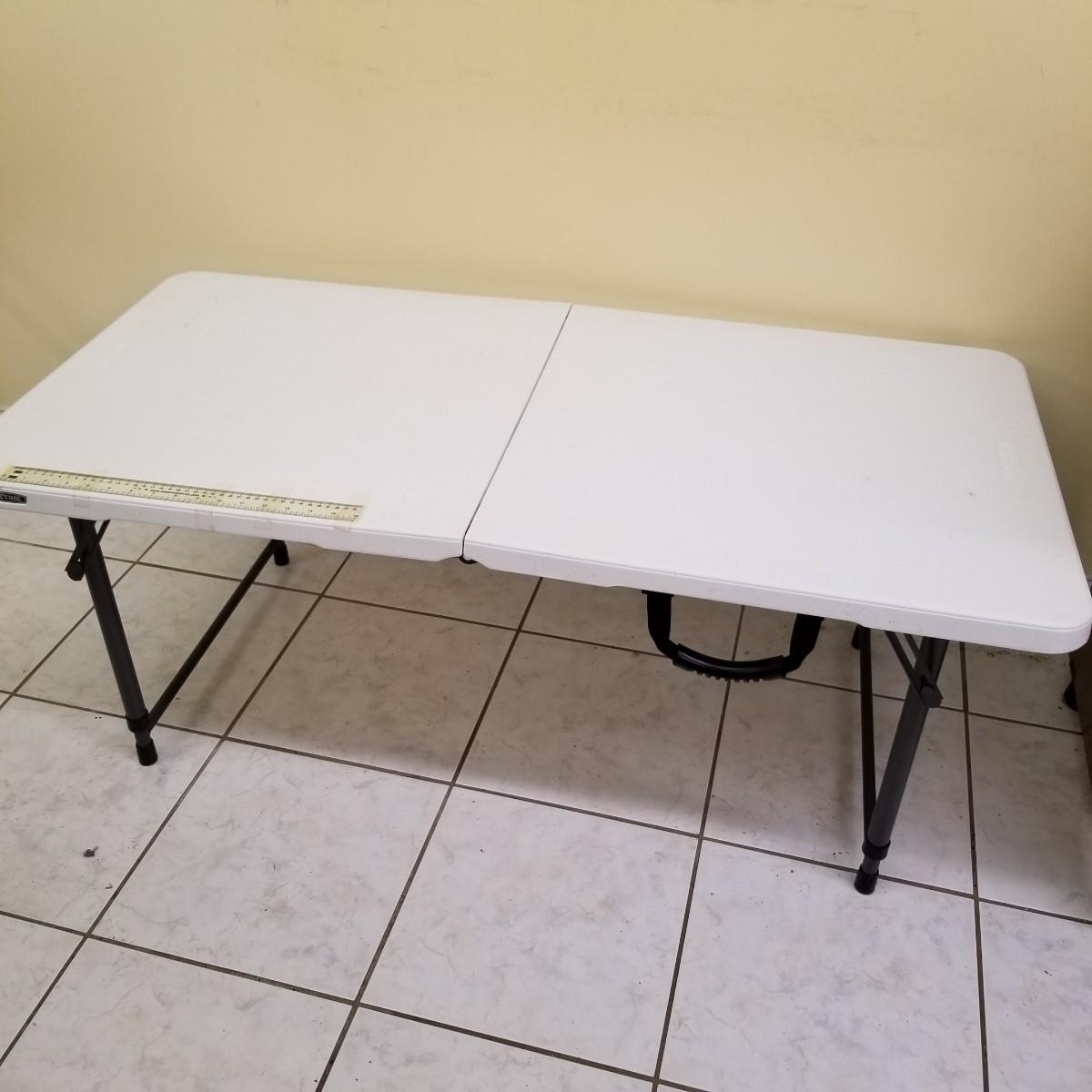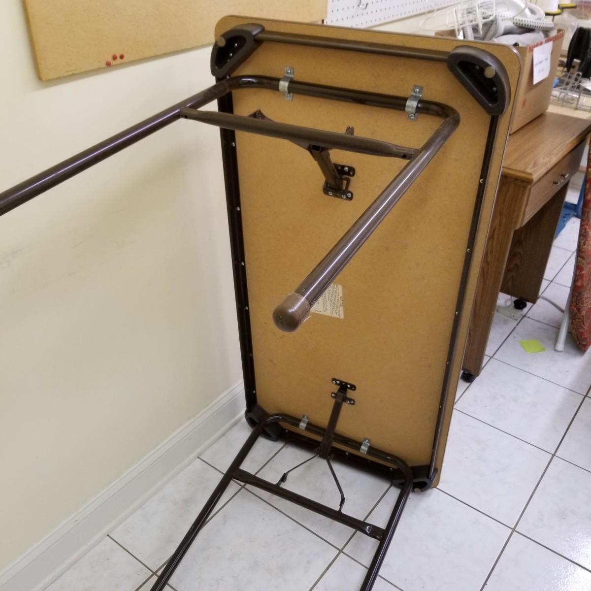 A pair of smaller folding tables, one with adjustable height. Brown table is particle board/laminate top, measures 48"x24"x29". White table is 24"x24"3" closed, opens to 48"x23" and height adjustable from 19"to 29". See photos for details. Local pickup only.
