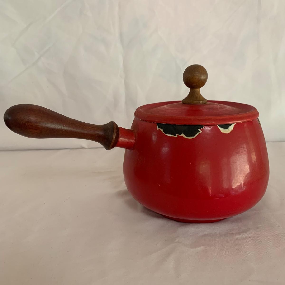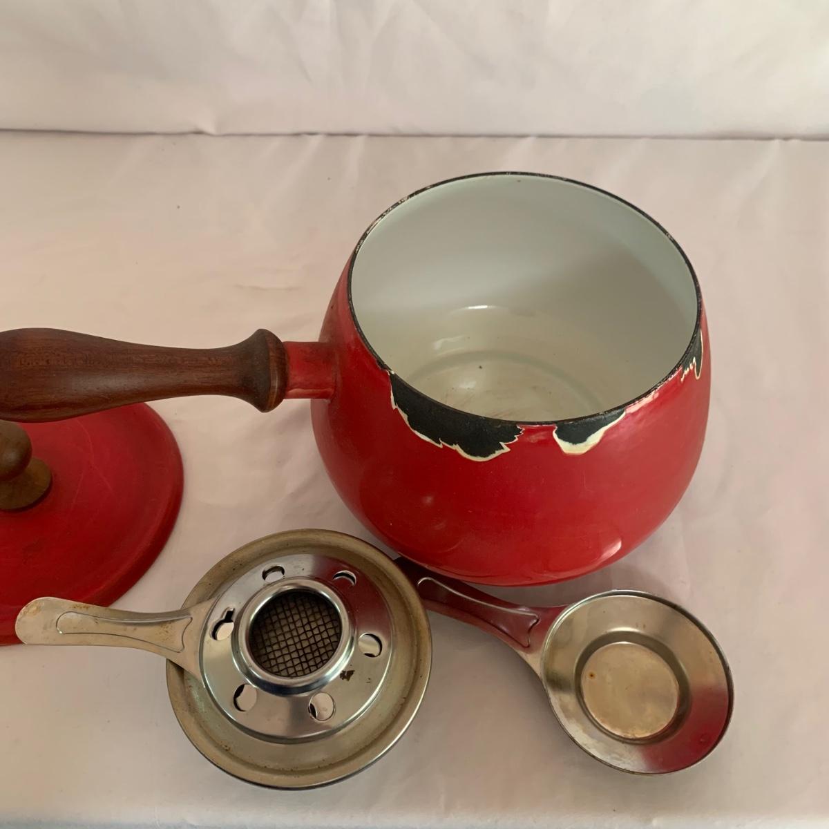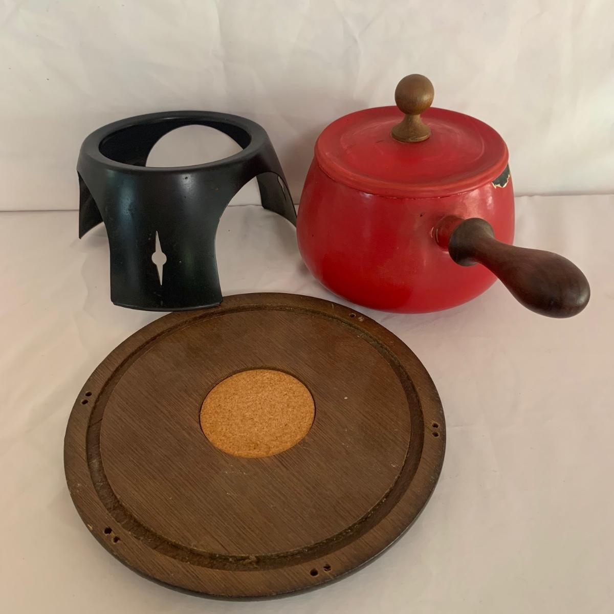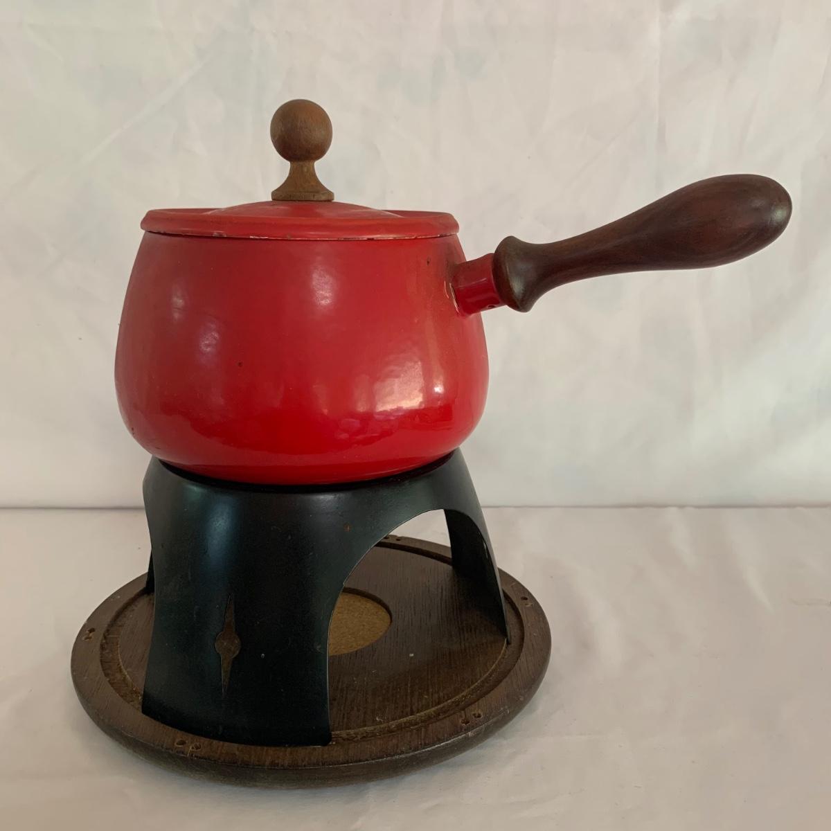In this lot there are two vintage metal fondue pots, both powered by cooking fuel, as well as six fondue dipping forks with wood handles and Southern Living’s “The Fondue and Buffet Cookbook”. Both pots are metal with wooden handles. The copper colored pot sits on a metal stand. With the stand, this item measures approximately 10.5”d x 10”h (not including the side handle). The red enameled pot has a wood base with a metal stand. Both show some wear on their surfaces, but seem to be in good functional condition.