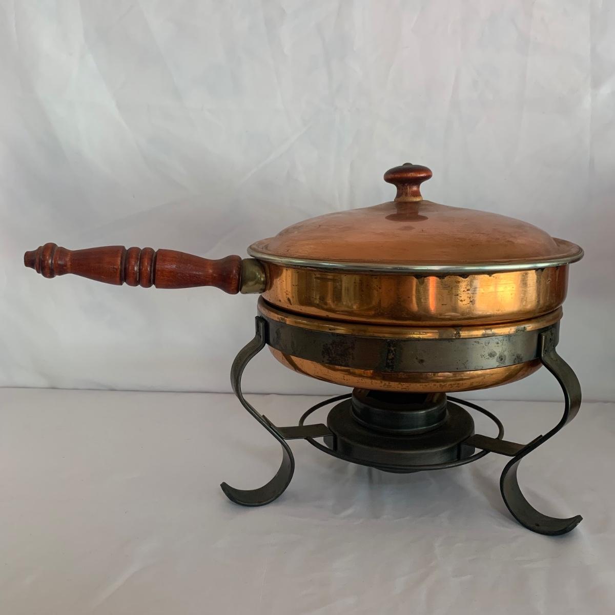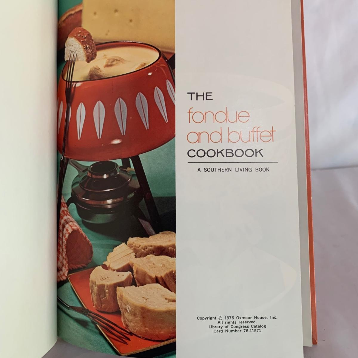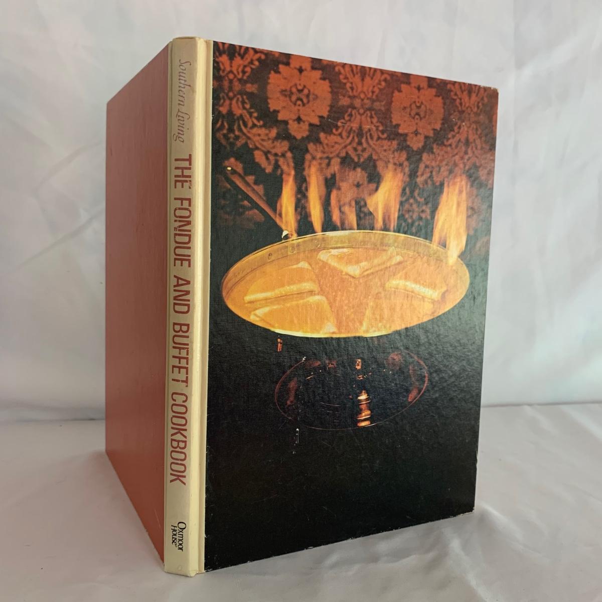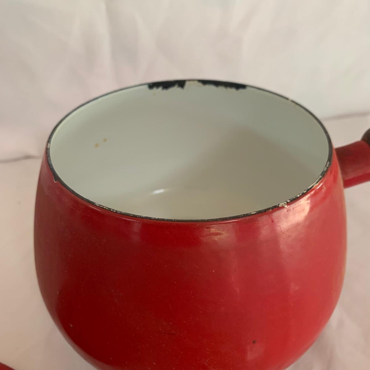 In this lot there are two vintage metal fondue pots, both powered by cooking fuel, as well as six fondue dipping forks with wood handles and Southern Living’s “The Fondue and Buffet Cookbook”. Both pots are metal with wooden handles. The copper colored pot sits on a metal stand. With the stand, this item measures approximately 10.5”d x 10”h (not including the side handle). The red enameled pot has a wood base with a metal stand. Both show some wear on their surfaces, but seem to be in good functional condition.