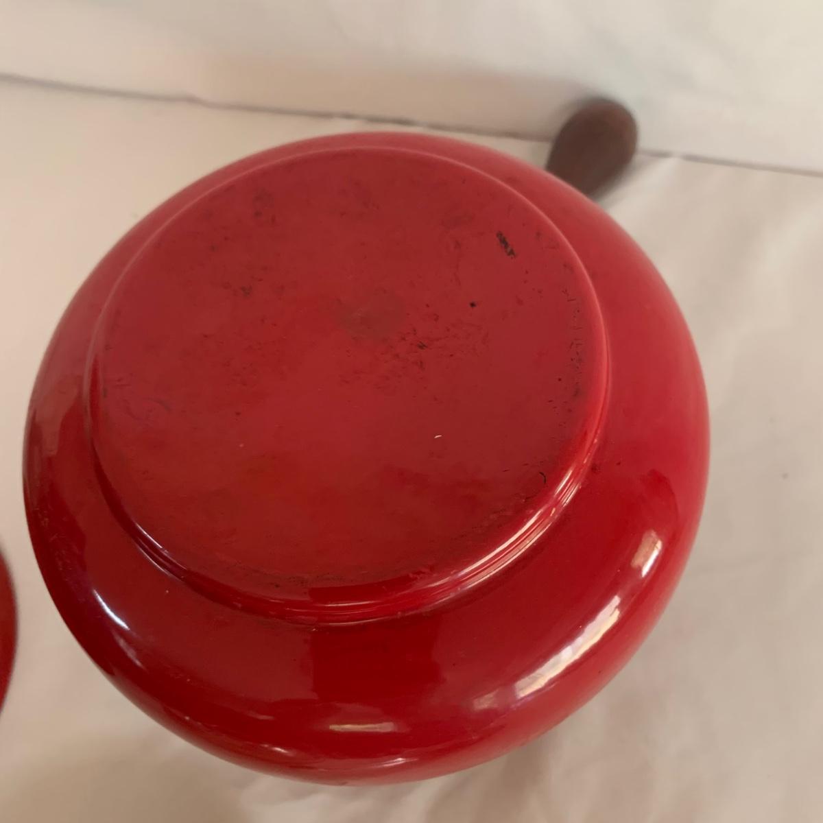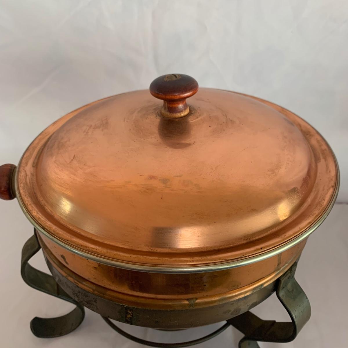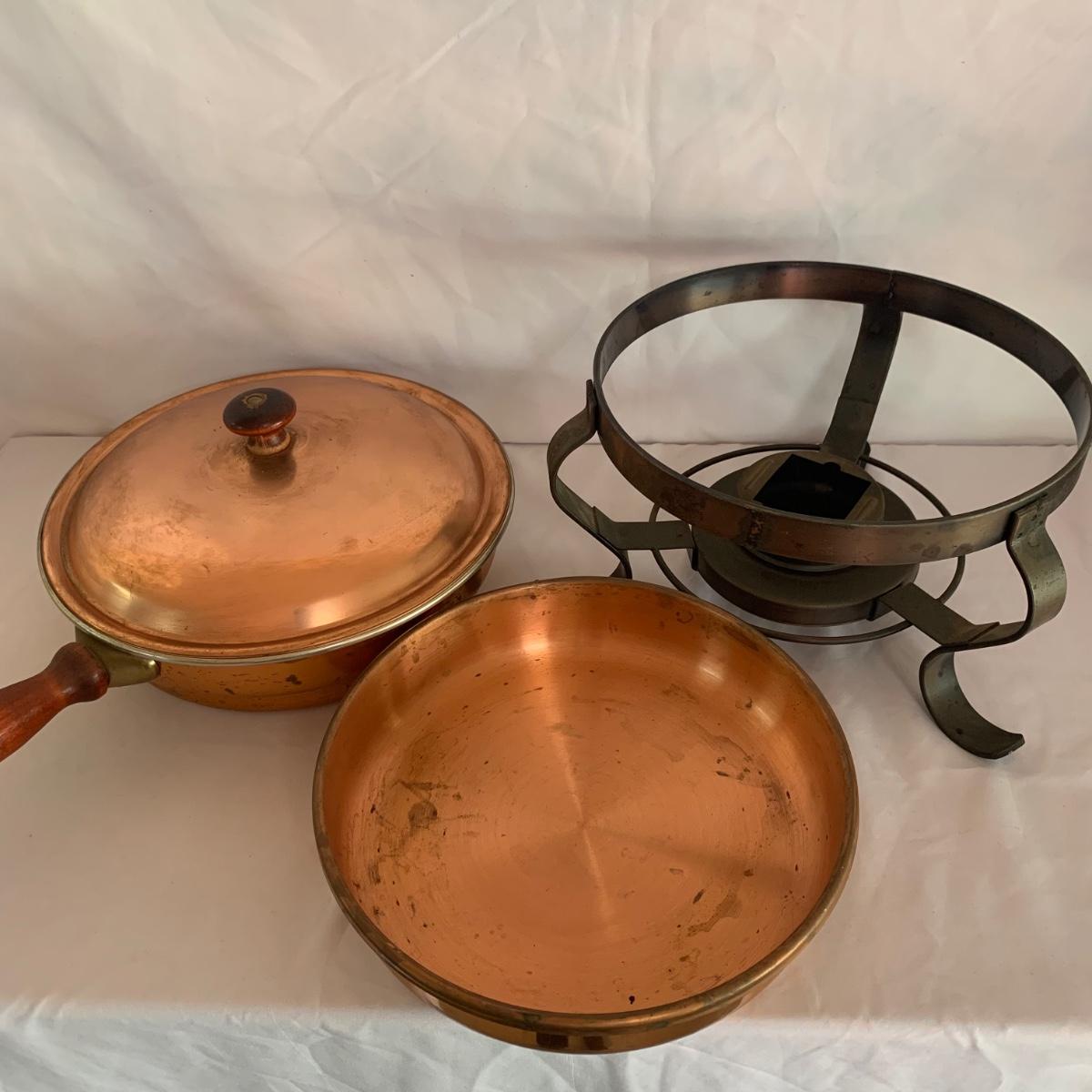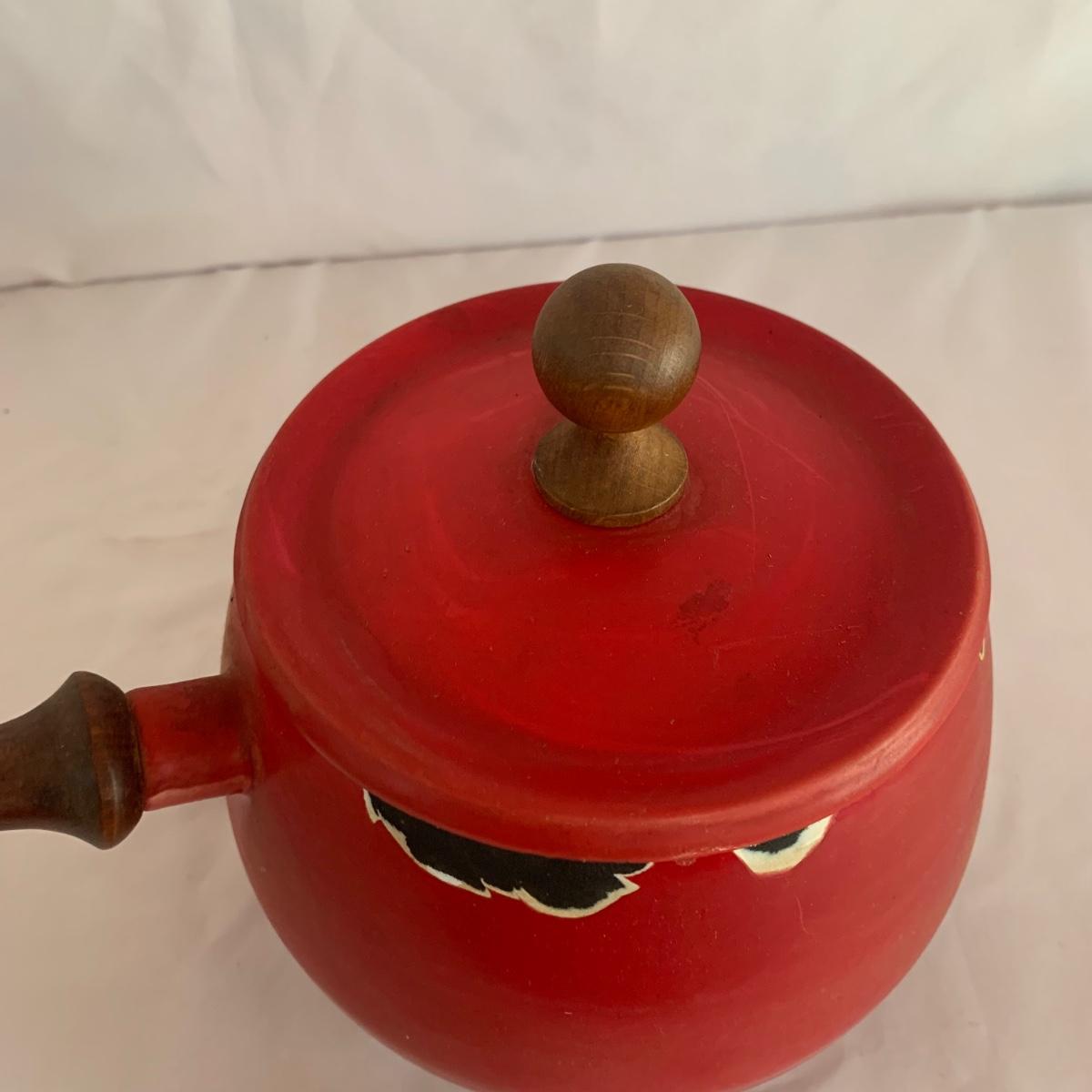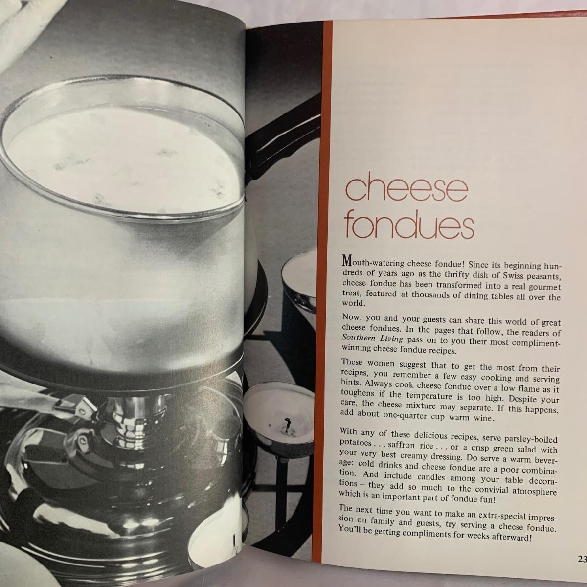 In this lot there are two vintage metal fondue pots, both powered by cooking fuel, as well as six fondue dipping forks with wood handles and Southern Living’s “The Fondue and Buffet Cookbook”. Both pots are metal with wooden handles. The copper colored pot sits on a metal stand. With the stand, this item measures approximately 10.5”d x 10”h (not including the side handle). The red enameled pot has a wood base with a metal stand. Both show some wear on their surfaces, but seem to be in good functional condition.