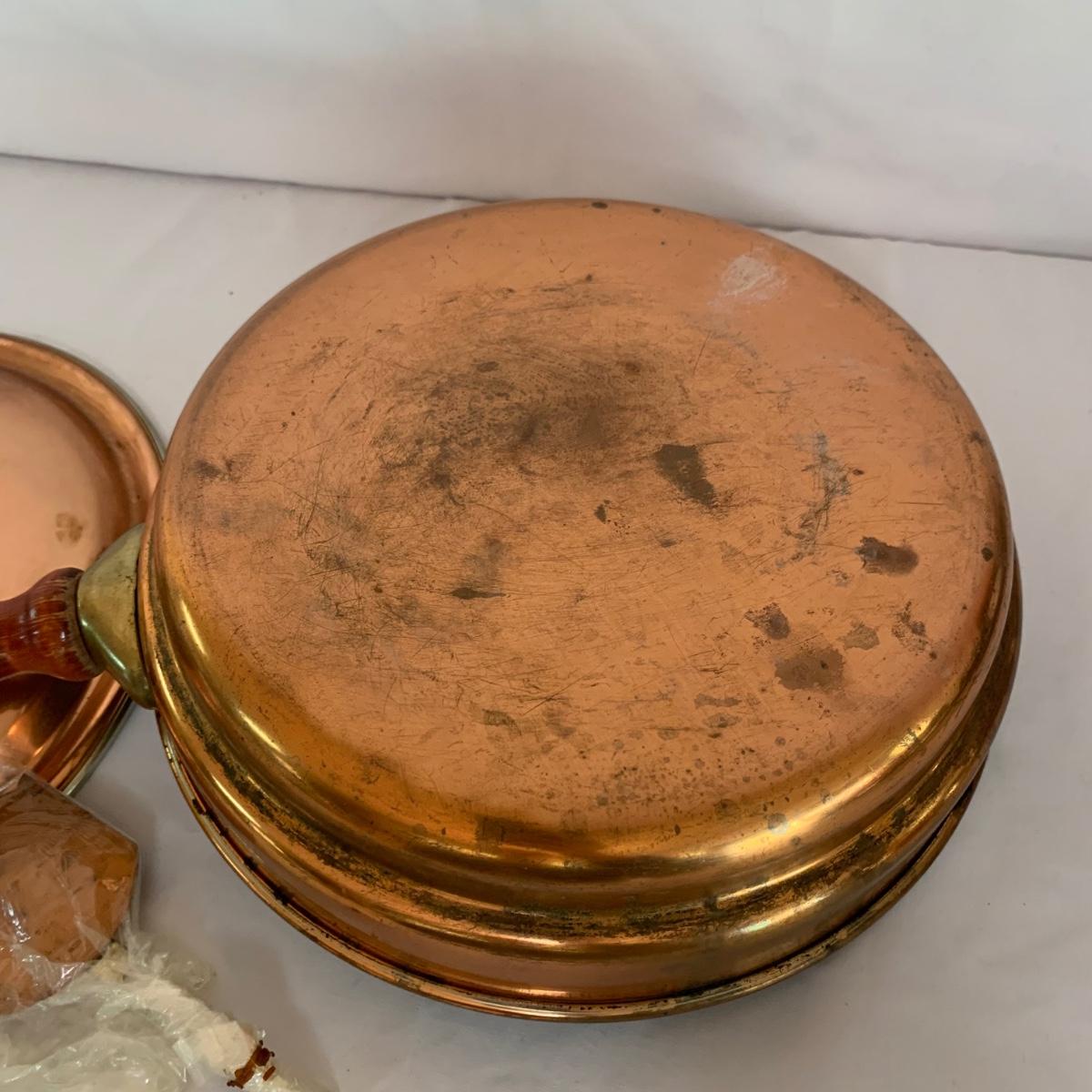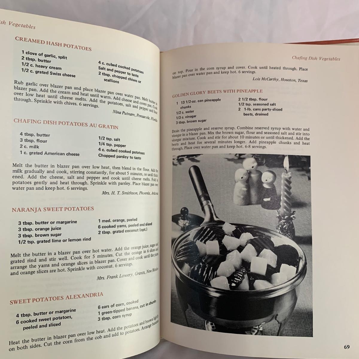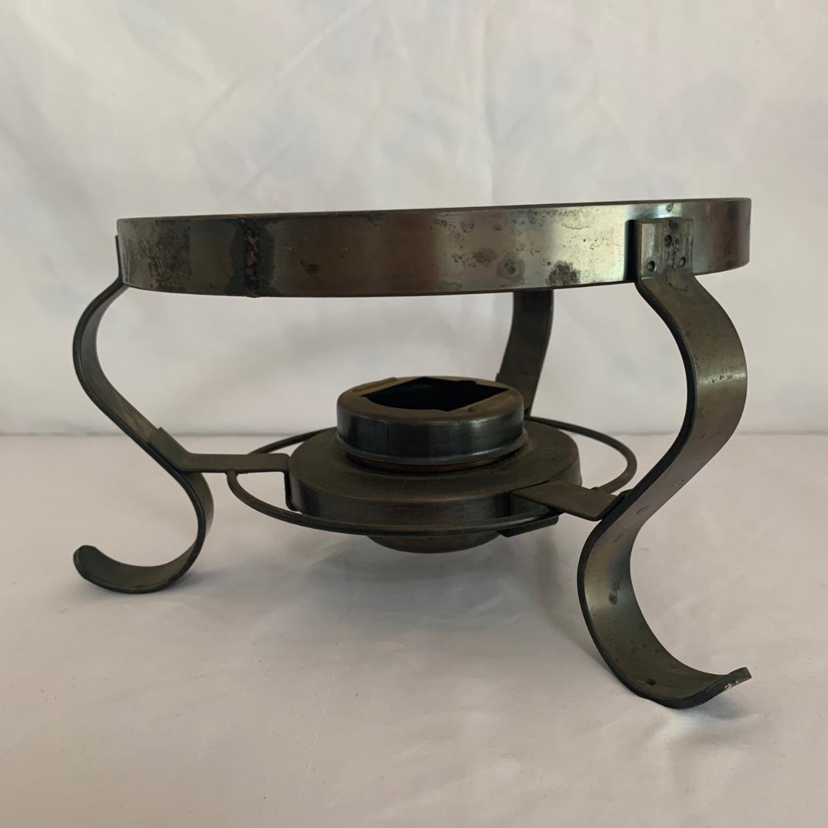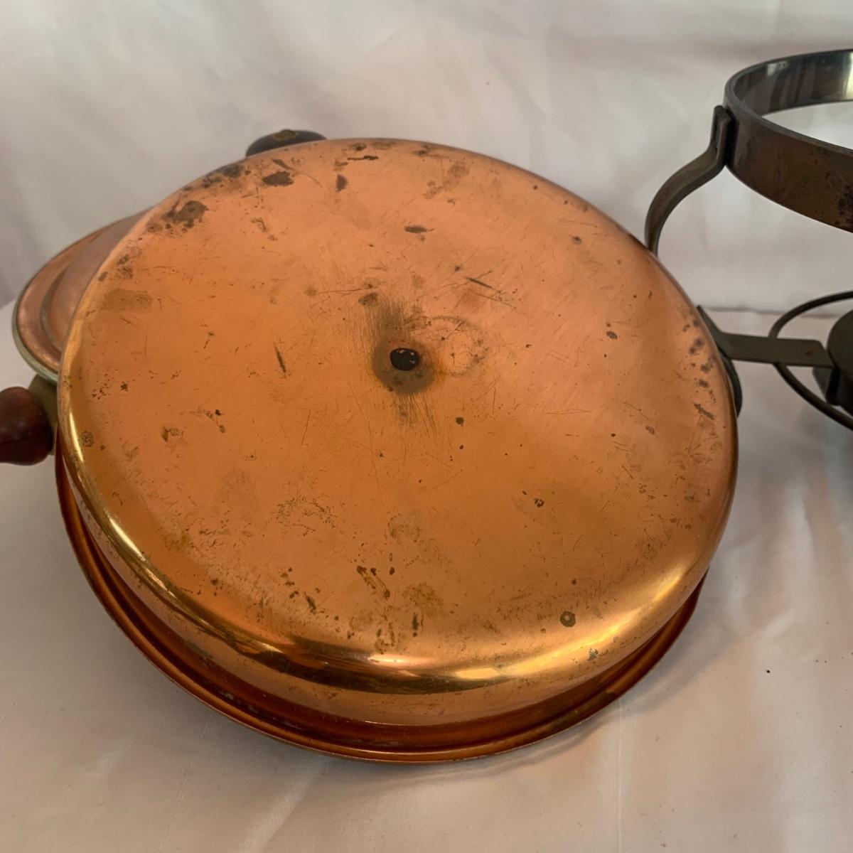In this lot there are two vintage metal fondue pots, both powered by cooking fuel, as well as six fondue dipping forks with wood handles and Southern Living’s “The Fondue and Buffet Cookbook”. Both pots are metal with wooden handles. The copper colored pot sits on a metal stand. With the stand, this item measures approximately 10.5”d x 10”h (not including the side handle). The red enameled pot has a wood base with a metal stand. Both show some wear on their surfaces, but seem to be in good functional condition.