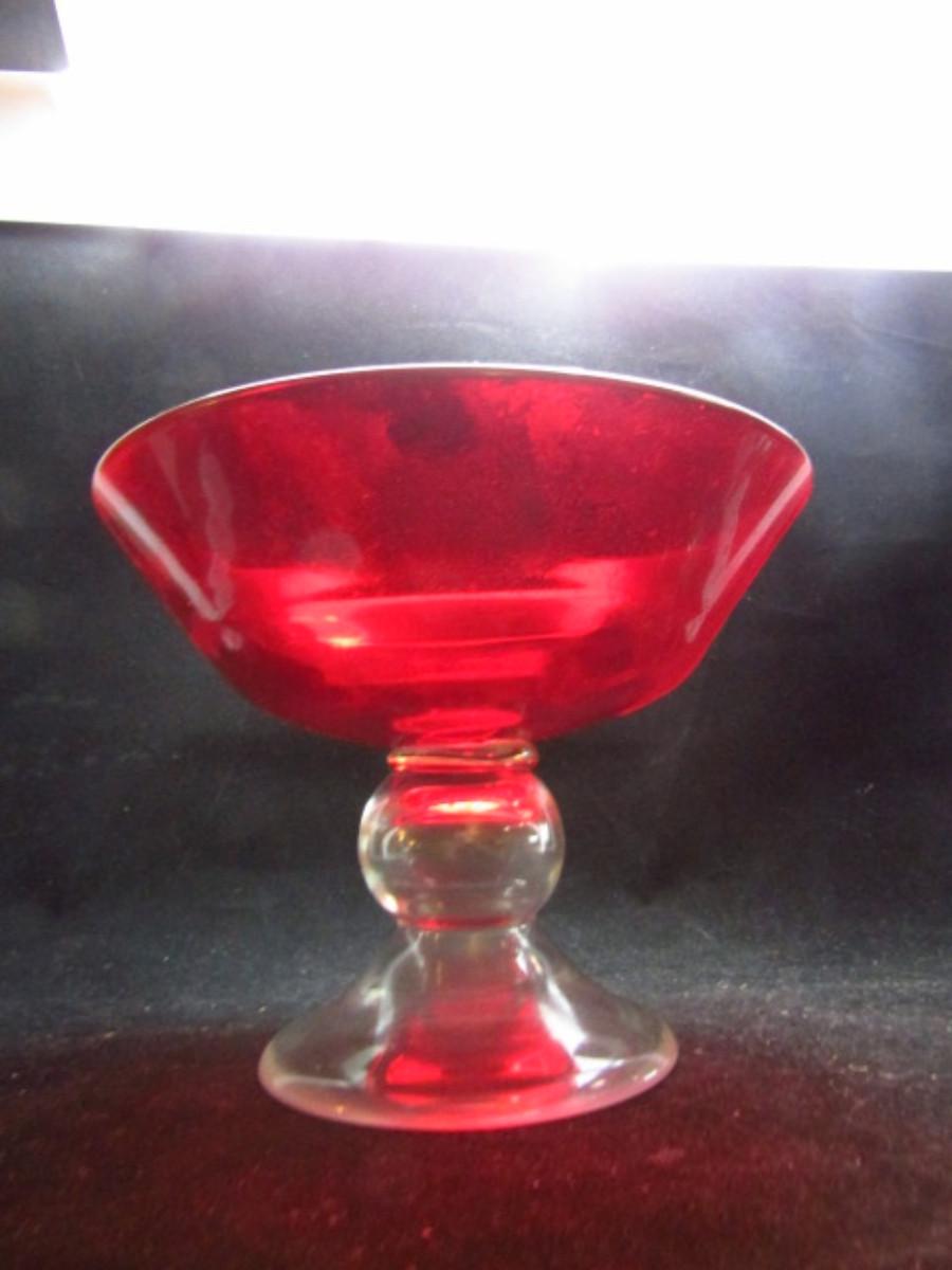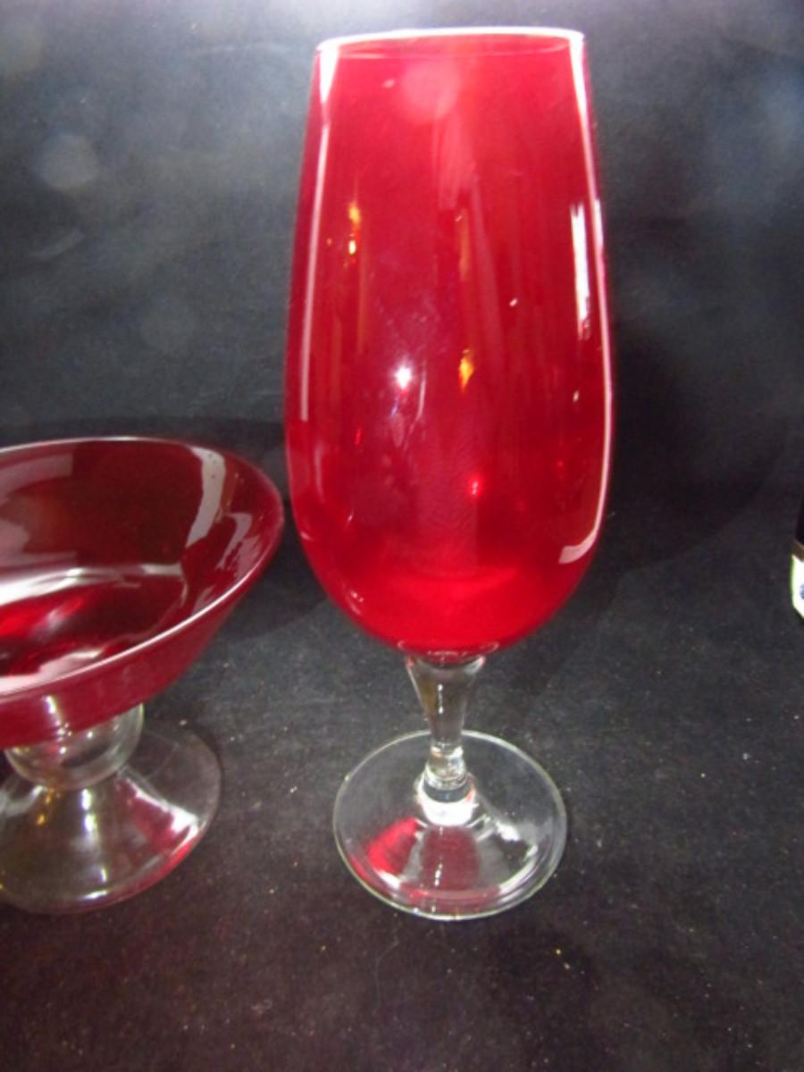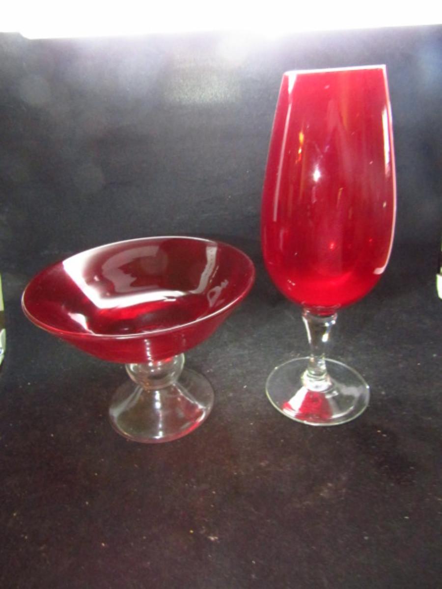 Two Footed Red Glass Pieces- Candy Dish and Vase (#504)