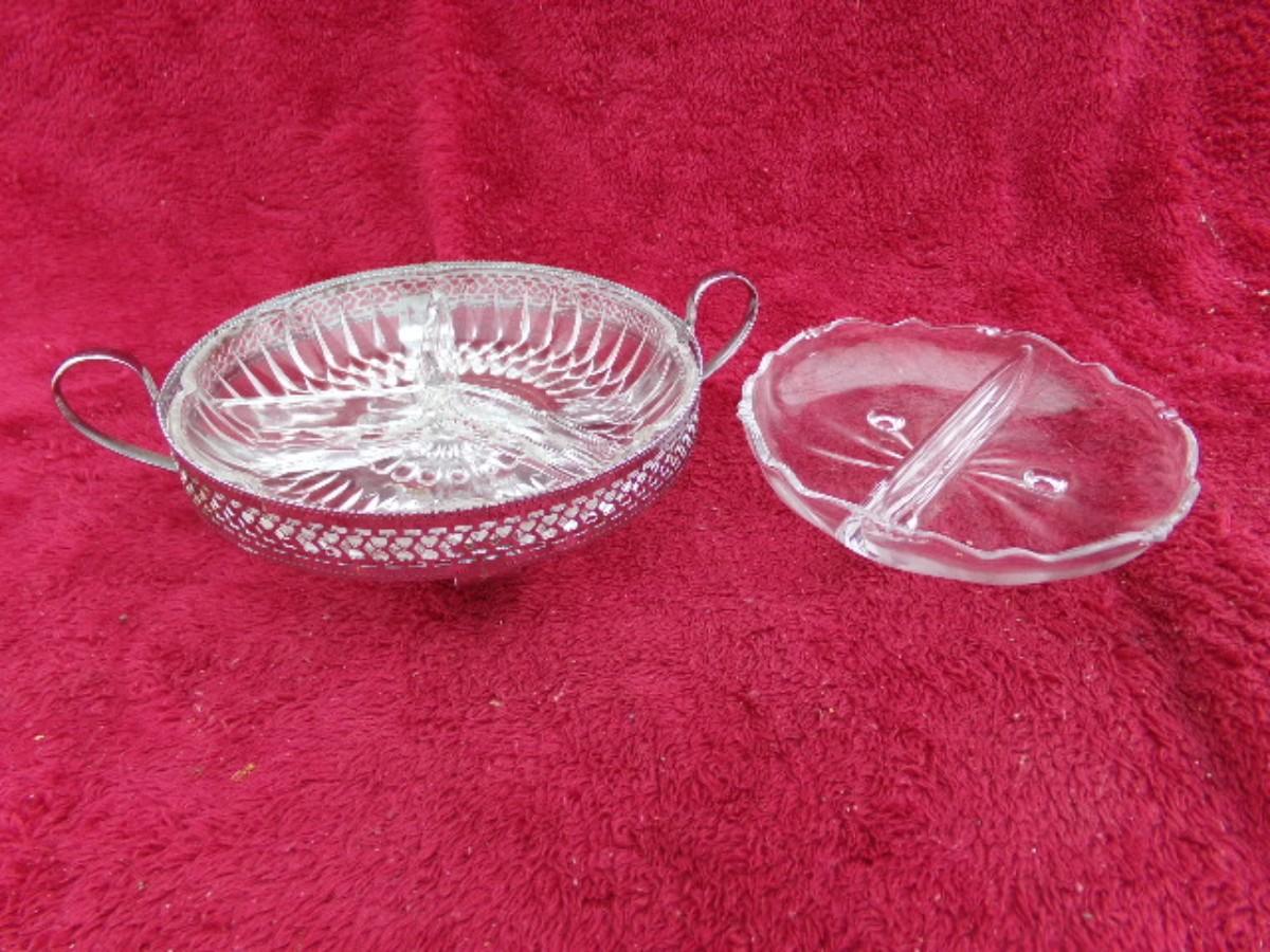 Two footed relish dishes. Larger one is 7-1/4" dia. and has 3 dividers and chromed metal frame w/handles. Smaller is about 6-1/4" dia. and has single divider & glass feet.