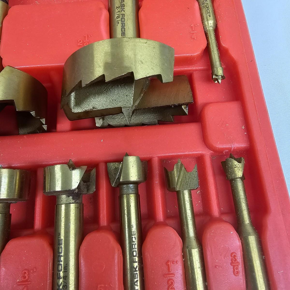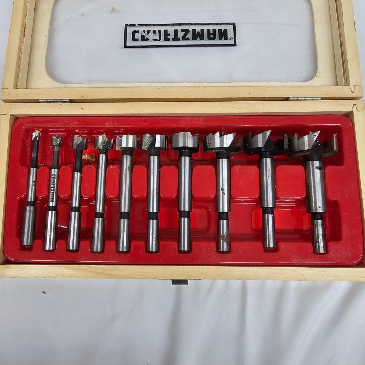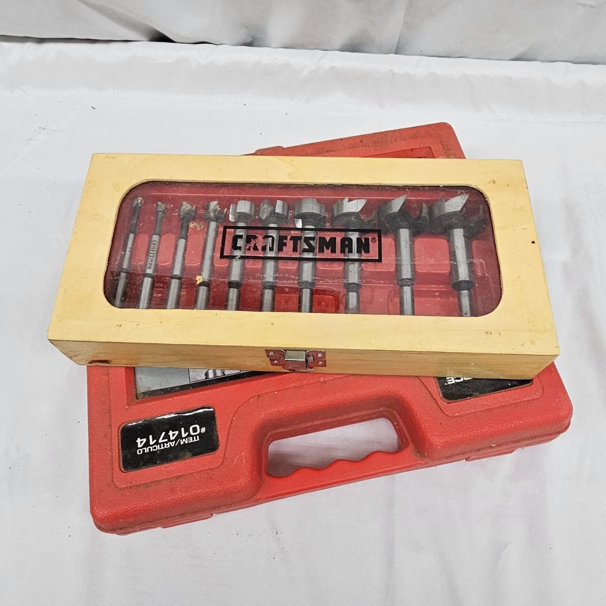 A set of ten and a set of sixteen forstner bits in protective cases. Work Force set appears to be brand new, bits run from 1/4" to 2 1/8". Craftsman bits go 1/4" to 1 1/2". See photos for details. Shipping available.