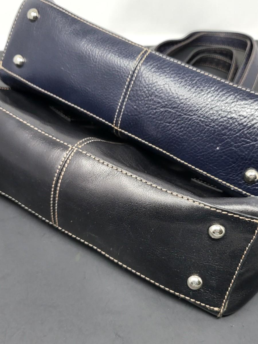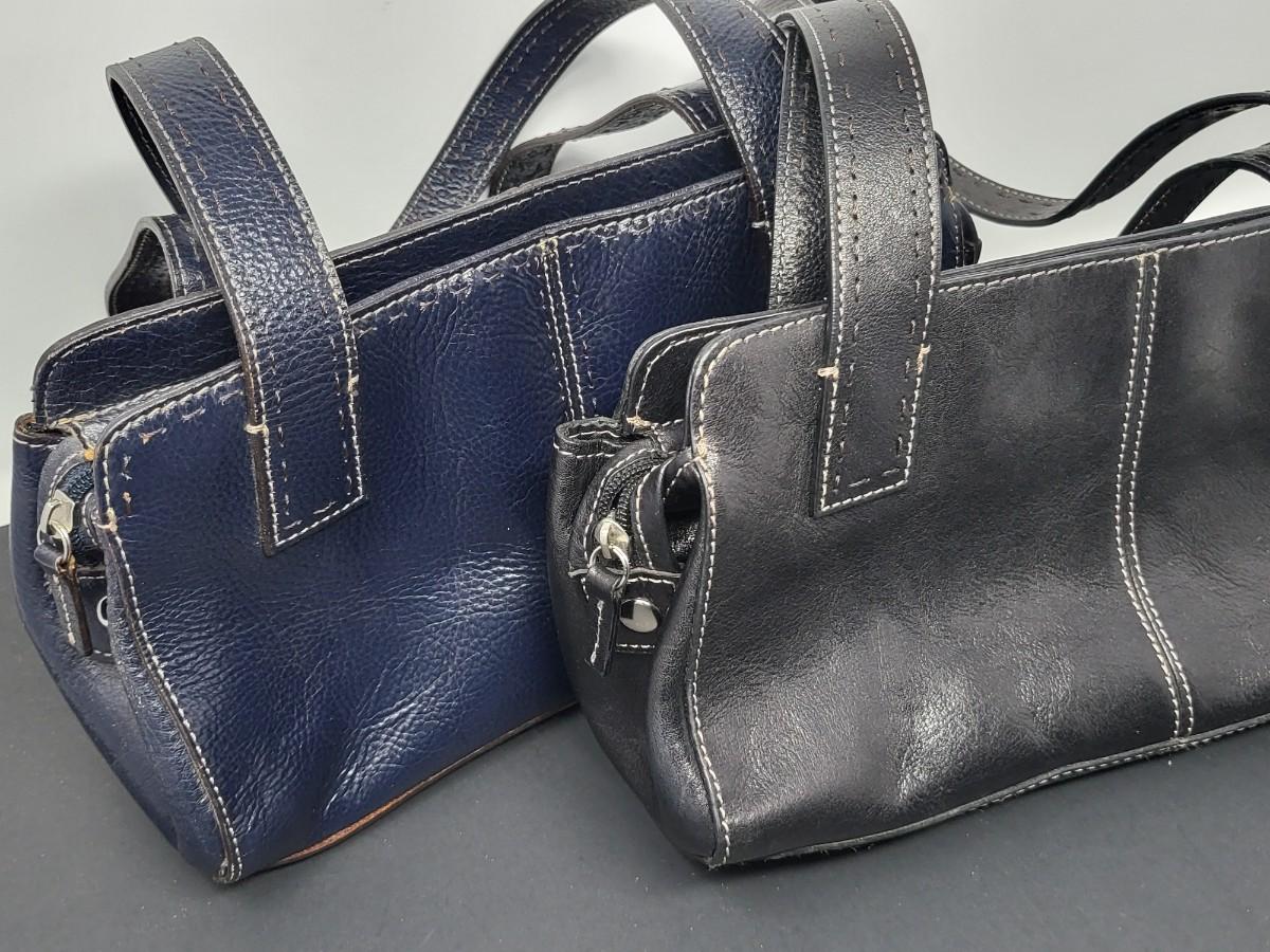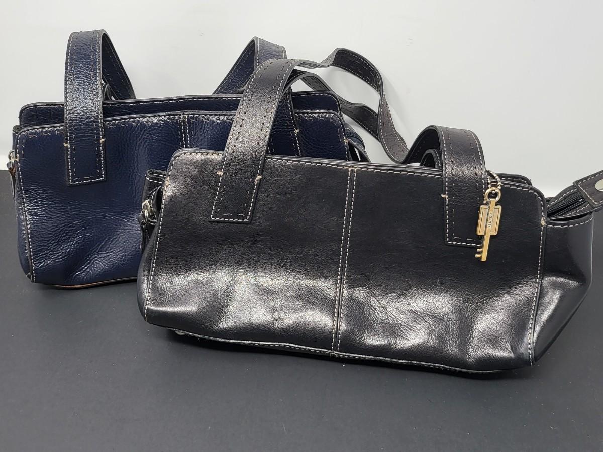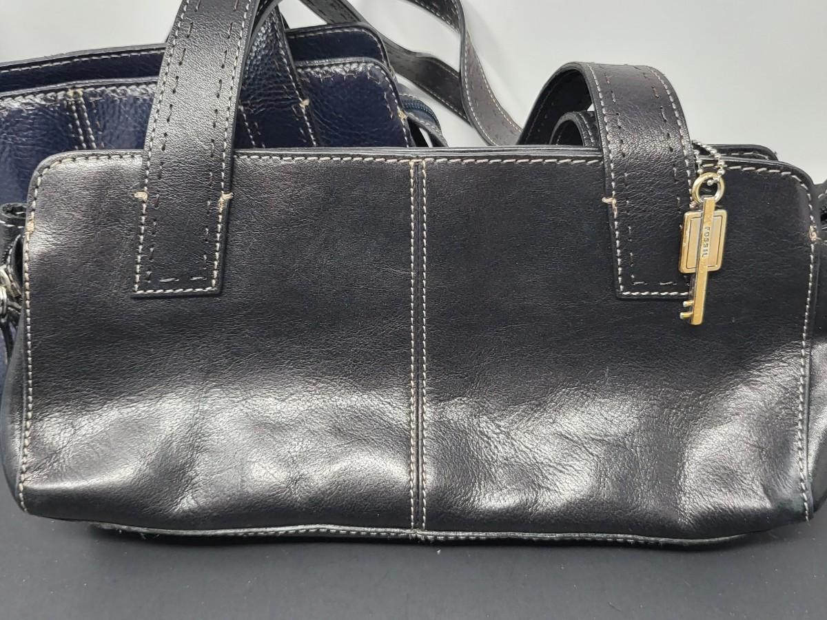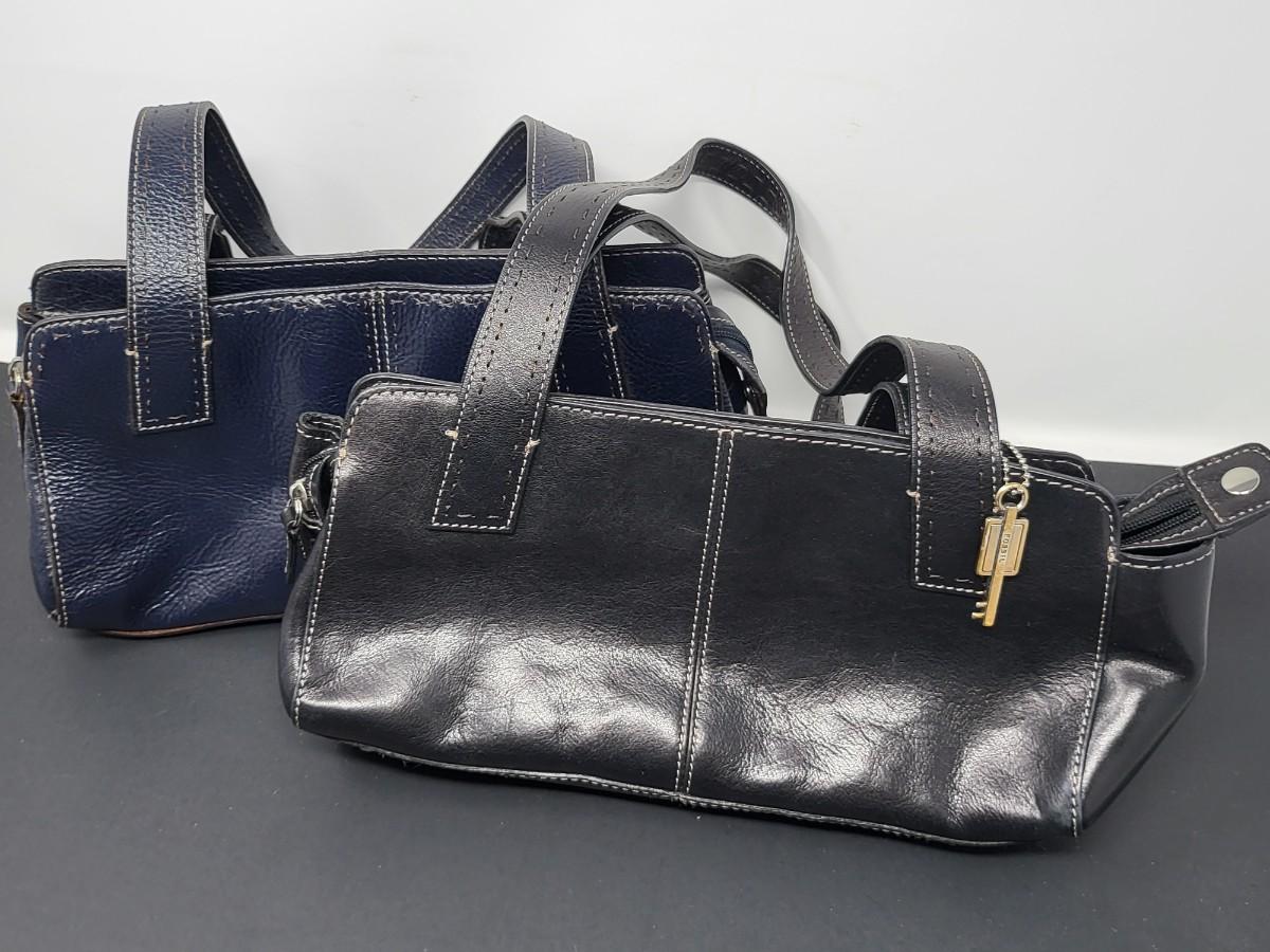 Leather bags, one navy blue, one black. Both are Fossil brand. They measure 11" x 6" x 3", and 10" double strap length.