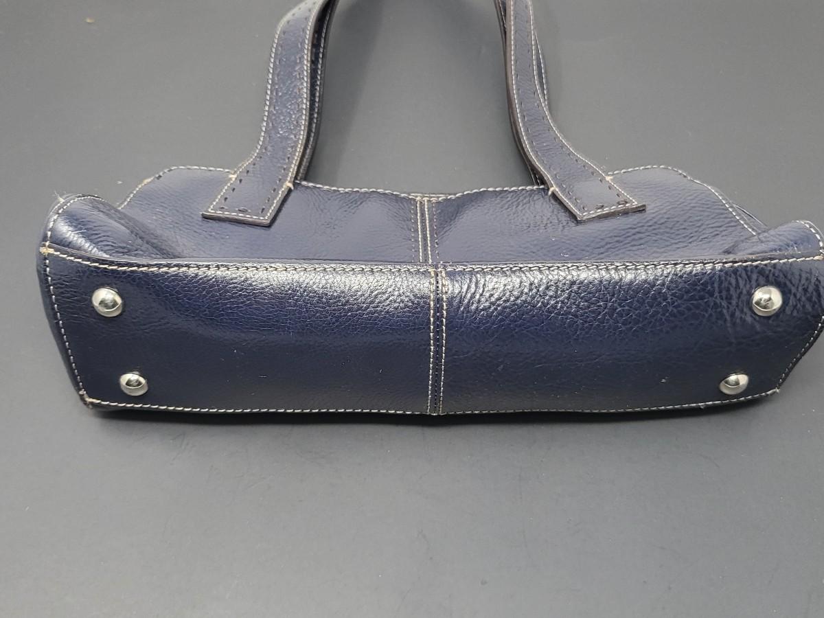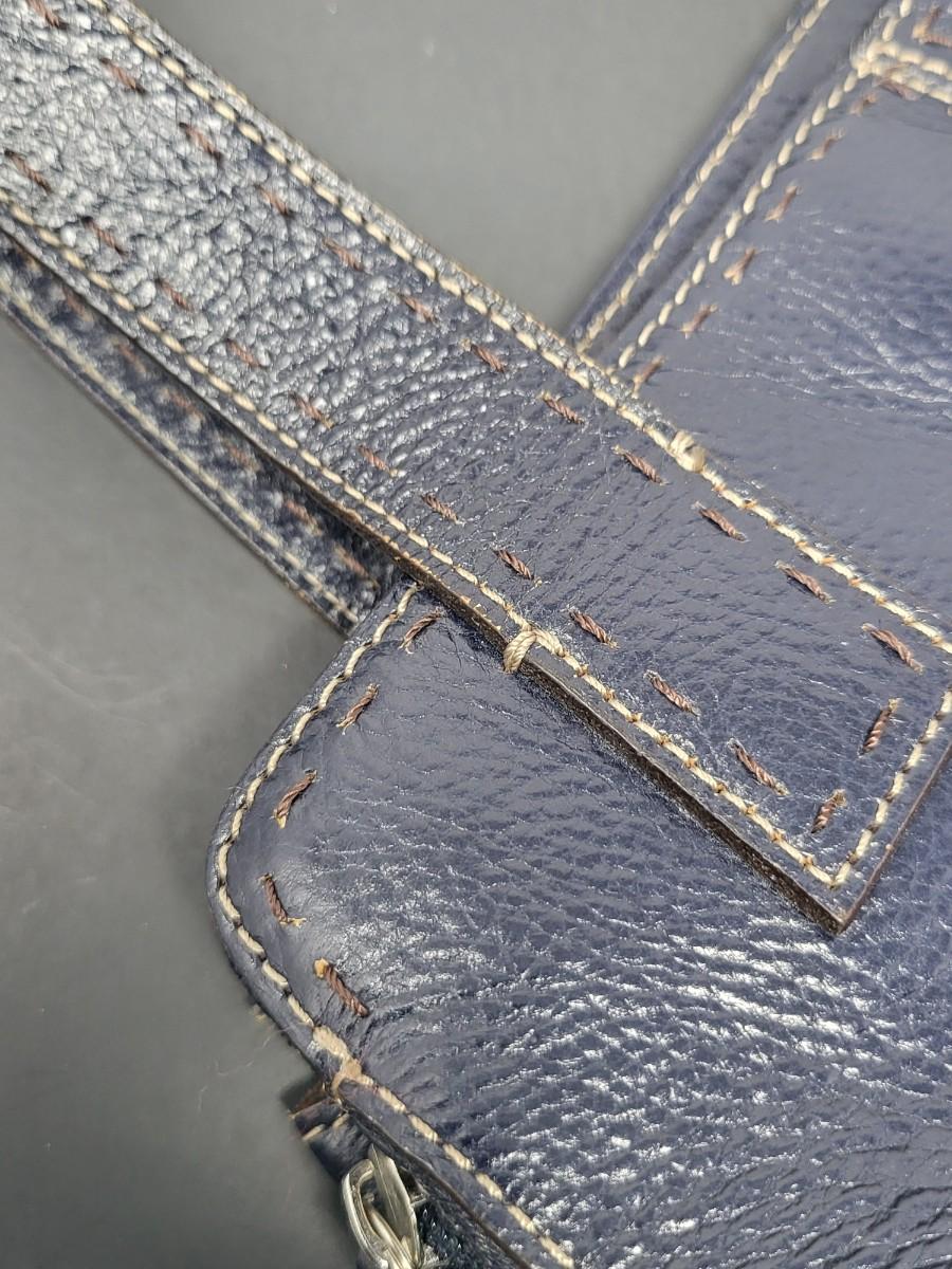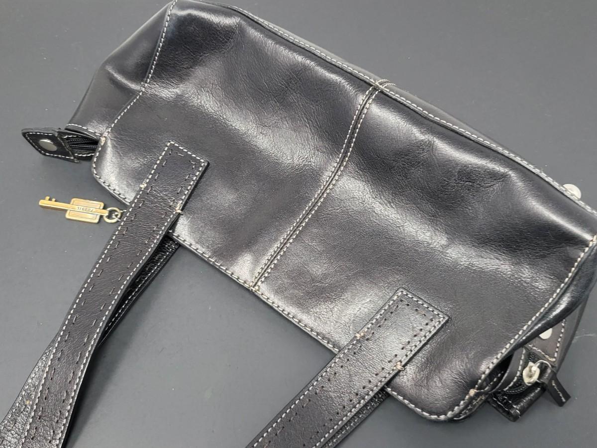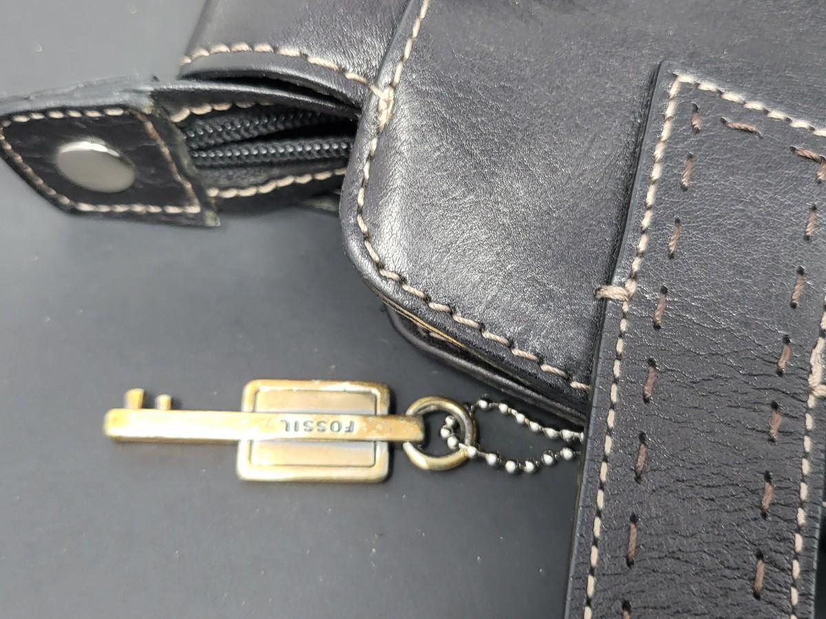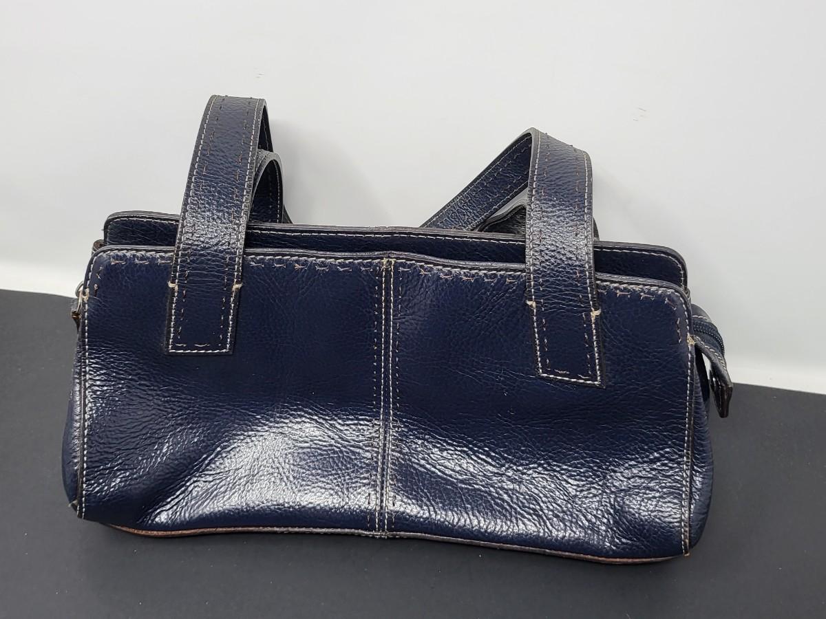 Leather bags, one navy blue, one black. Both are Fossil brand. They measure 11" x 6" x 3", and 10" double strap length.