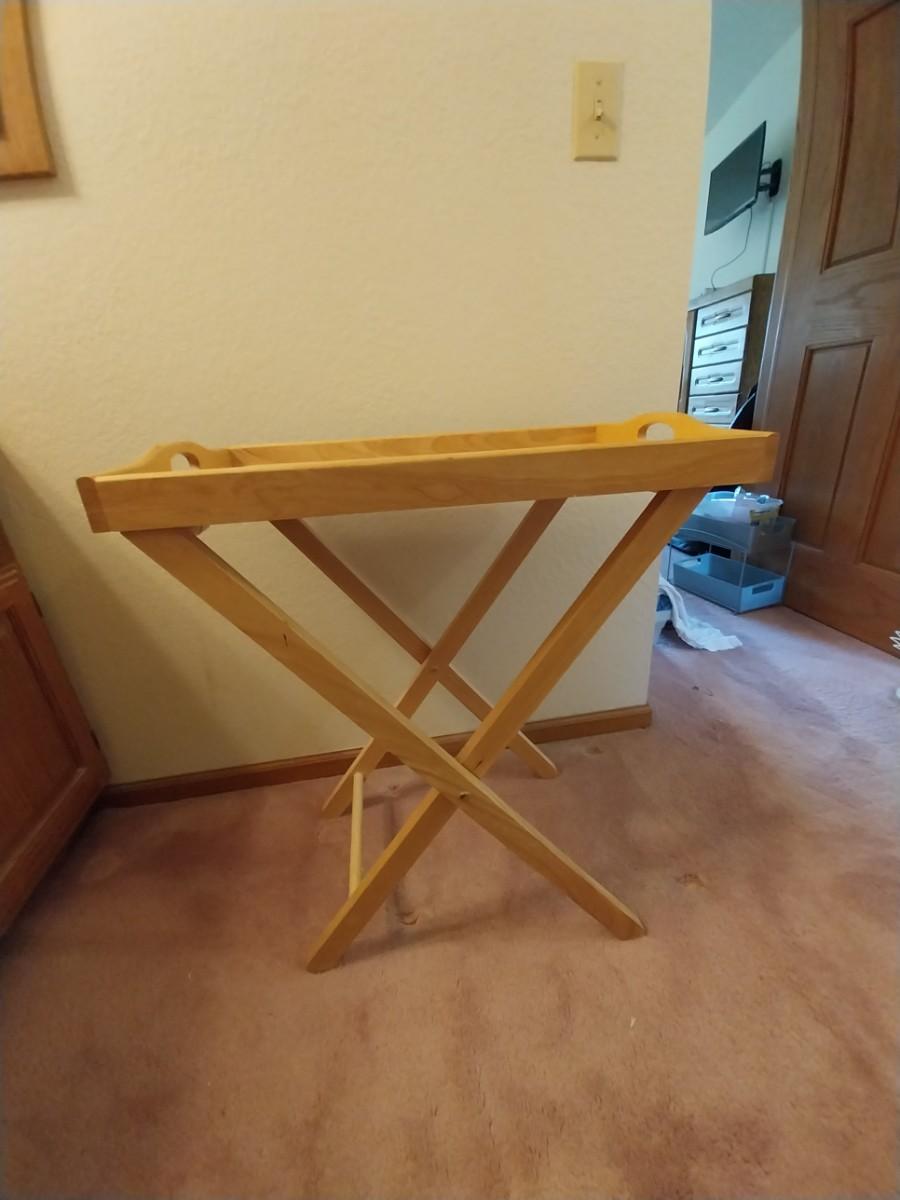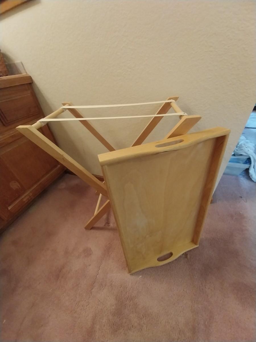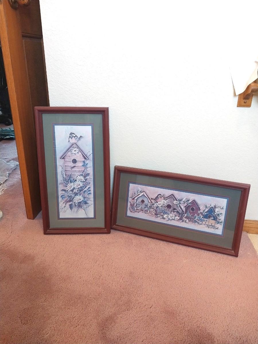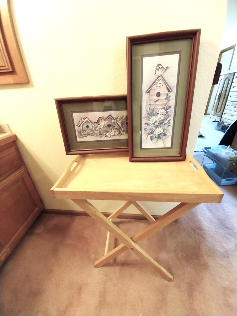 TWO FRAMED BIRD PICTURES AND WOODEN TRAY STAND