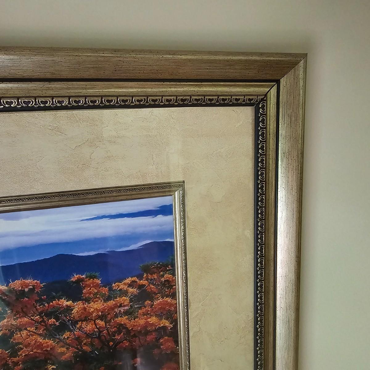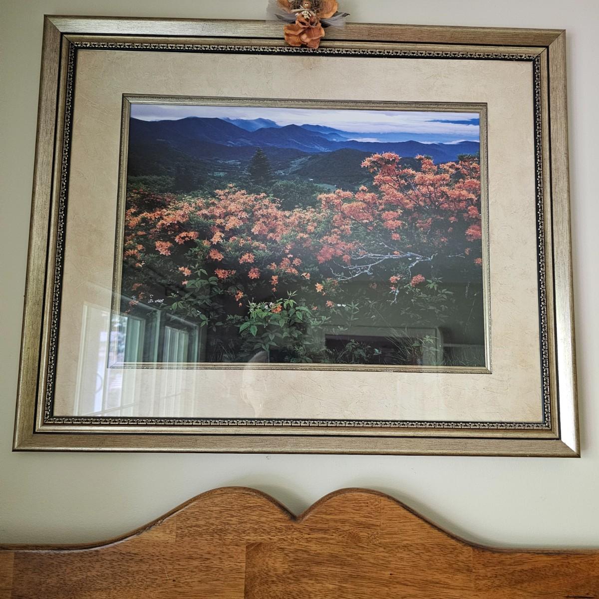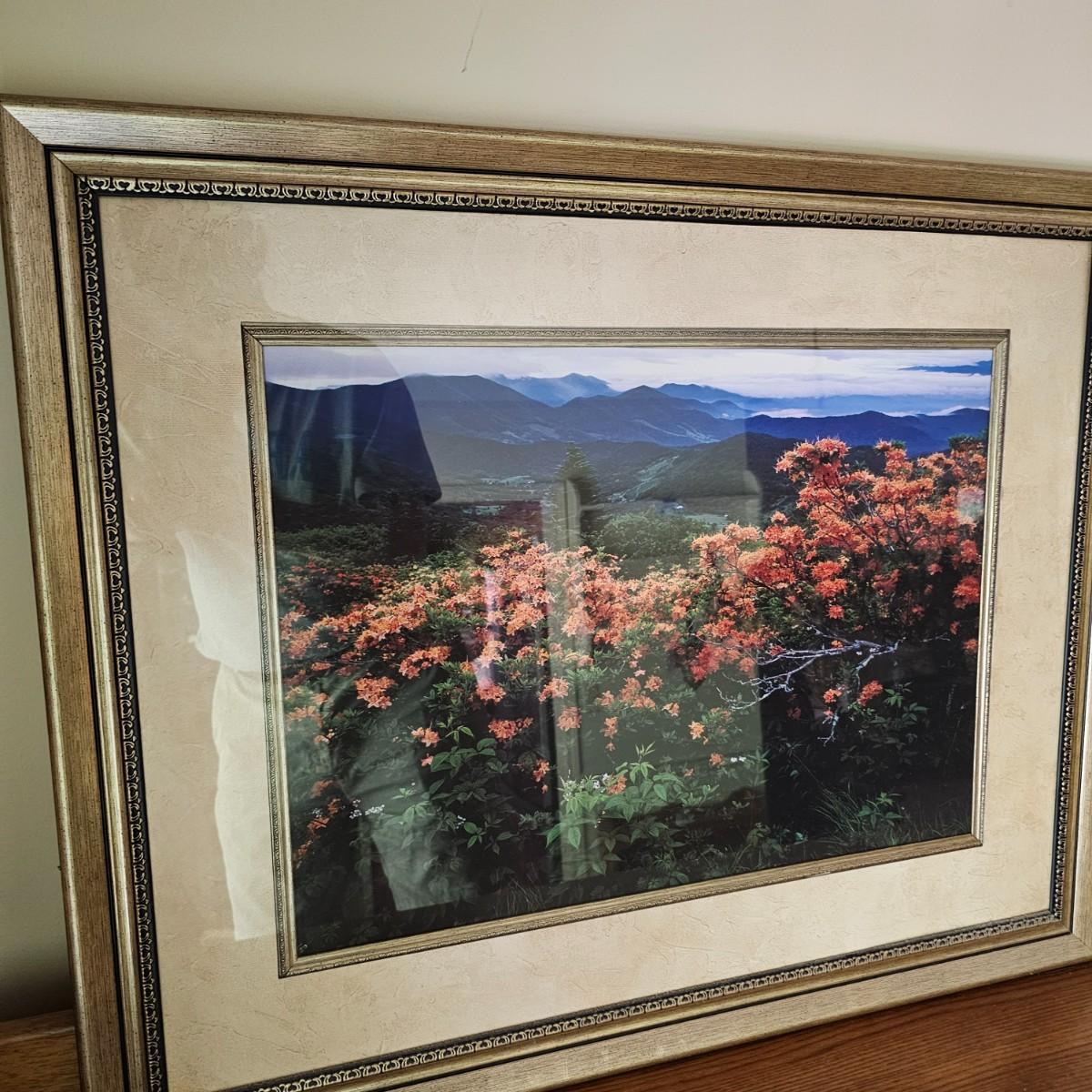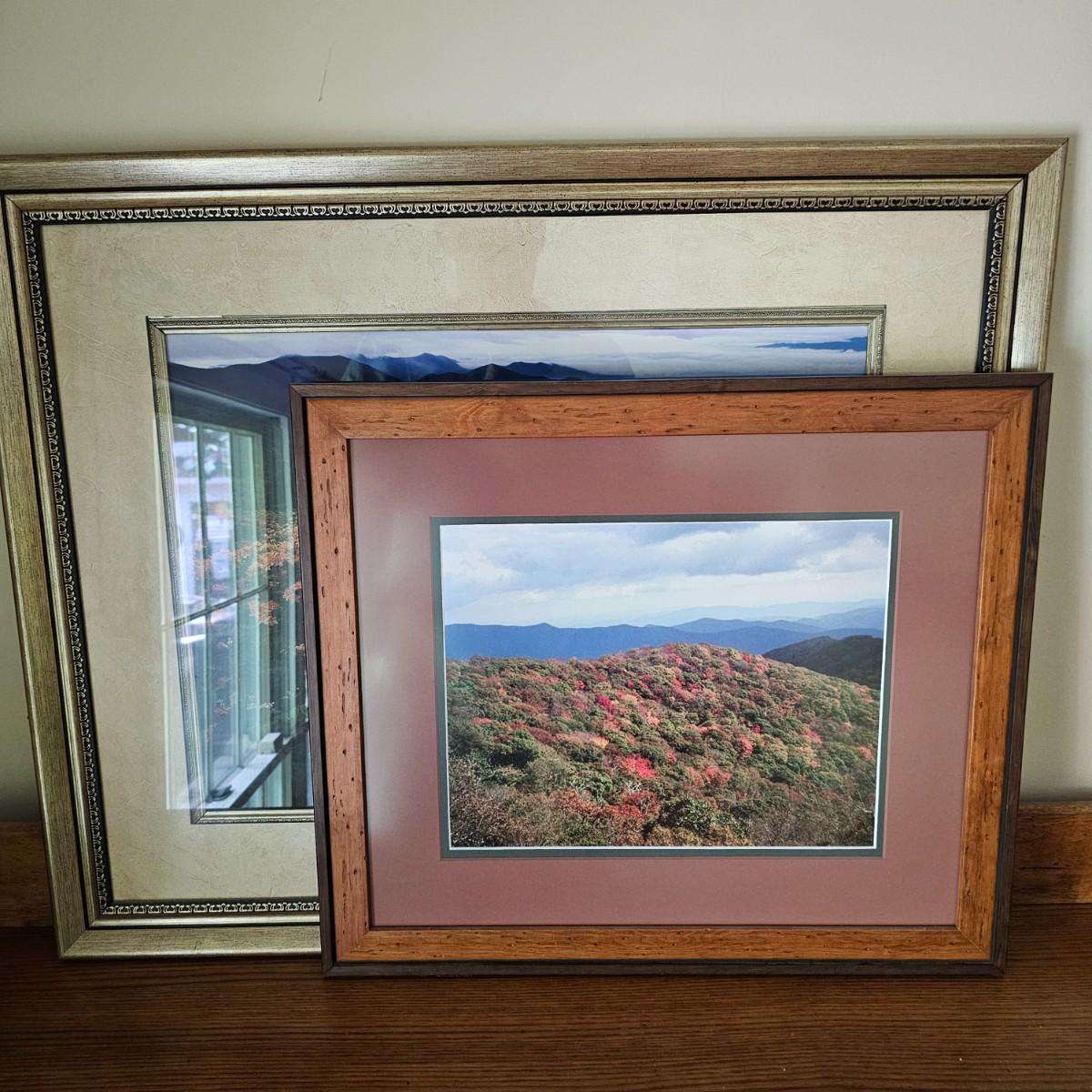 Two panoramic views of the Blue Ridge mountains captured in photo form. Majestic peaks and clouds in backgrounds and splendid color and flowers as well. Largest item measures 31.5" x 25.5"H, smaller piece is 22" x 19.5"H. See photos for details. Shipping available. Shipping can be costly. We suggest contacting our preferred local shipping provider, Postage Express, with dimensions and getting an estimate before bidding: (828) 255-9250 or shipping@postageexpressnc.com.