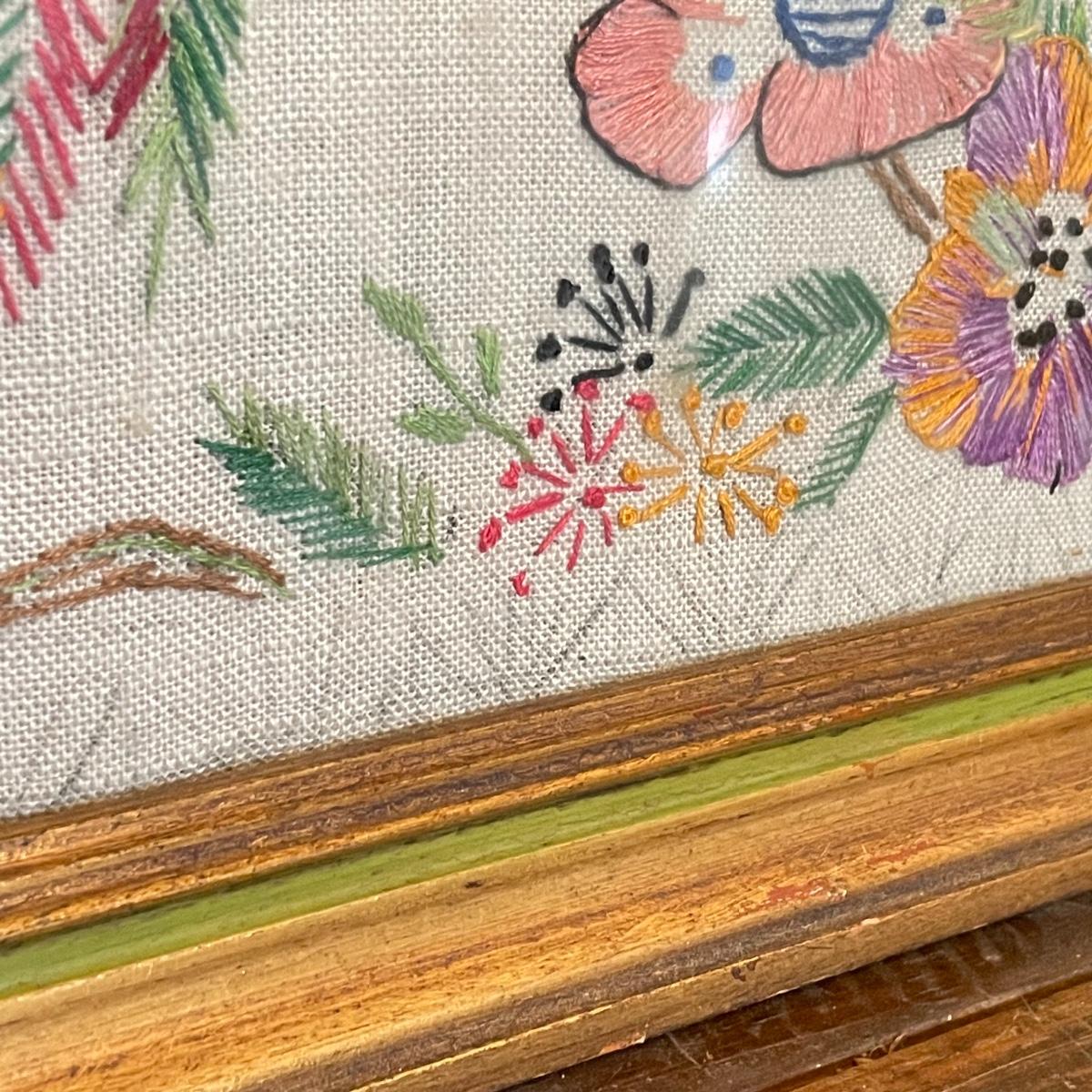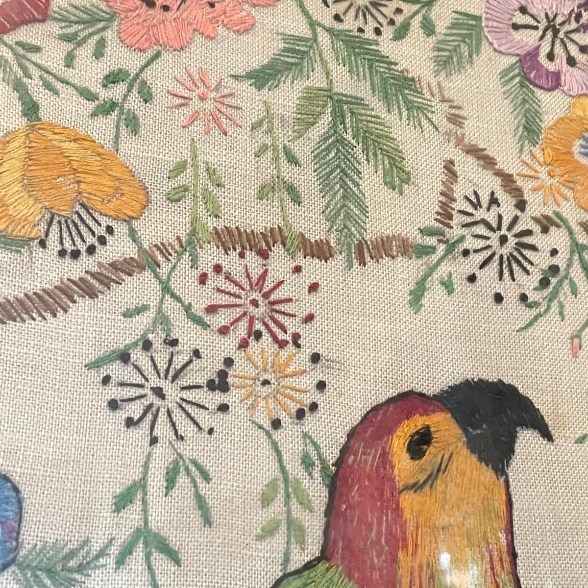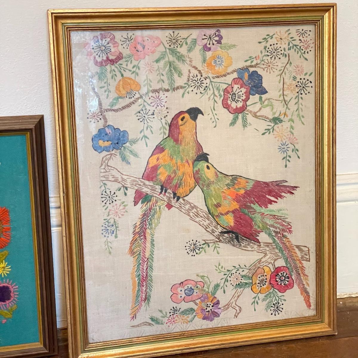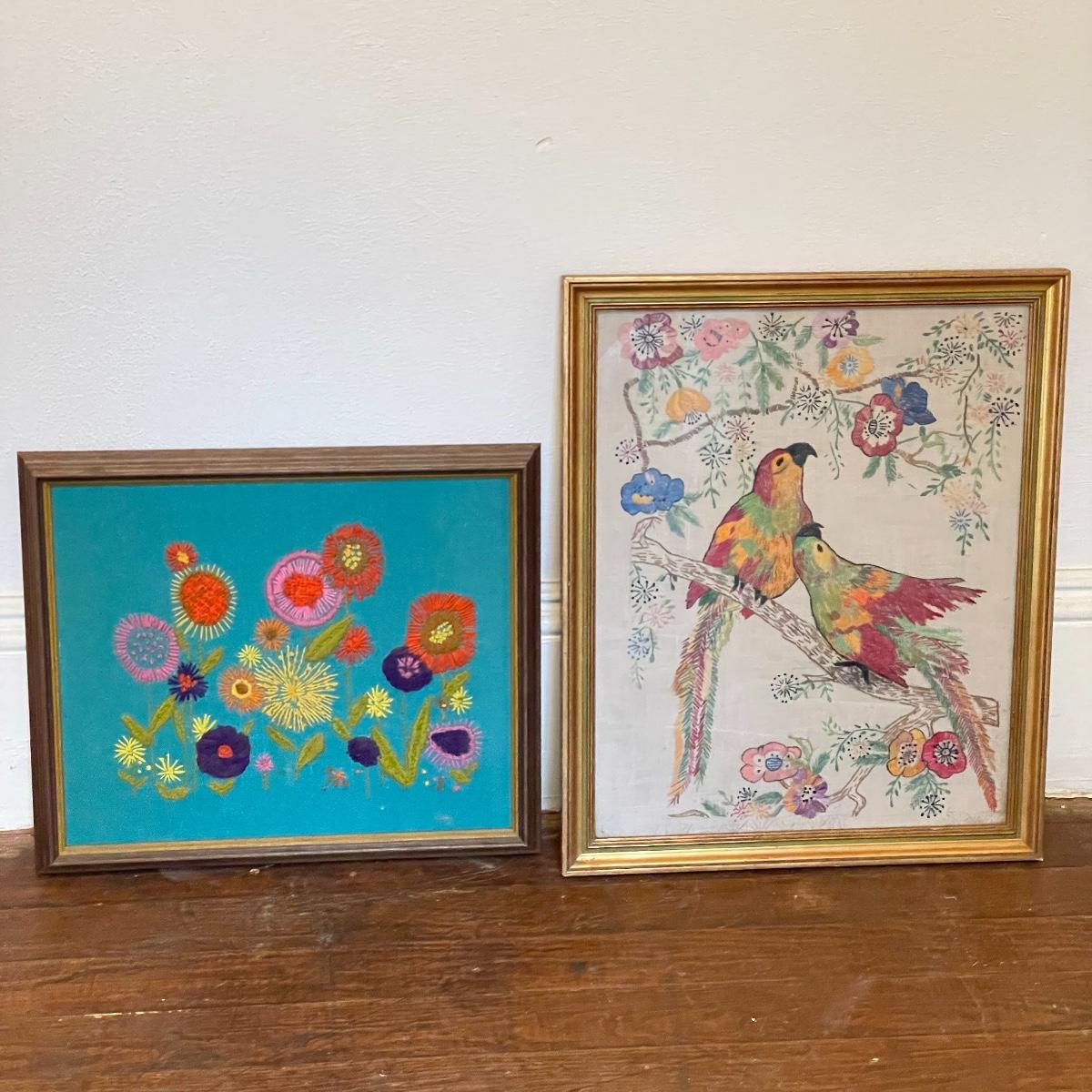 Two pieces of embroidery art in wooden frames. The teal floral art sits in a 18.75” x 15.5” frame with open air, no glass. The bird art has a glass panel and measures 18.25” x 22.25”. See images. Local pick up only.