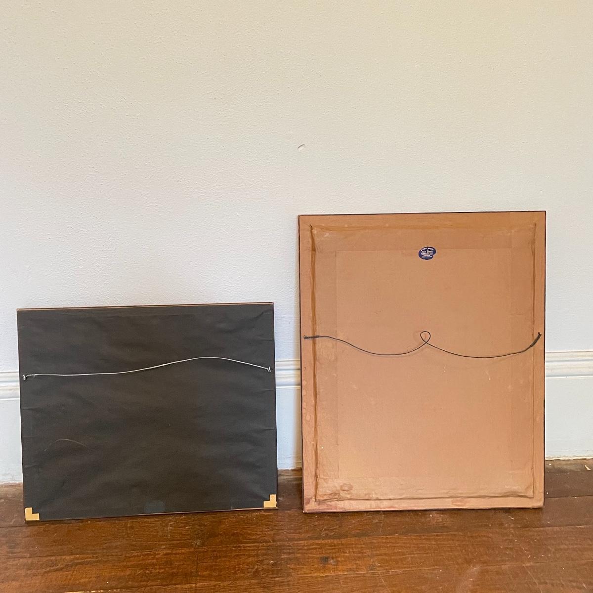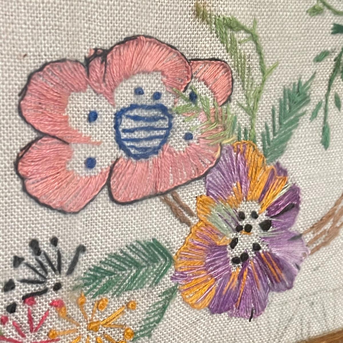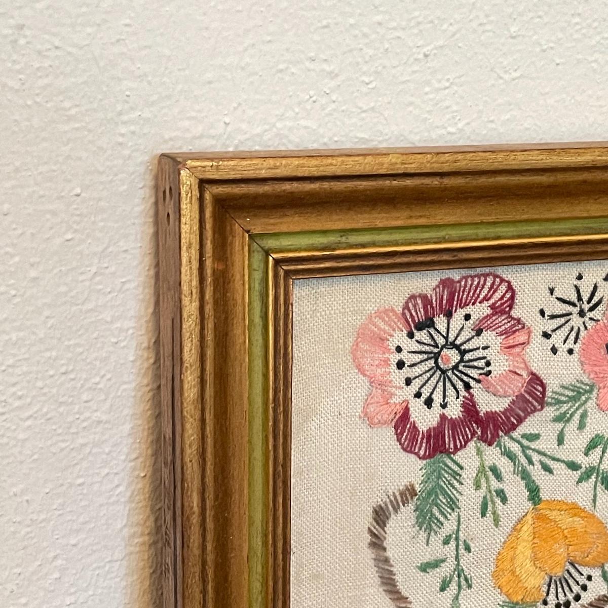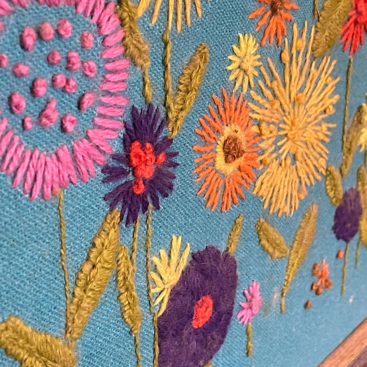 Two pieces of embroidery art in wooden frames. The teal floral art sits in a 18.75” x 15.5” frame with open air, no glass. The bird art has a glass panel and measures 18.25” x 22.25”. See images. Local pick up only.
