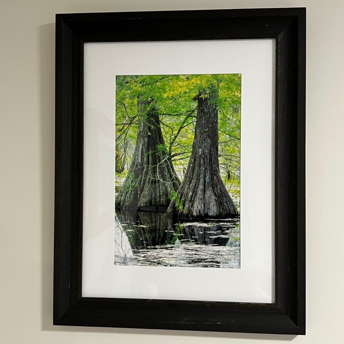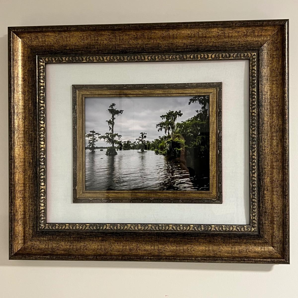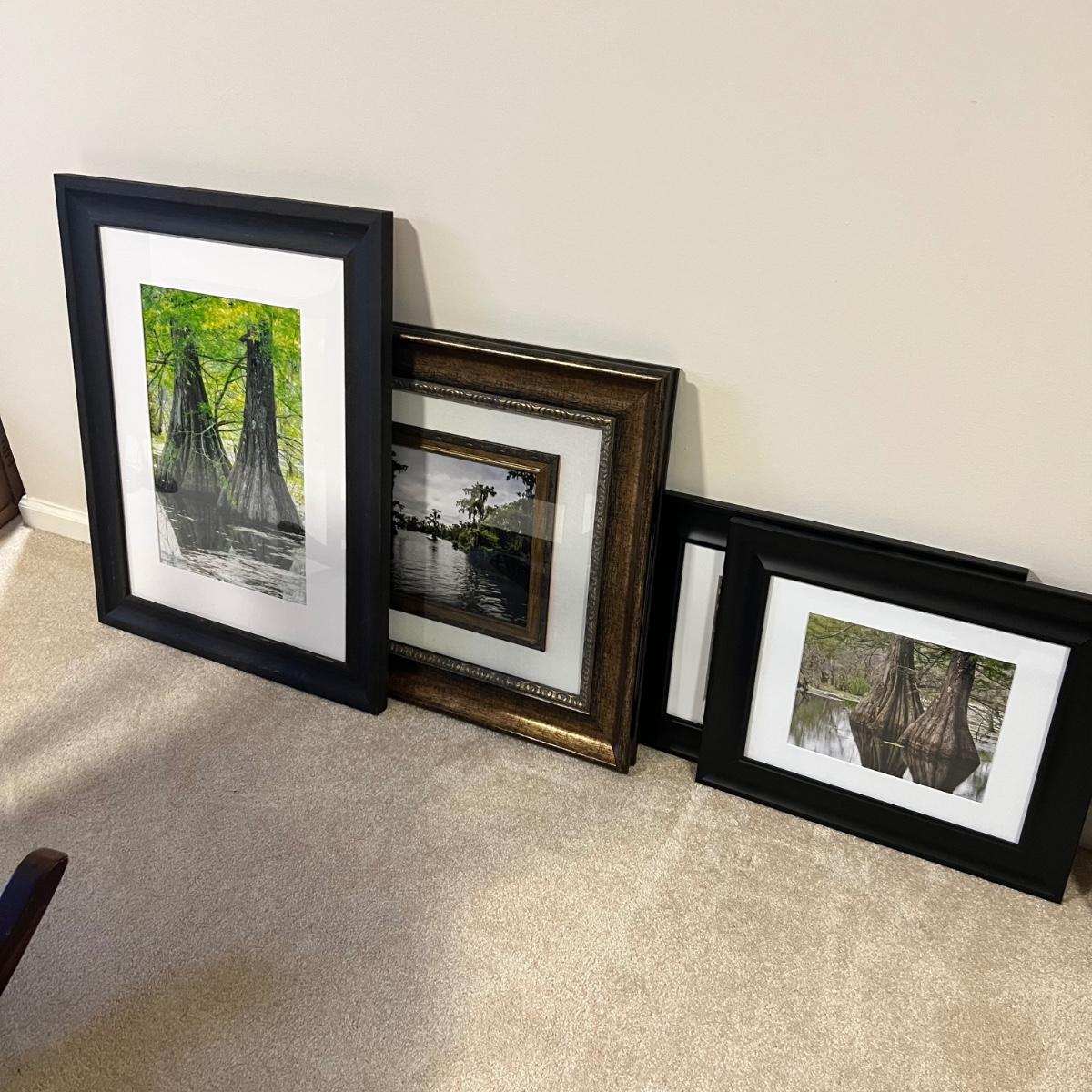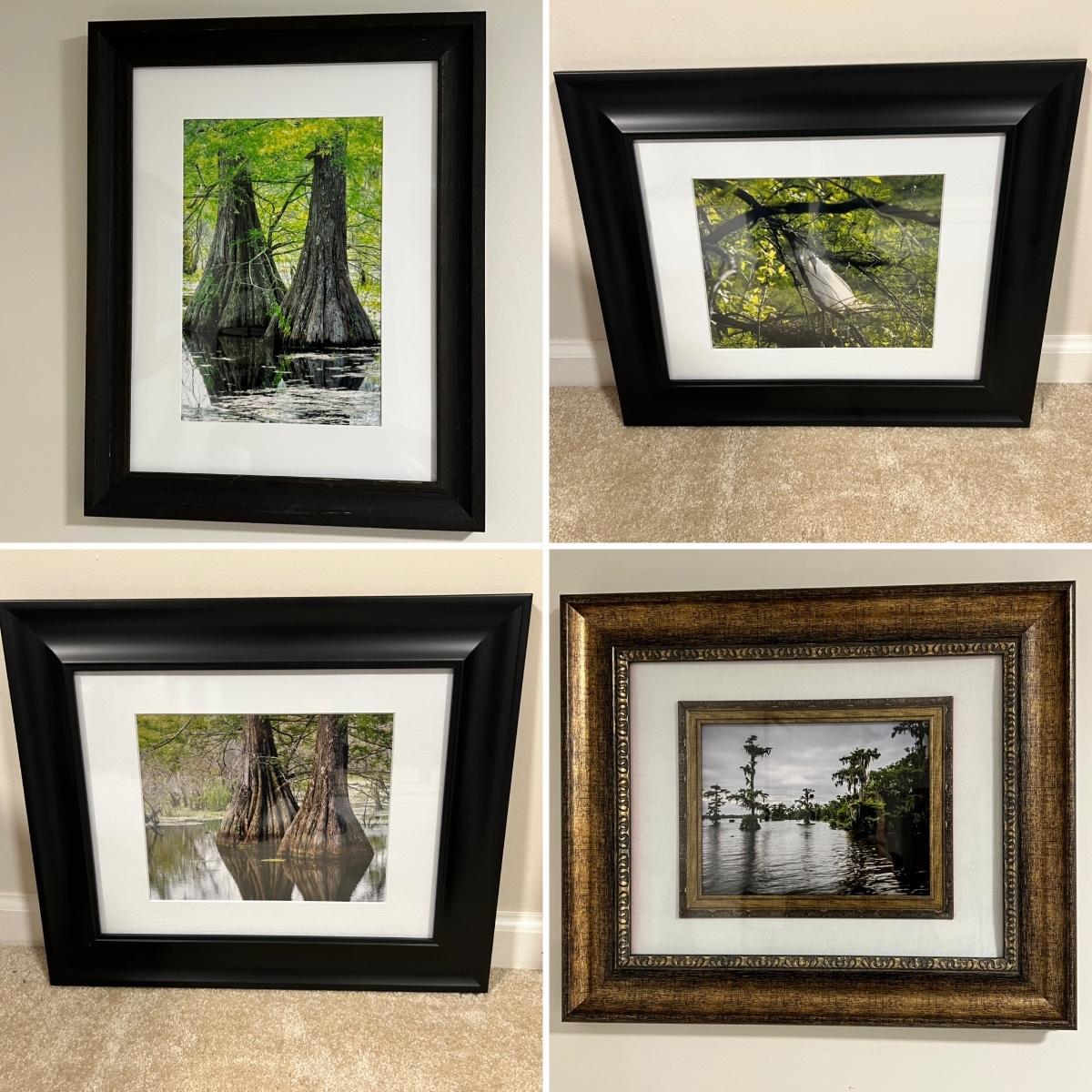 These four framed photographs were taken by the owner of this estate and feature swampy landscape scenes. Three of the photographs are mounted in simple black wood frames. The other frame is more ornate, made from a resin type material with an aged bronze finish. All photographs are under glass.