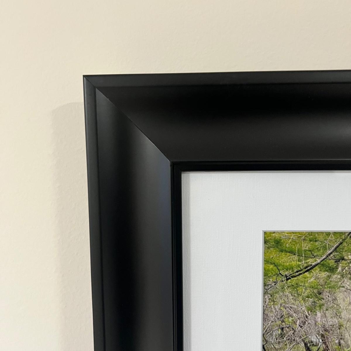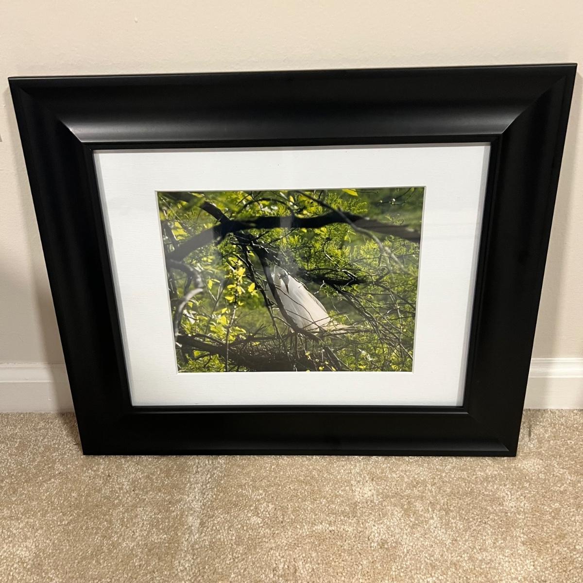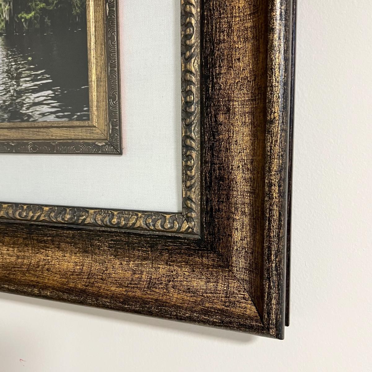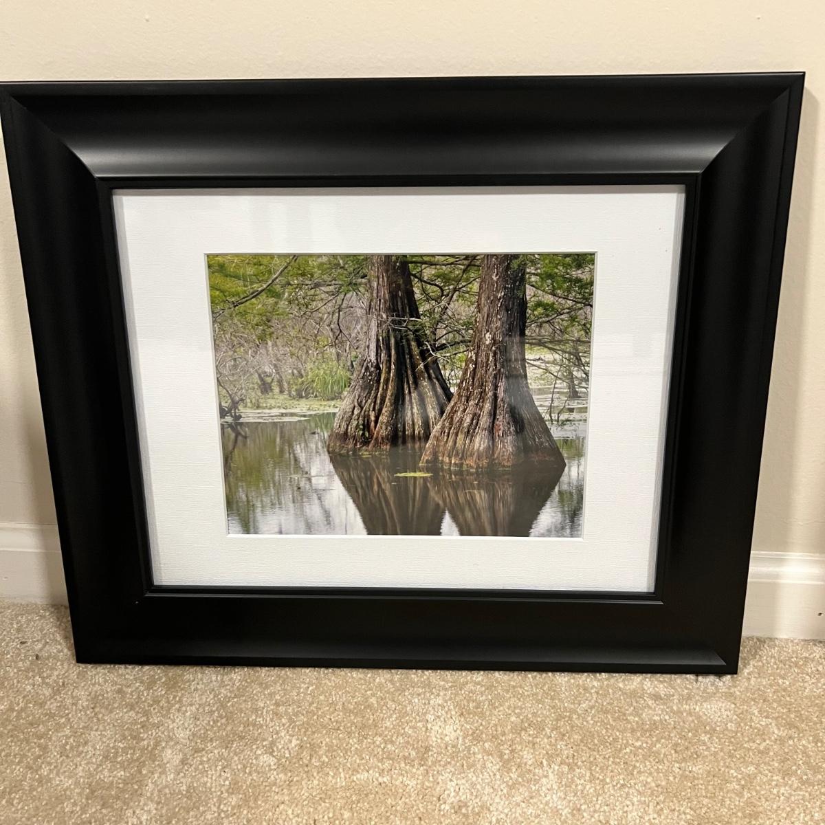 These four framed photographs were taken by the owner of this estate and feature swampy landscape scenes. Three of the photographs are mounted in simple black wood frames. The other frame is more ornate, made from a resin type material with an aged bronze finish. All photographs are under glass.
