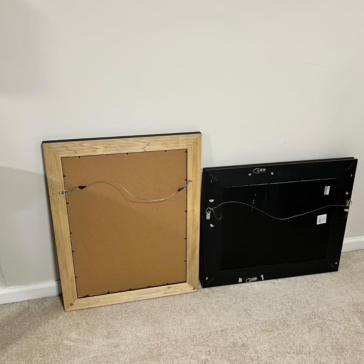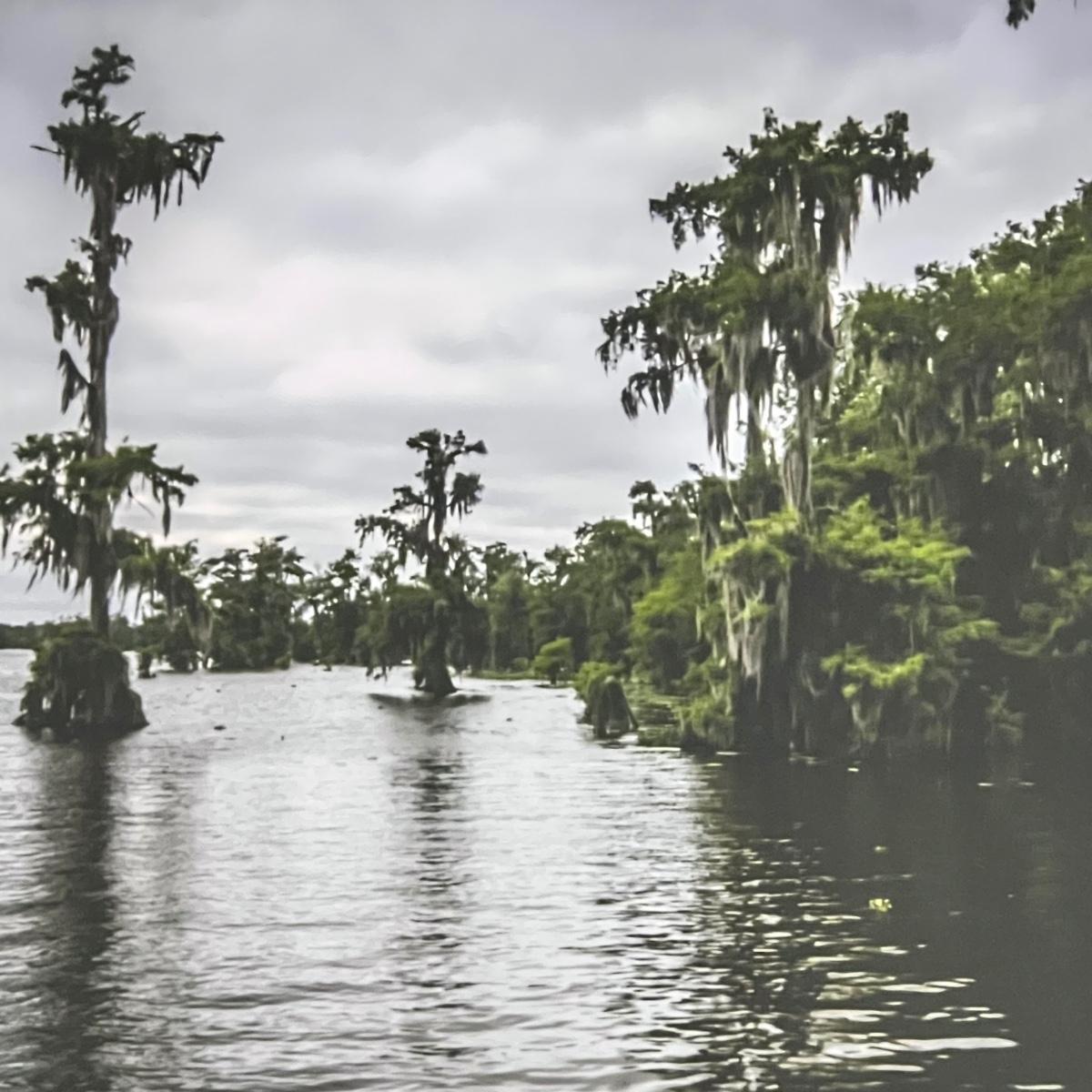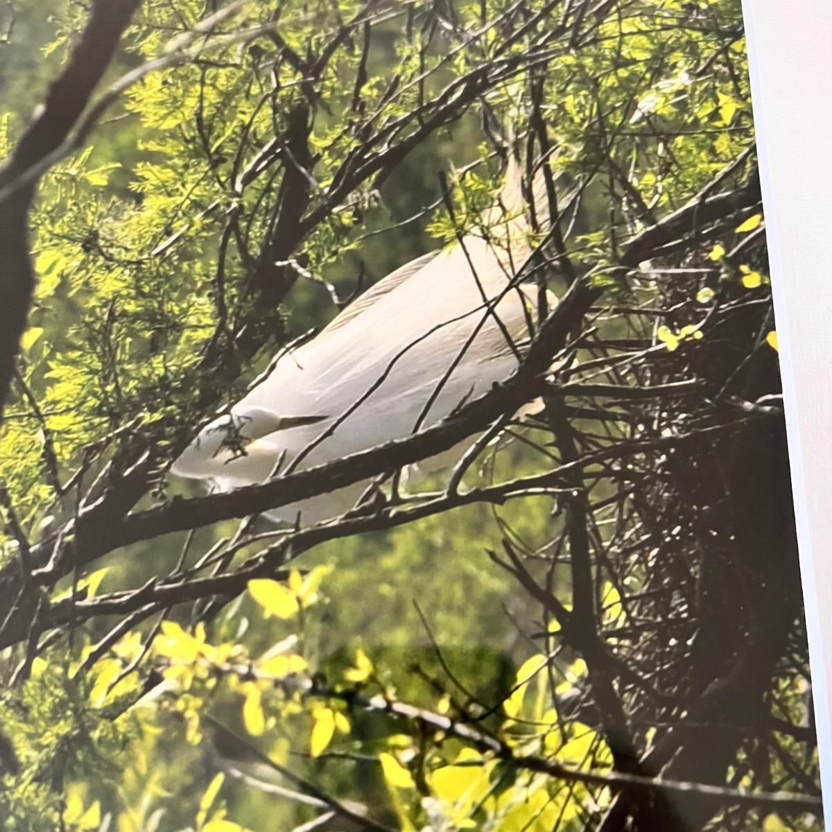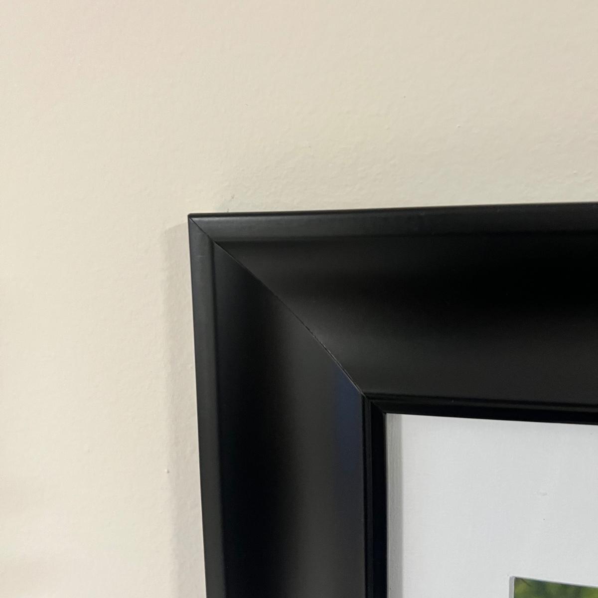 These four framed photographs were taken by the owner of this estate and feature swampy landscape scenes. Three of the photographs are mounted in simple black wood frames. The other frame is more ornate, made from a resin type material with an aged bronze finish. All photographs are under glass.